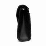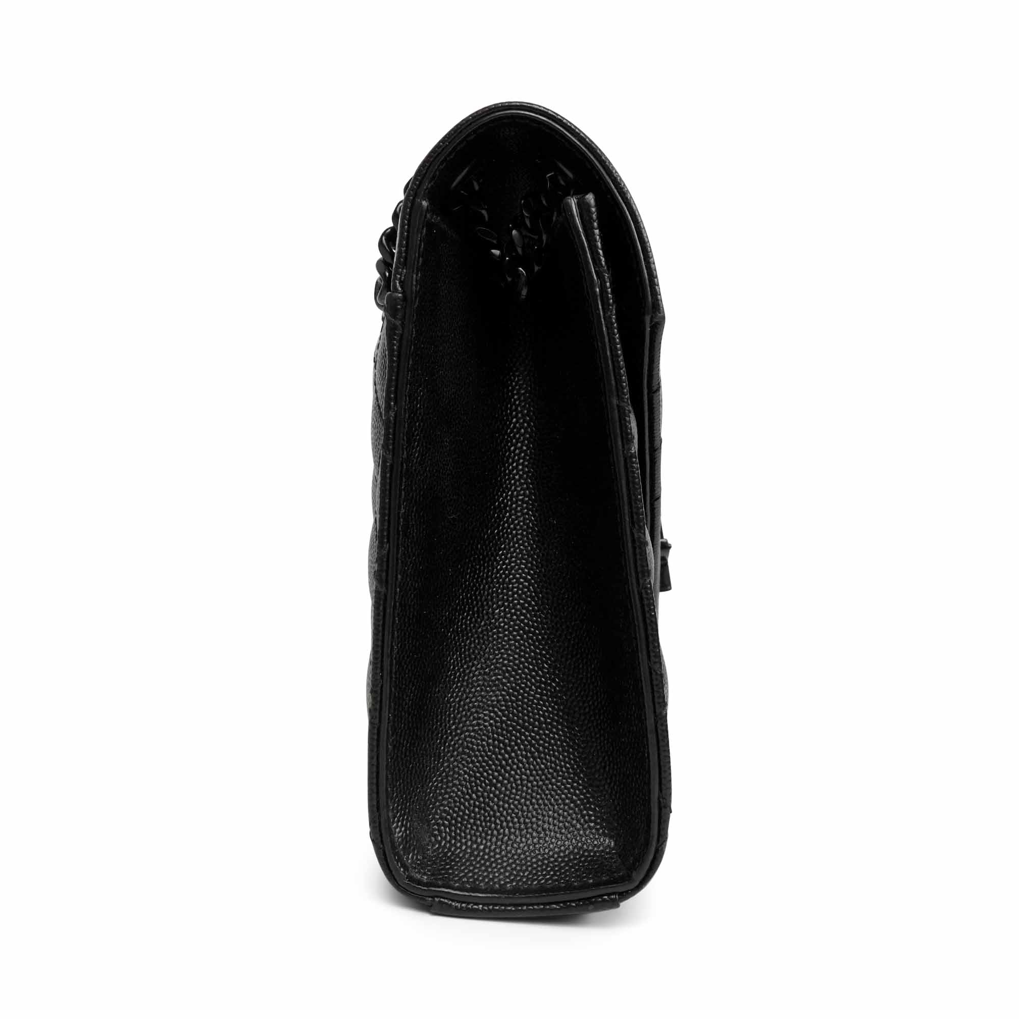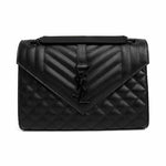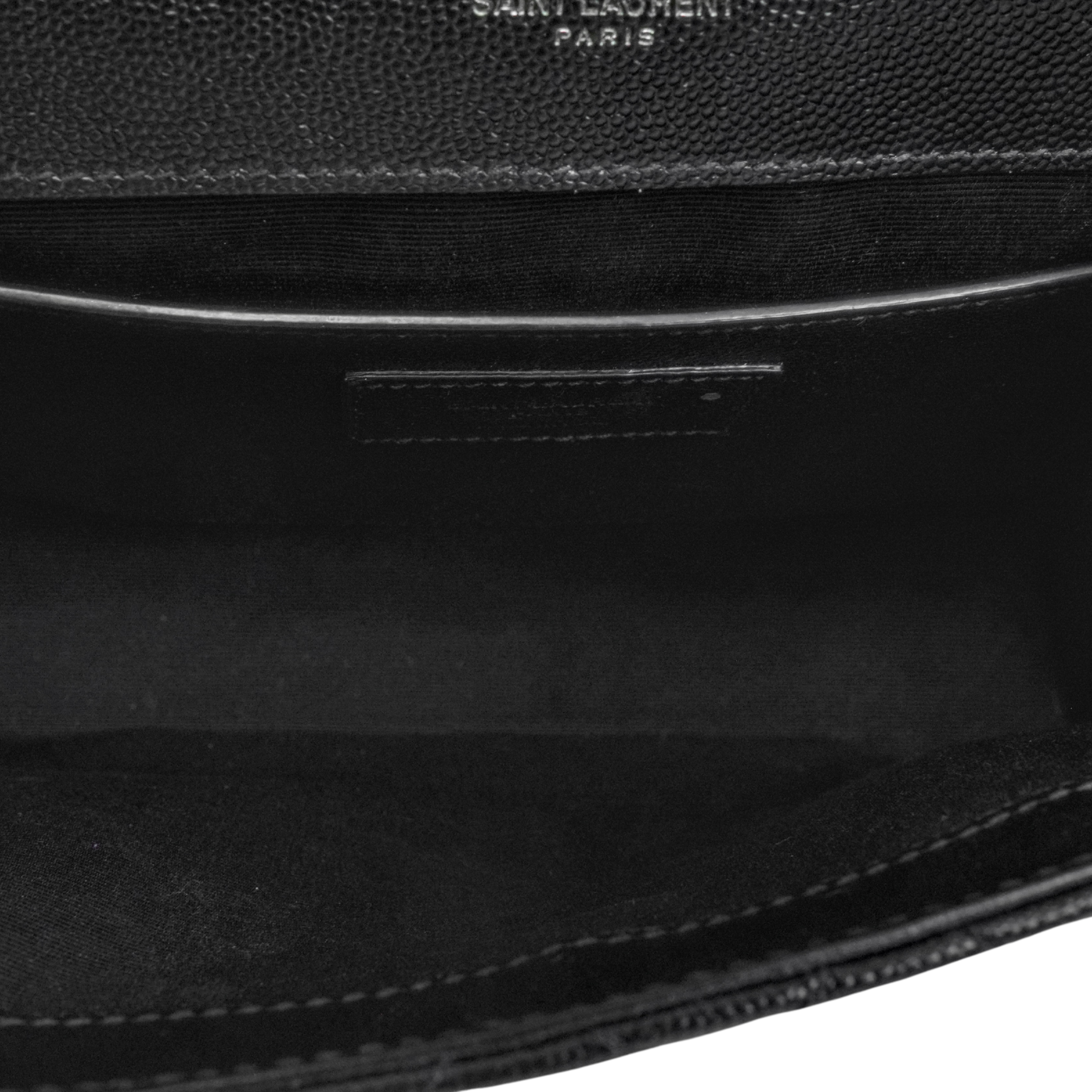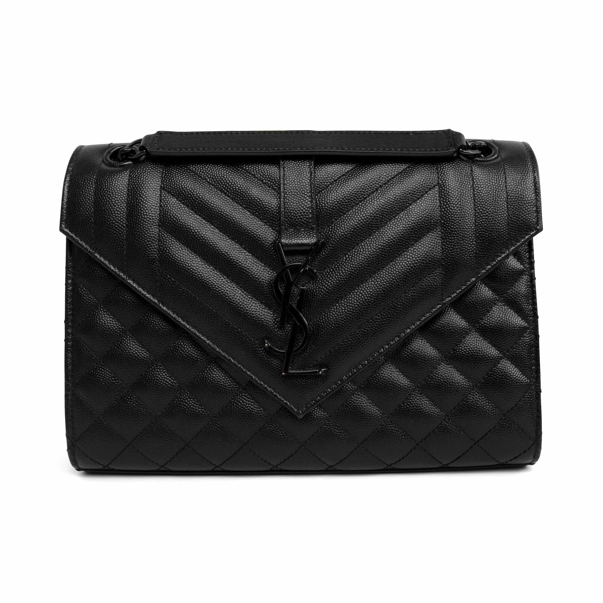 Saint Laurent 'Envelope Medium' chain bag in quilted black grain de poudre leather with YSL logo and black hardware. Features a pull chain strap with dual leather shoulder rests, magnetic flap closure, and grosgrain fabric lining.