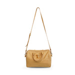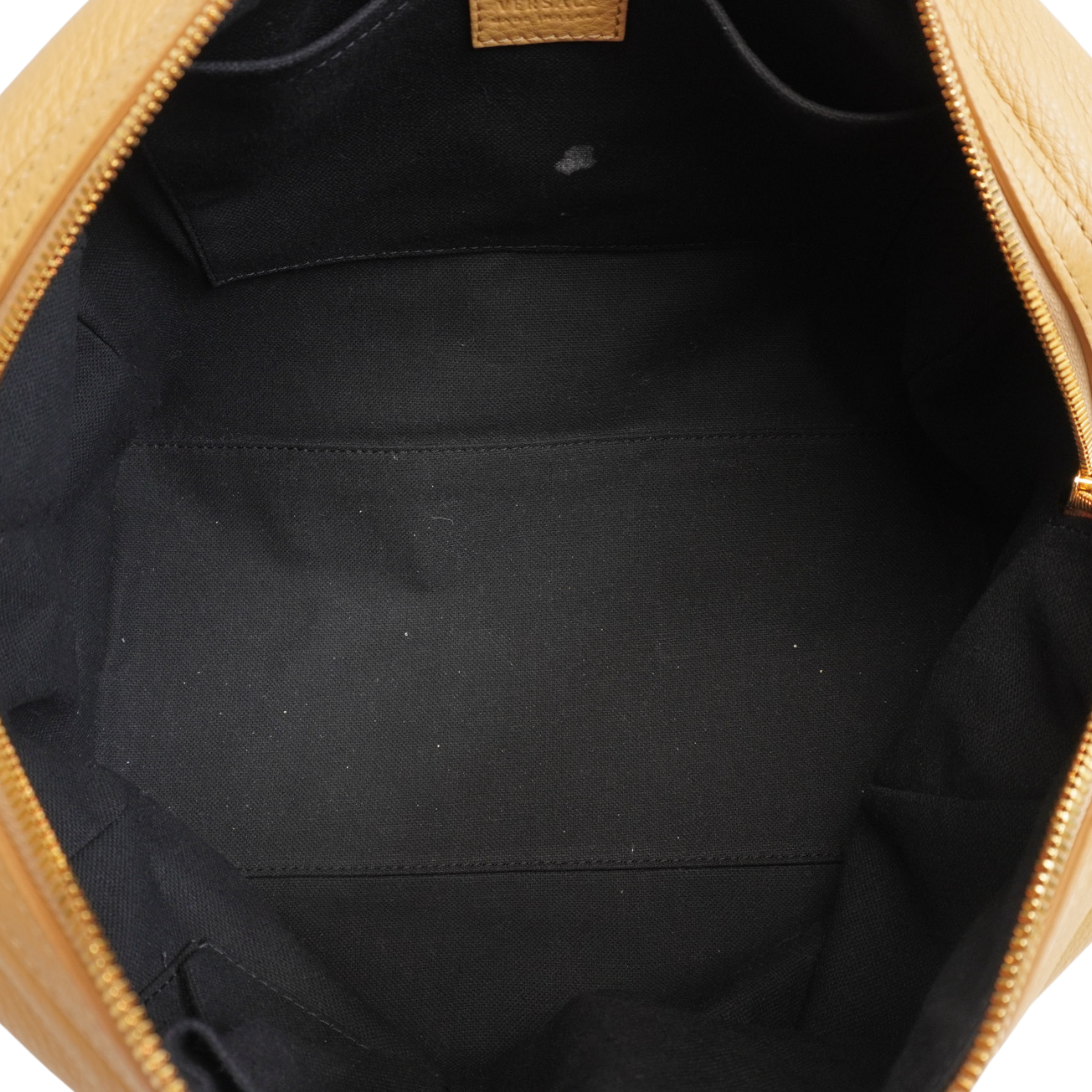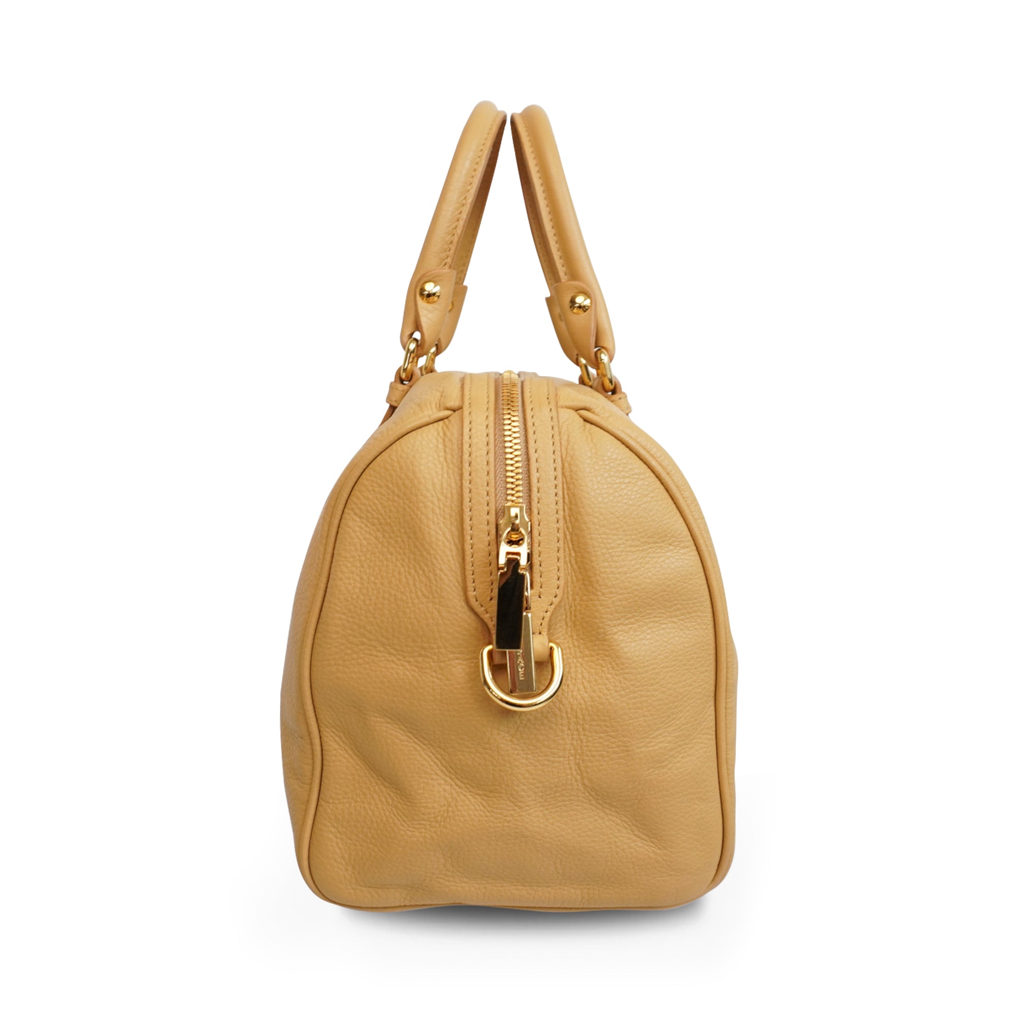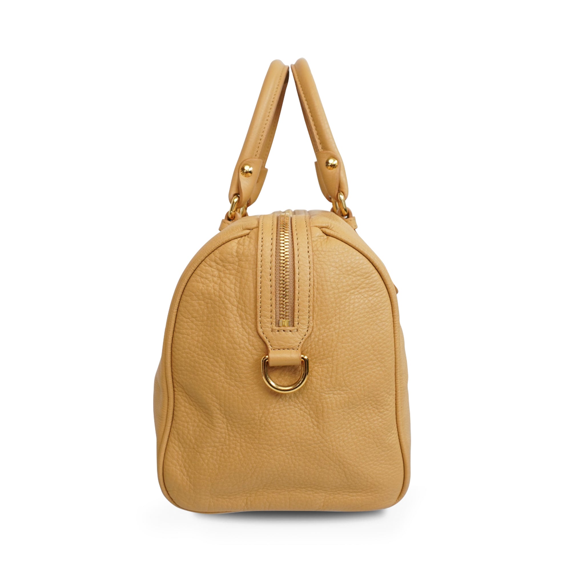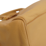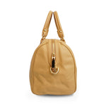 Versace 'Boston' duffle bag in tan calfskin leather with a gold medusa head on the front, rolled top handles and an optional crossbody strap. Features a top zip closure in gold hardware that opens to a black canvas lining with two slip pockets.