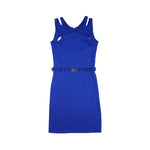 Gucci sleeveless mid-length dress in royal blue with cutouts on the bodice and a royal blue rope belt. Features a hidden zip closure on the back, a high neckline, and silver hardware details and buckle on the belt.
