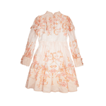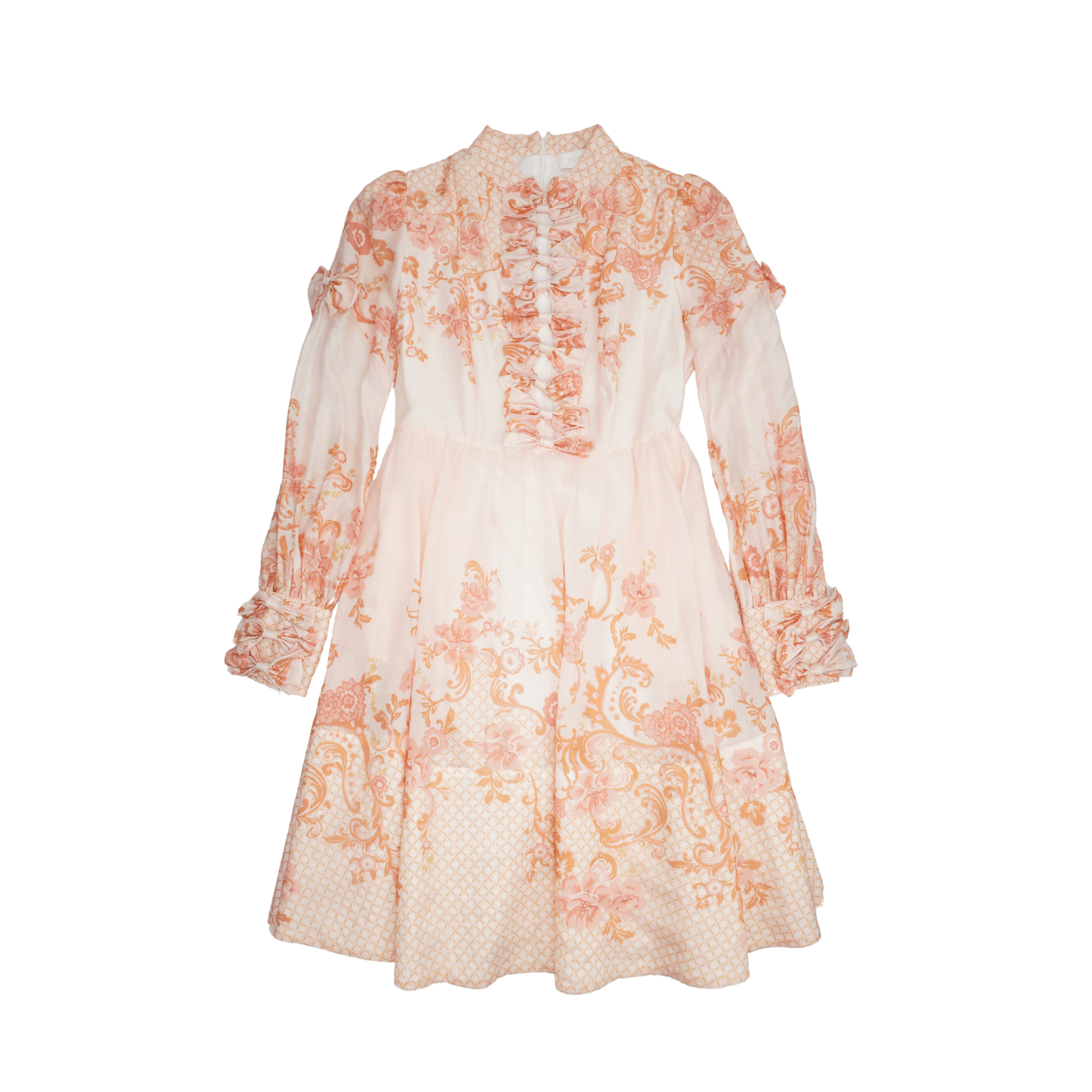 Zimmerman babydoll dress in a pink cotton with a pink and brown floral print, long sleeves, and bow appliqués down the front.