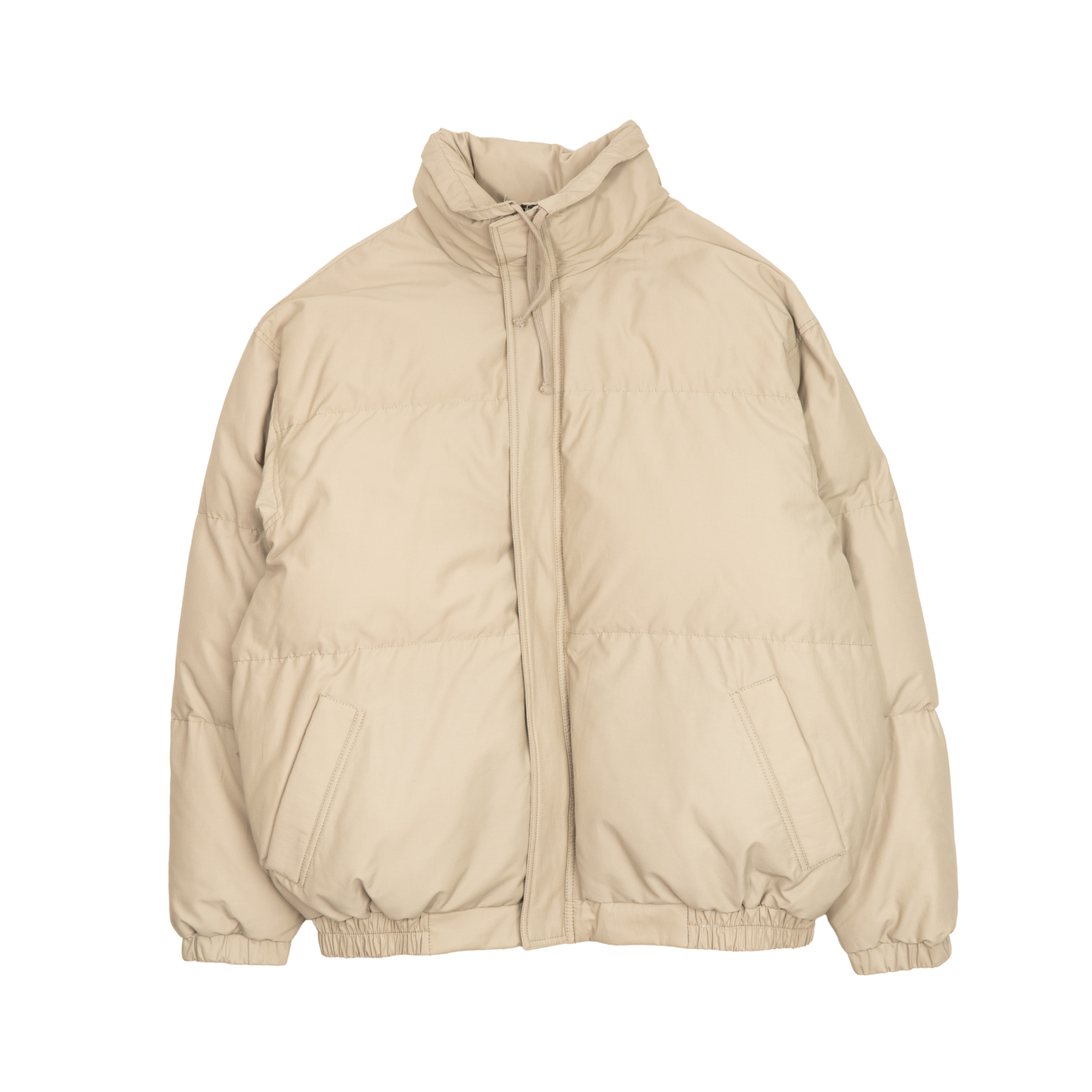 Essentials 'Sage' puffer jacket in a green toned grey canvas with hidden zipper placket, two front slip pockets, stand collar with drawstring around the top. Featuring cinched cuffs, hem and rubber logo on the back neck.