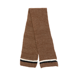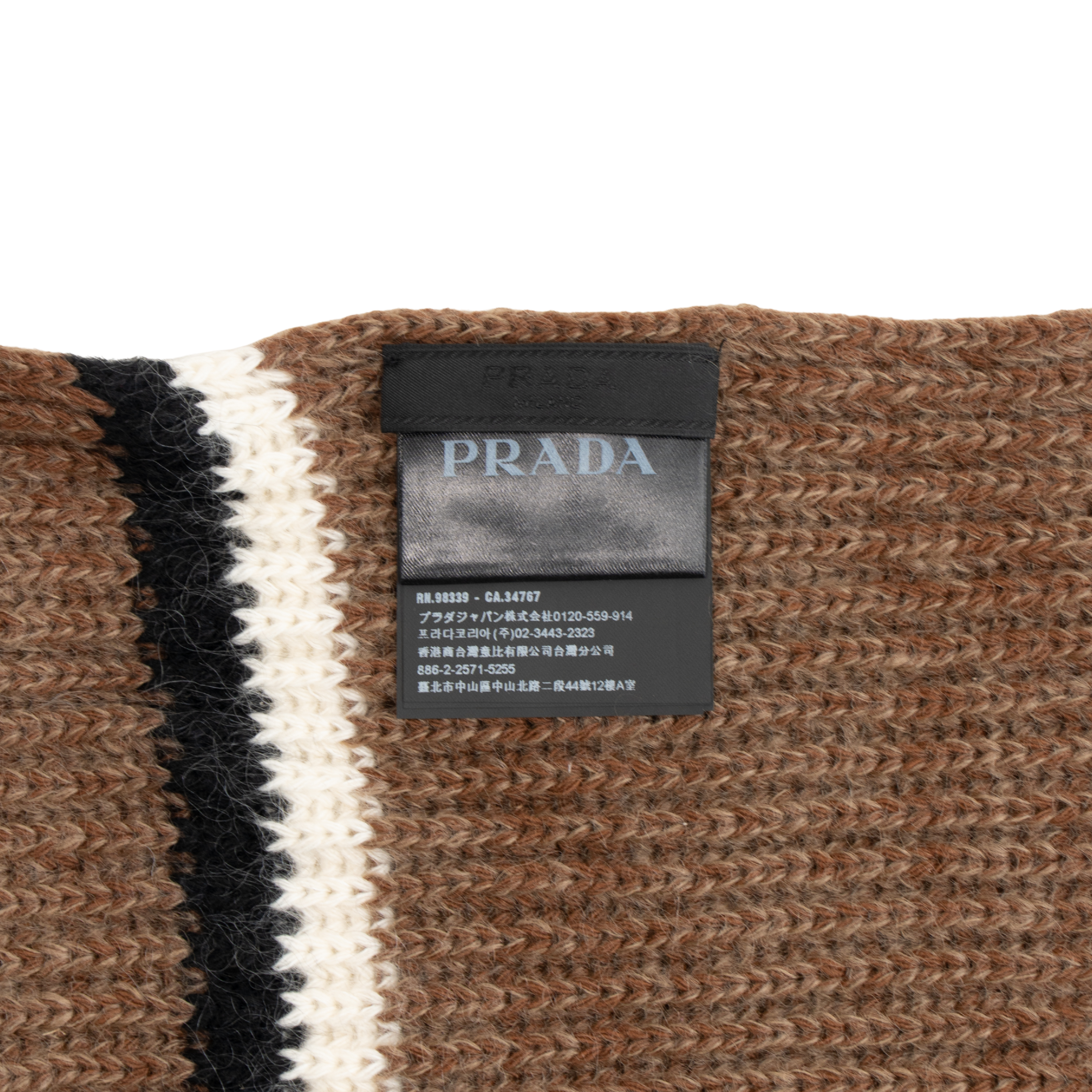 Prada rectangle scarf in a knit heather brown wool blend with black and white stripes at the ends.