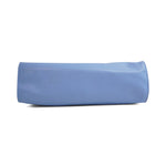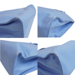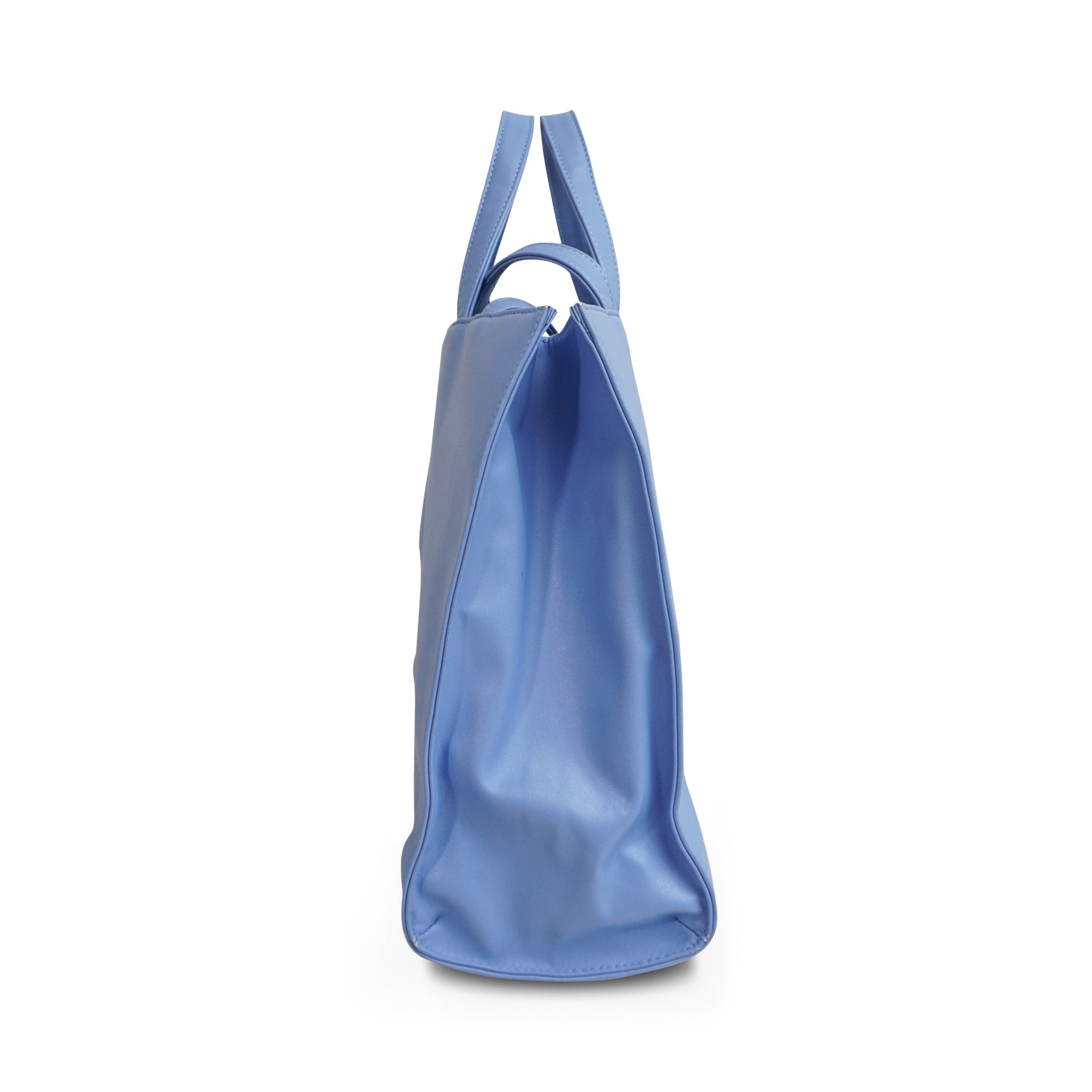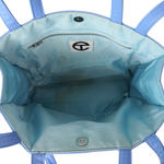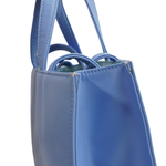 Telfar medium size 'Shopping' tote in sky blue vegan leather with an embossed logo on the front. Features magnetic snap closure, double top and shoulder strap handles with light blue canvas lining and an inner zip pocket.