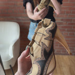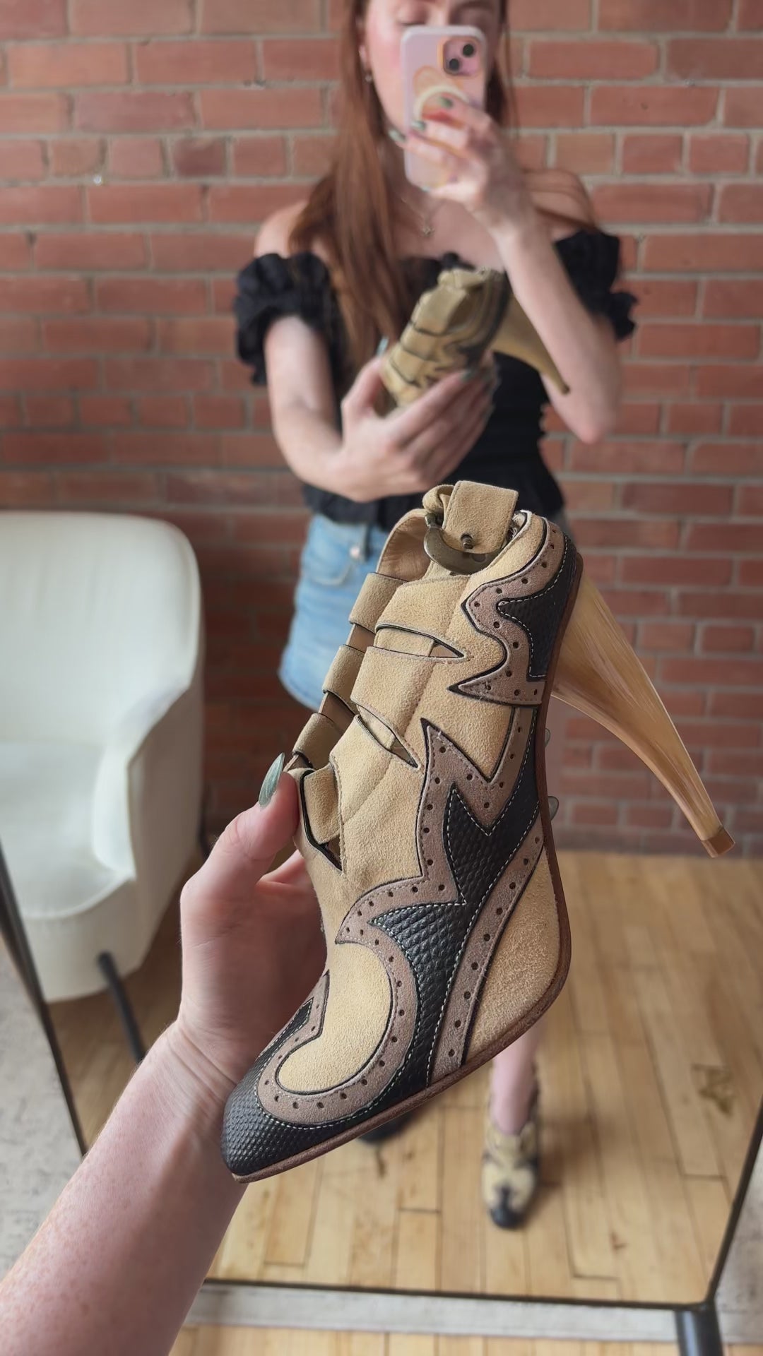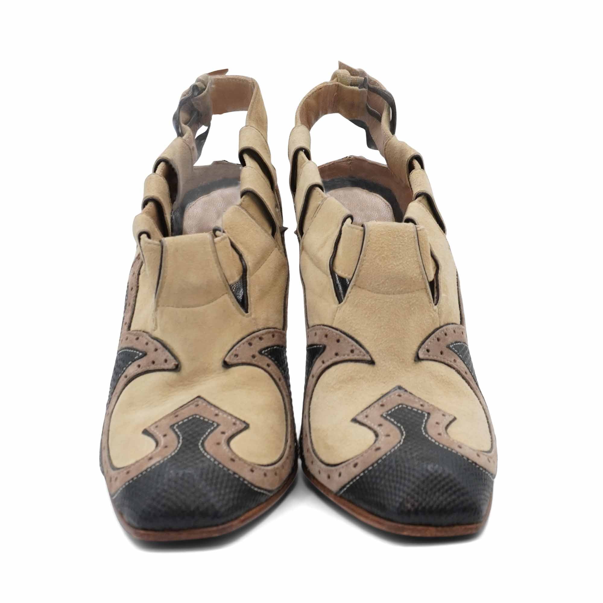 Alexander McQueen 'Shipwrecked' square toe heels in beige suede with black and brown leather western details. Featuring a cutout ankle strap and beige horn heel.