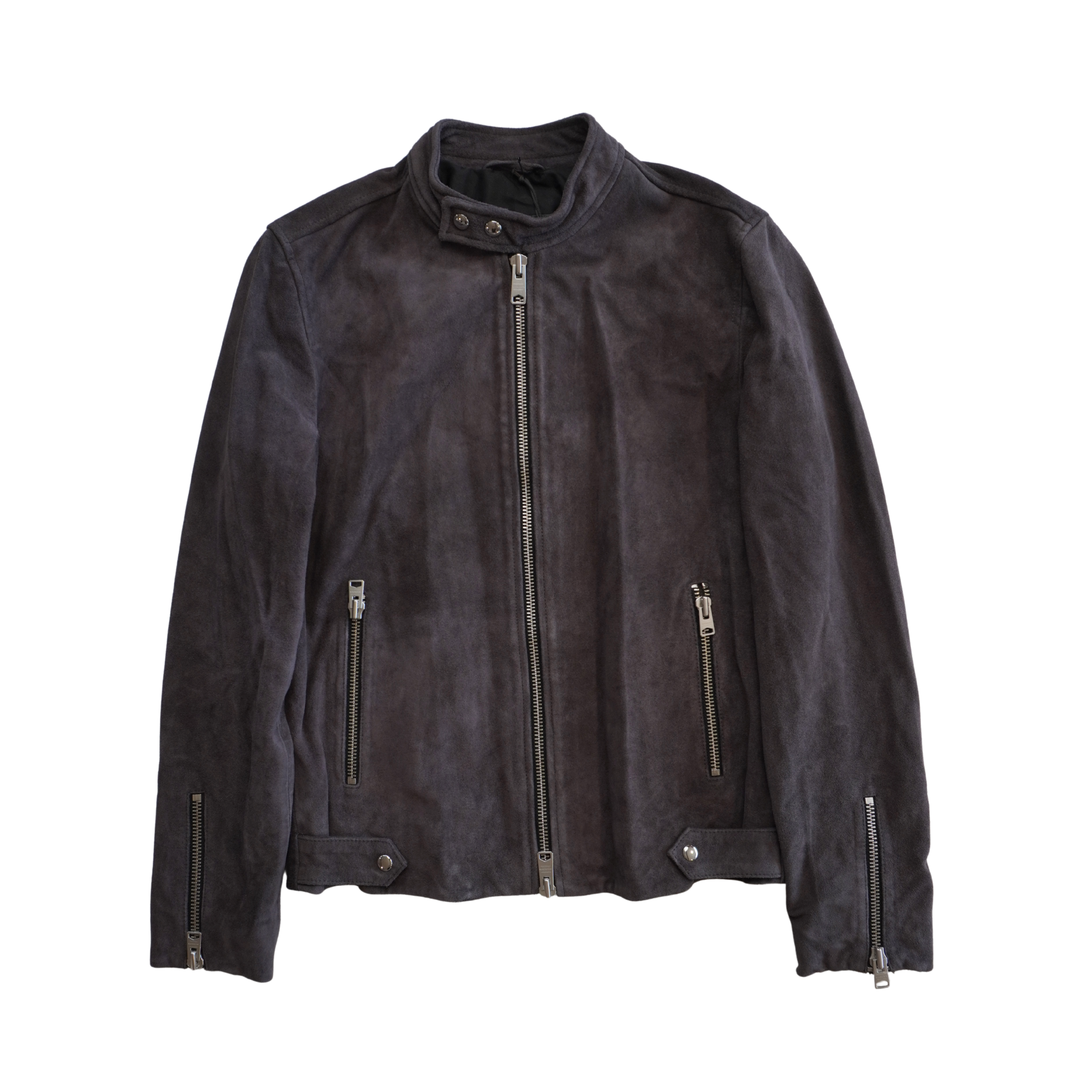 All Saints 'Driver' jacket in grey suede with a front zip opening in silver hardware, zip pockets, and a snap button collar.