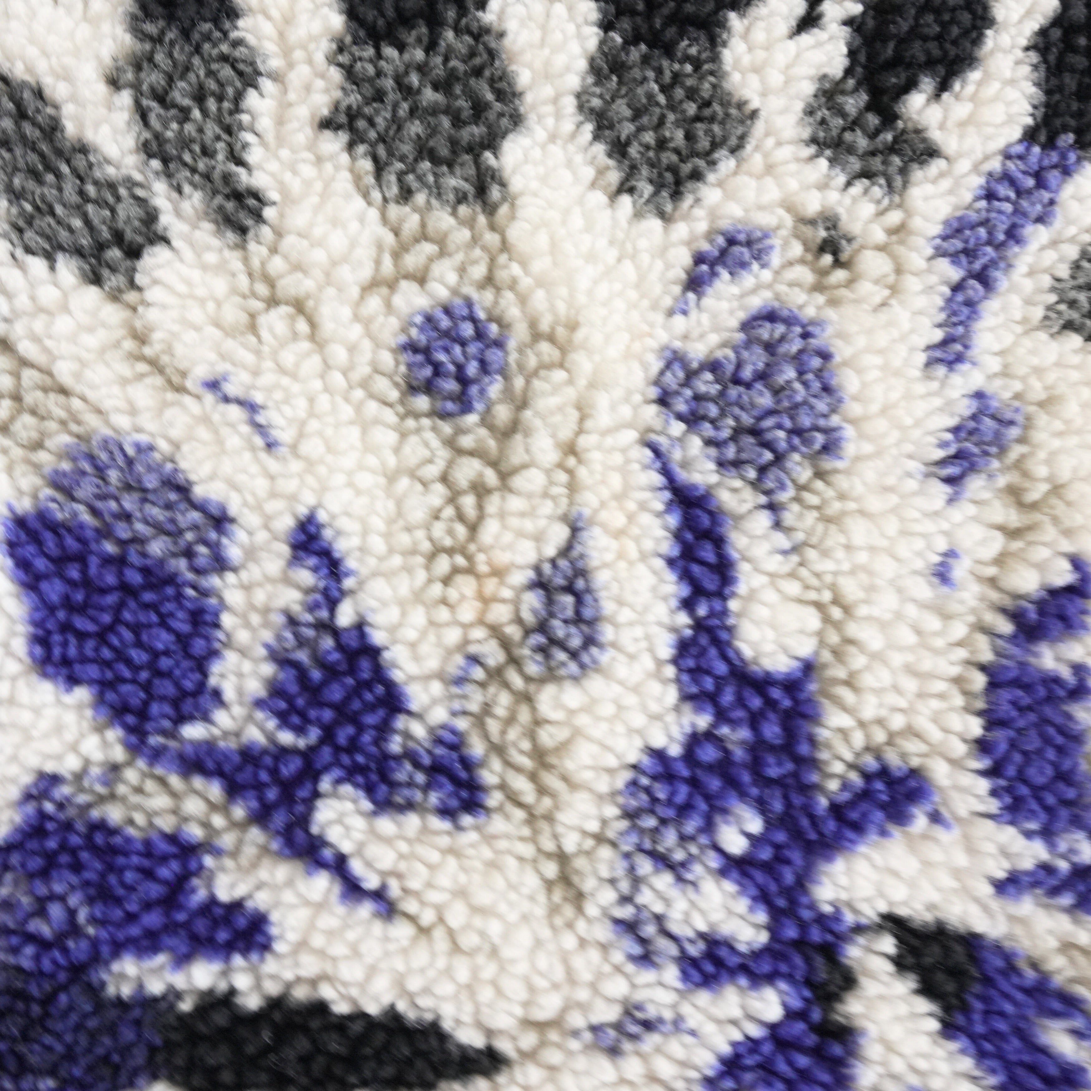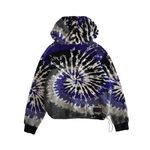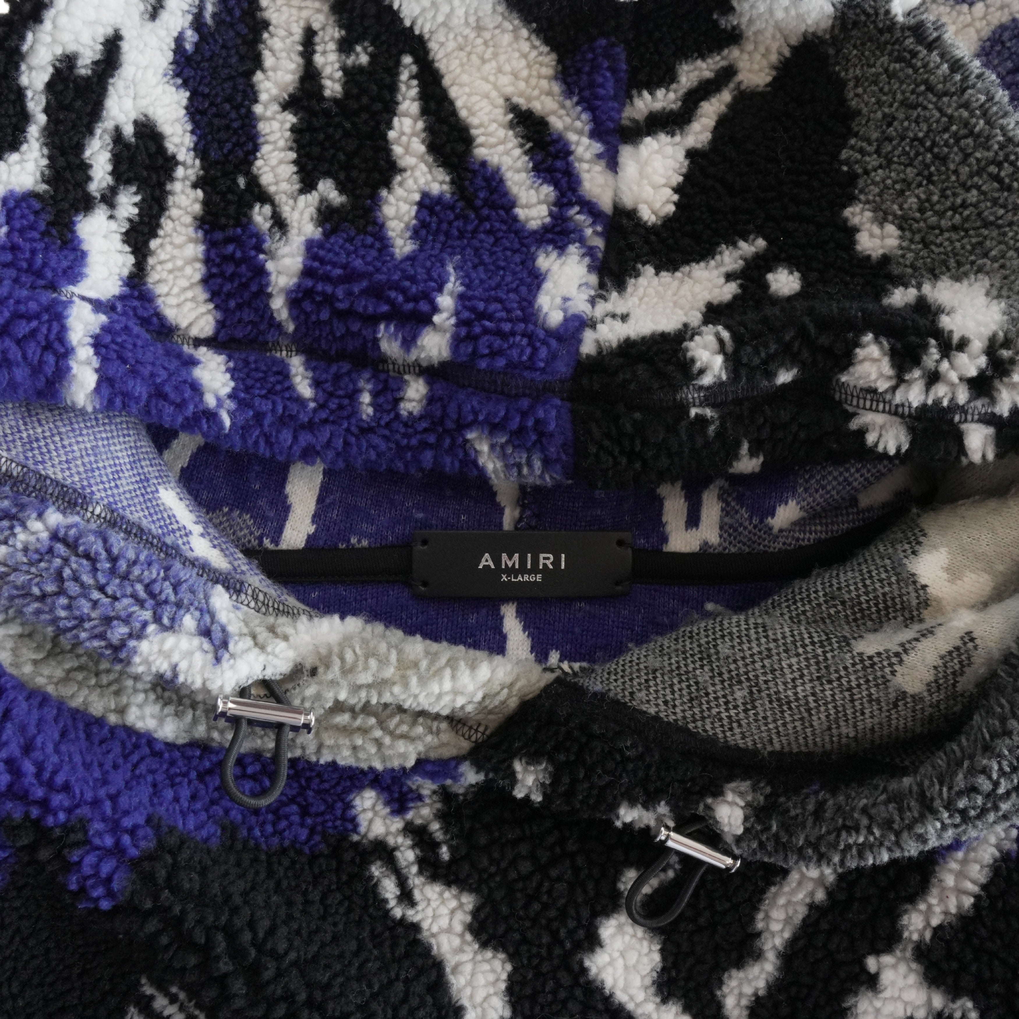 Amiri polar fleece hoodie with an all-over blue, black, white and grey tie-dye print, a front kangaroo pocket, and an elastic drawstring hood.