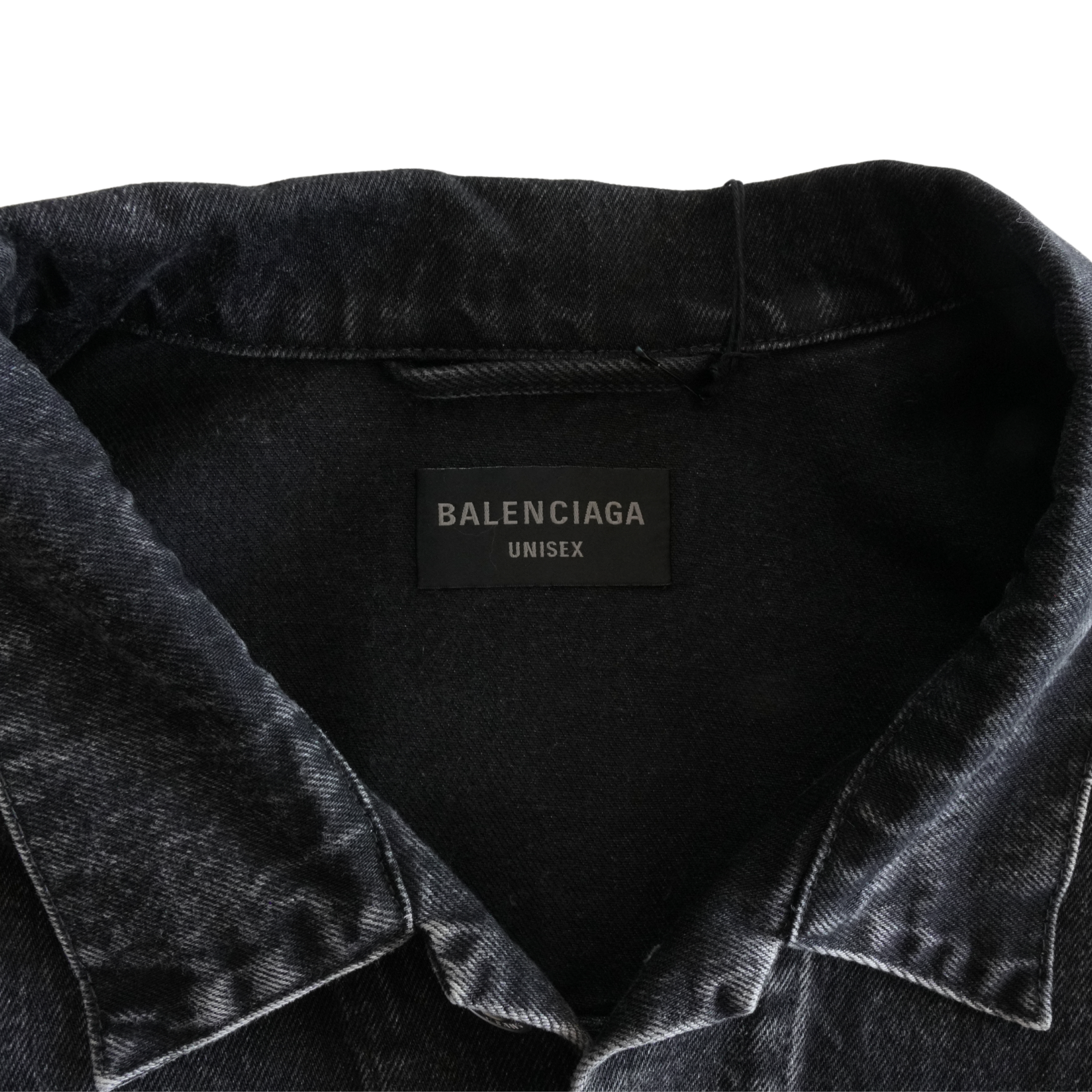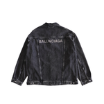 Balenciaga oversized denim jacket in black washed denim with large silver rhinestone logo across the back.