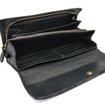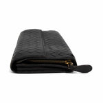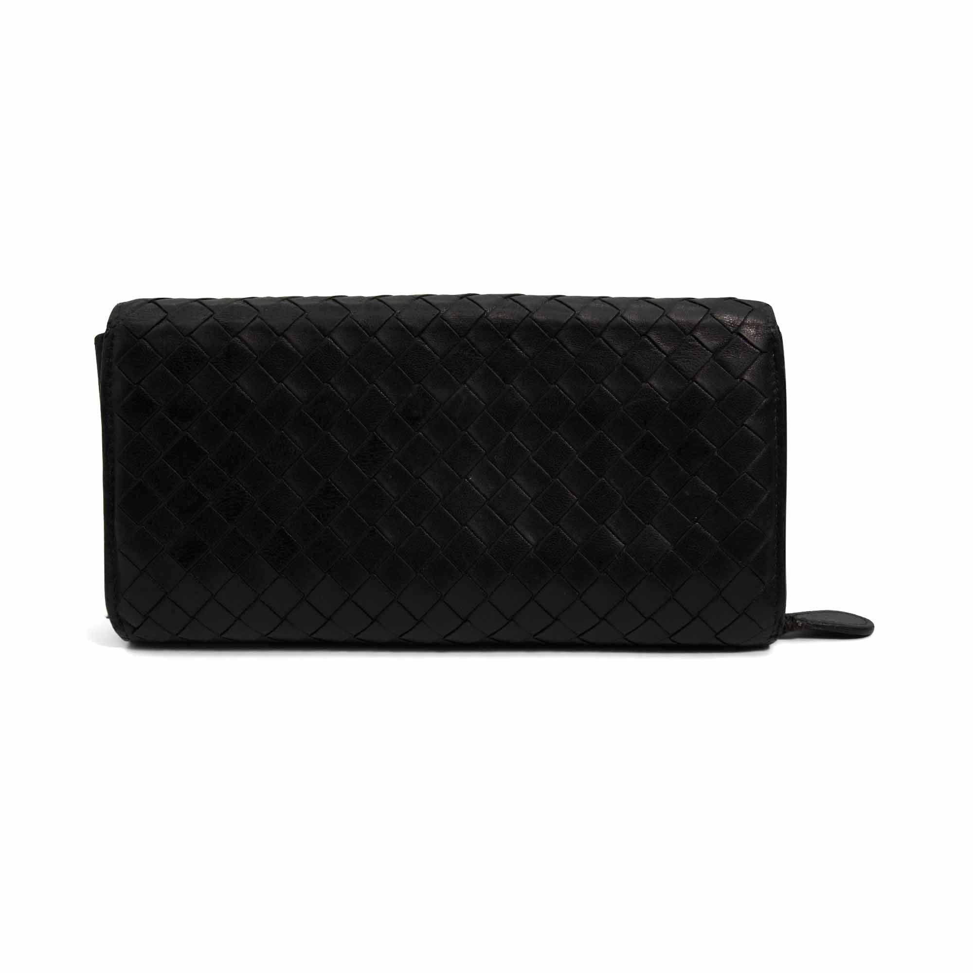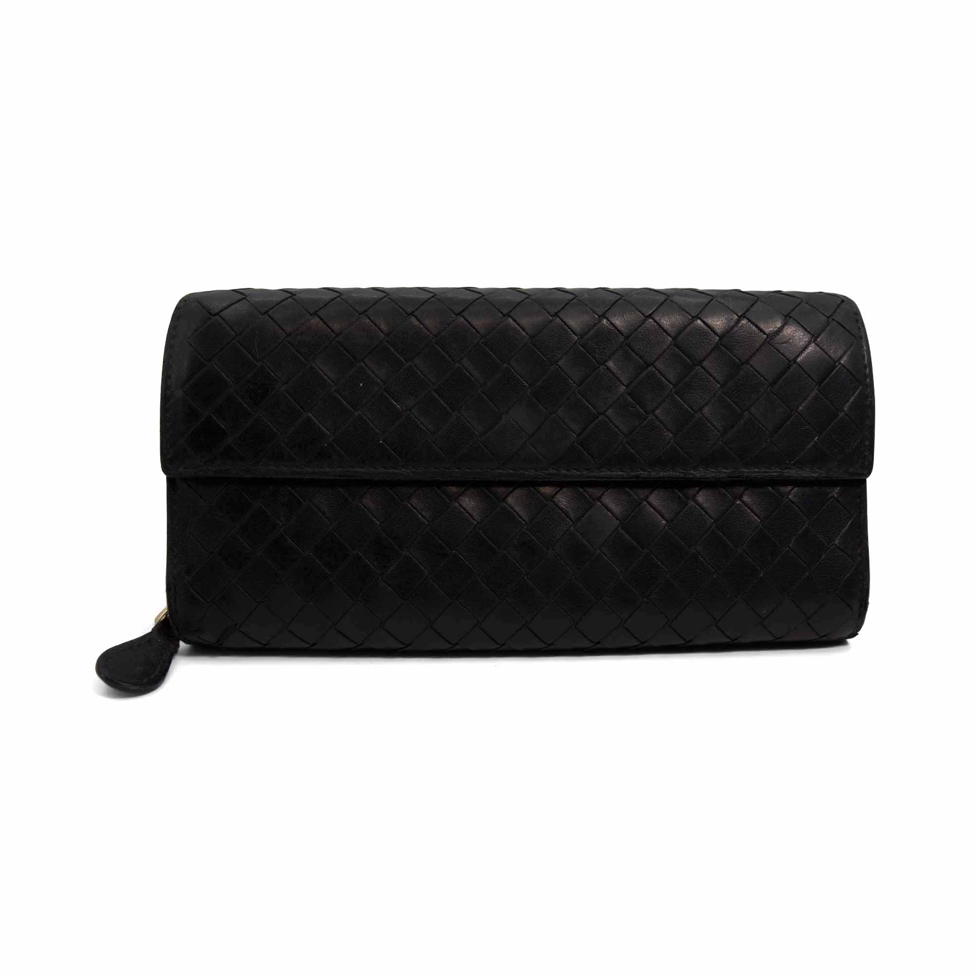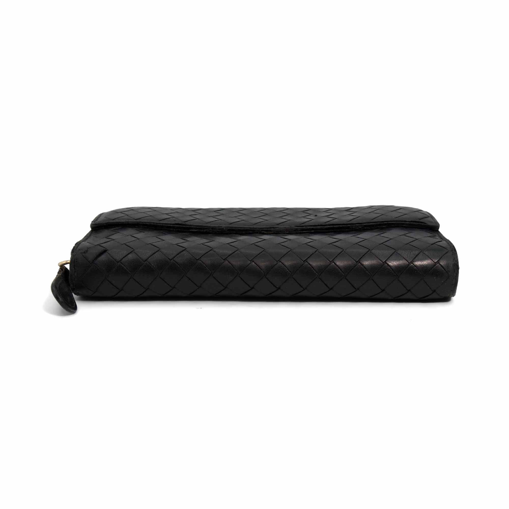 Bottega Venetta 'Intrecciato' continental wallet in black woven leather with top flap. Interior features zip coin pocket and eight card slots.
