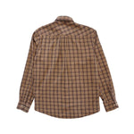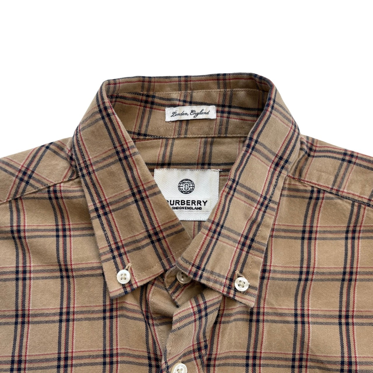 Burberry button-down shirt in tan cotton with an all-over red and navy plaid print, small white buttons, and a chest pocket with a red embroidered 'TB' logo.