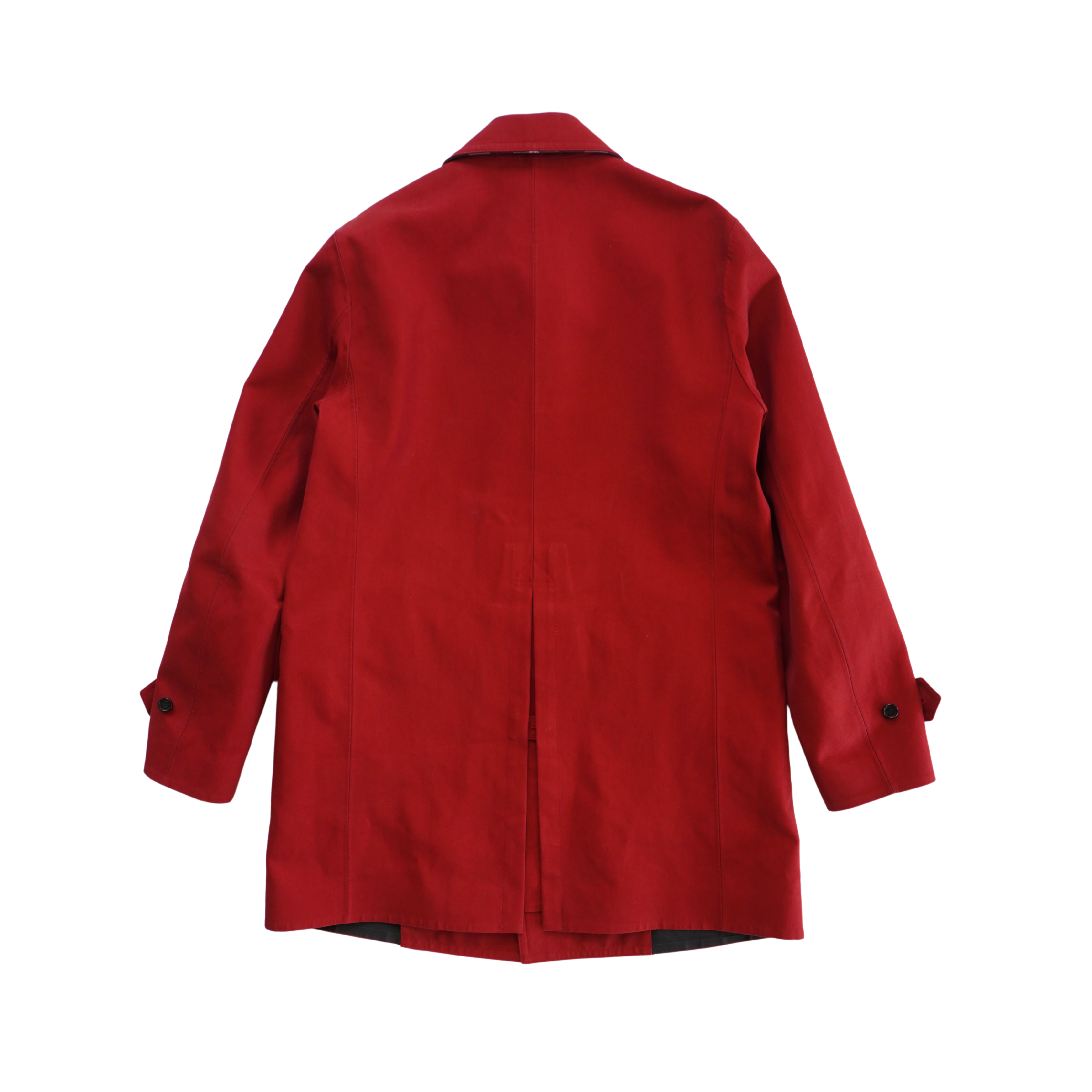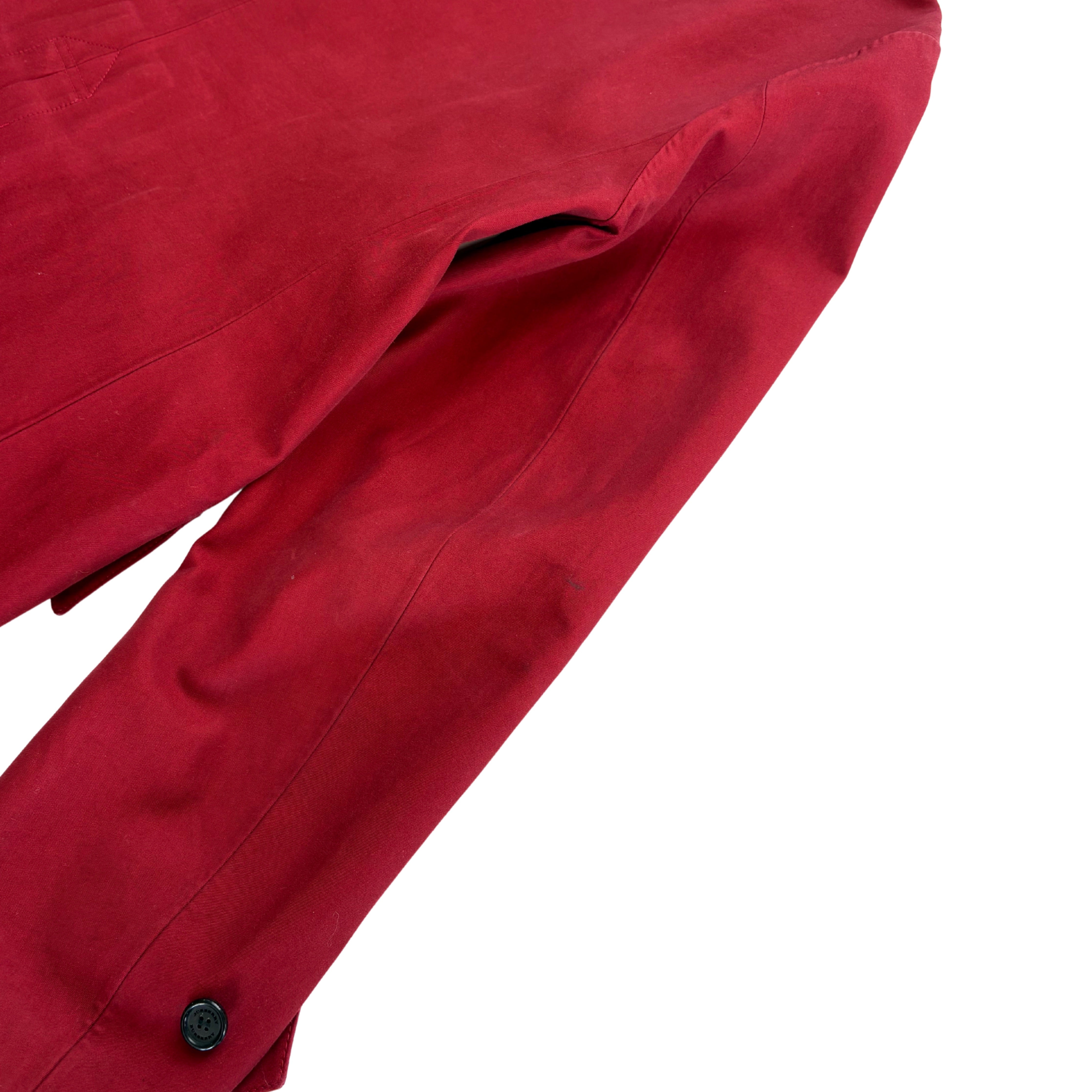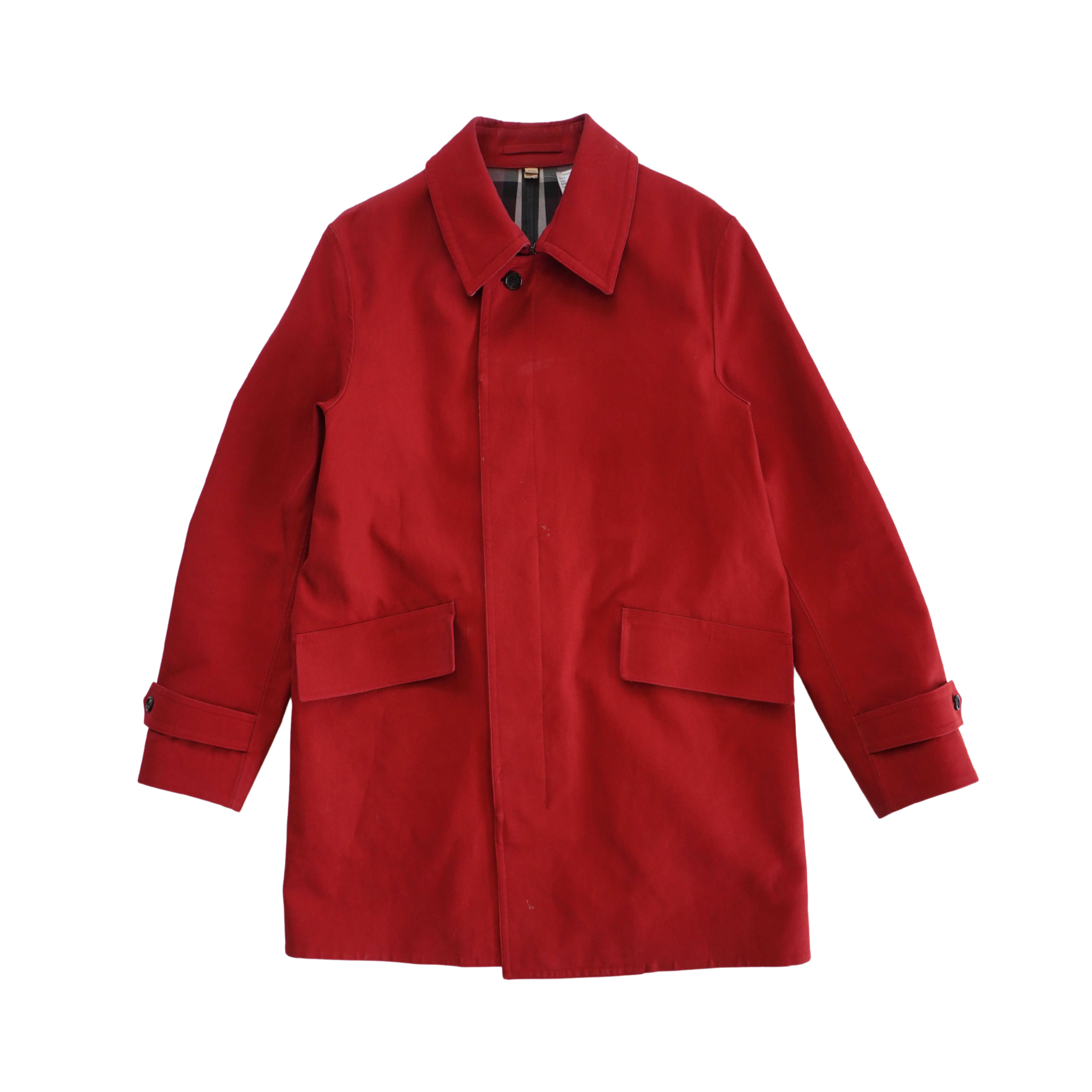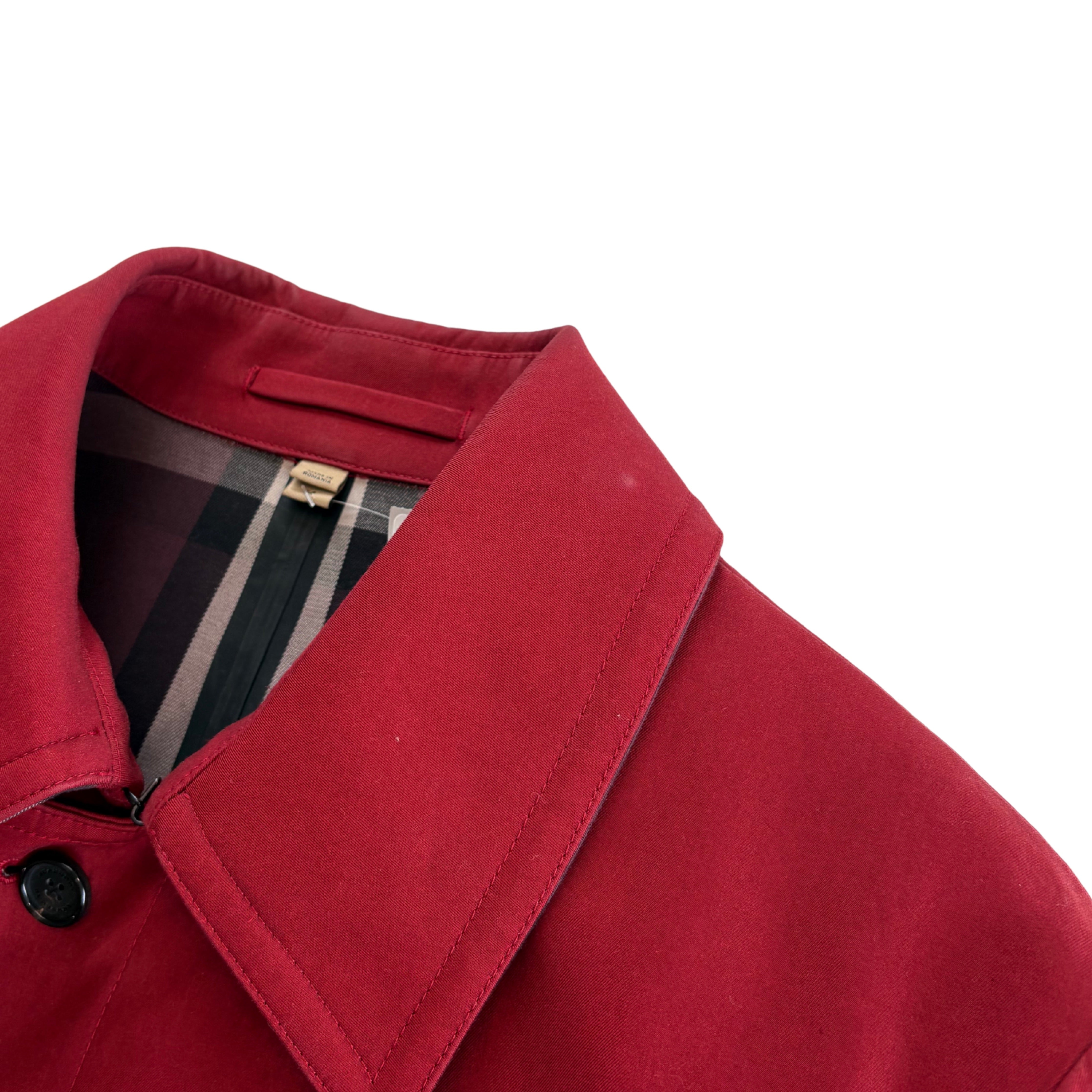 Burberry short trench jacket in red cotton with large black buttons, front flap pockets, and a point collar.