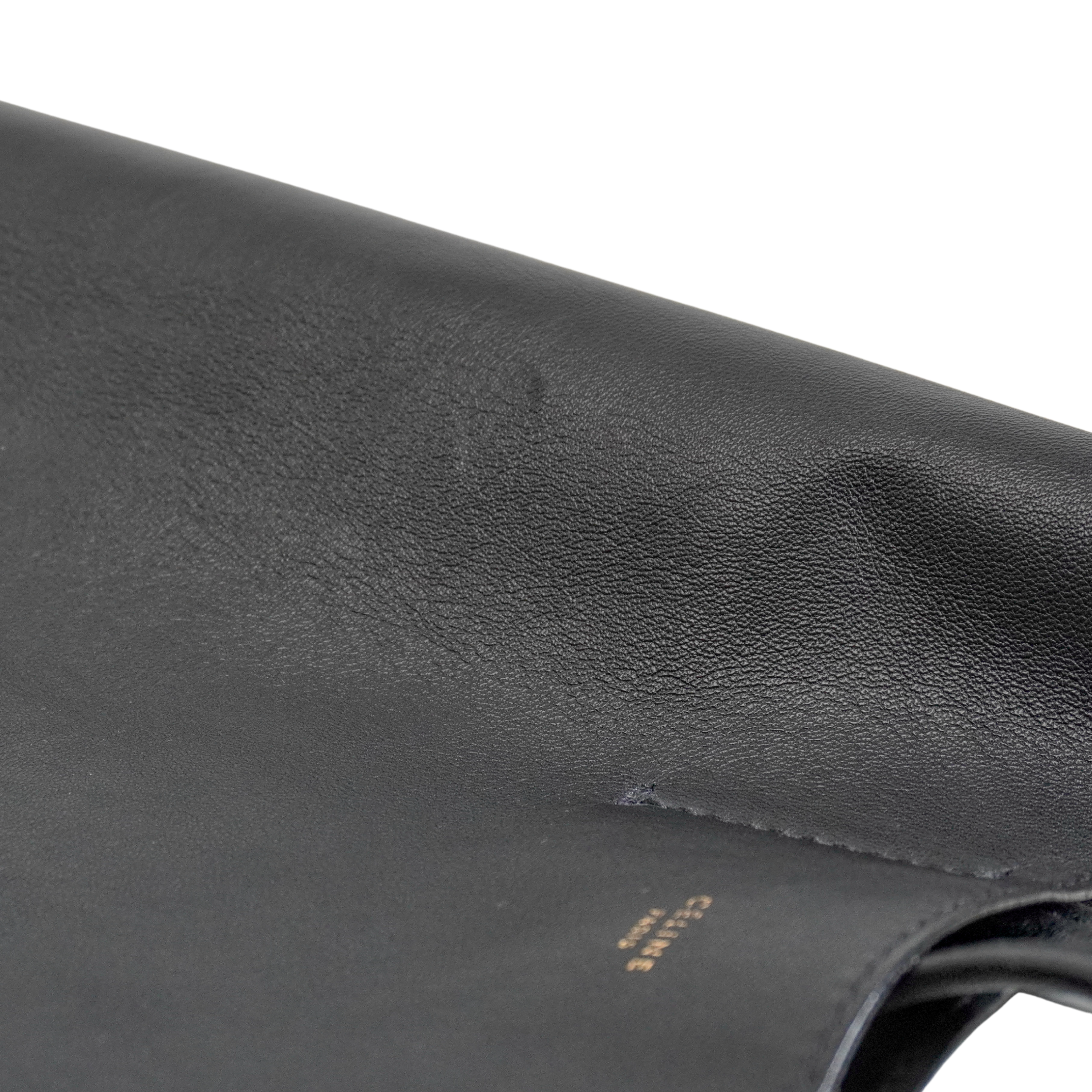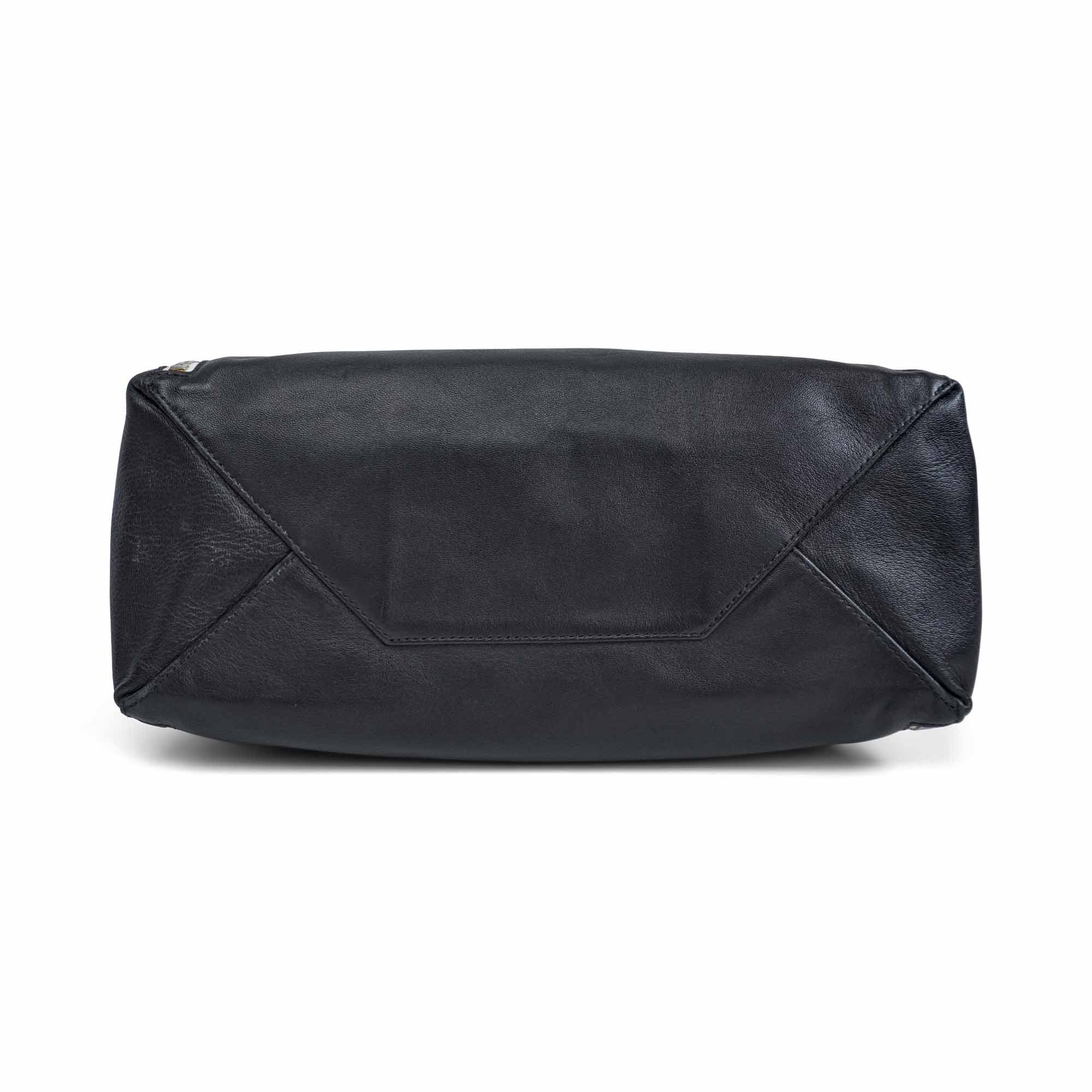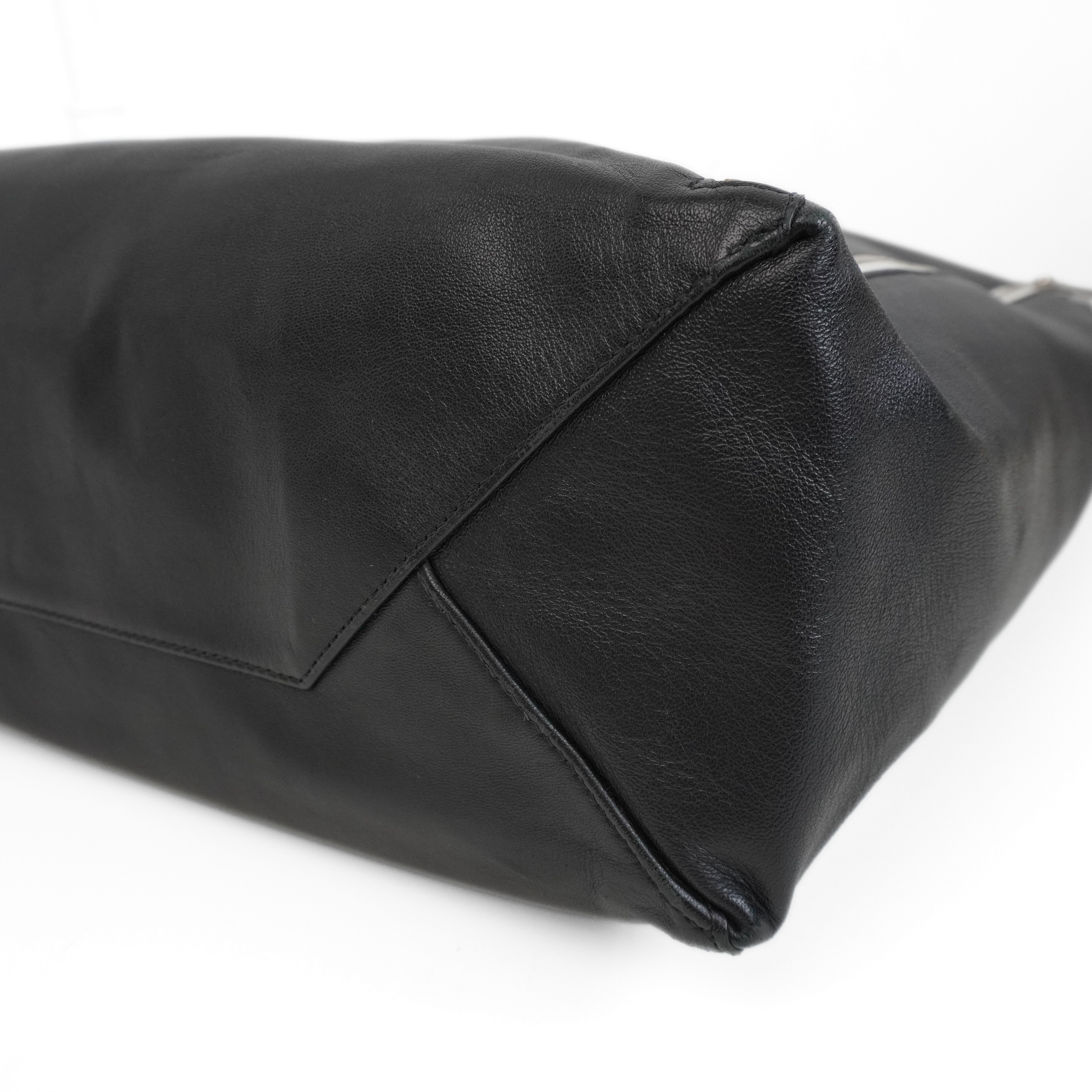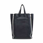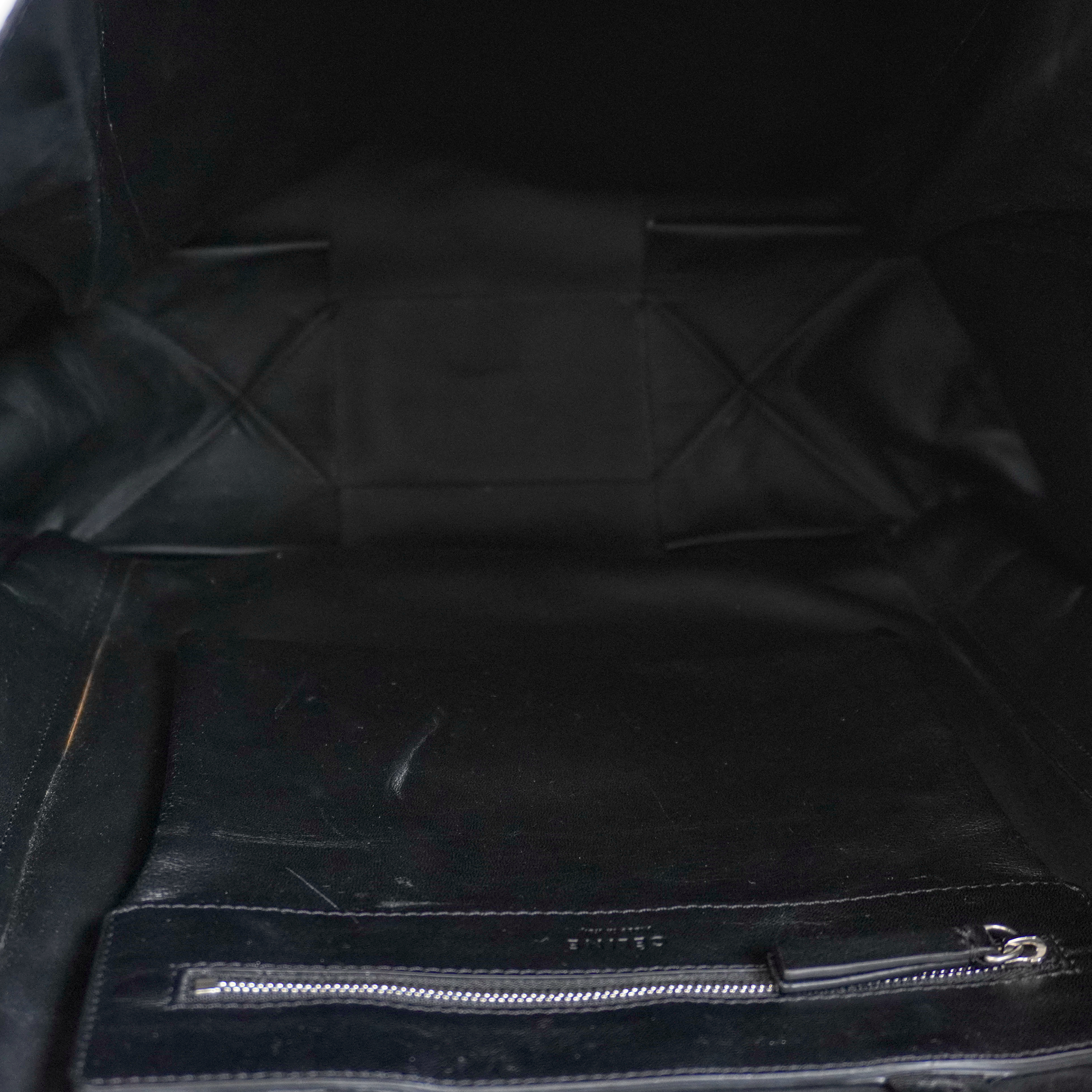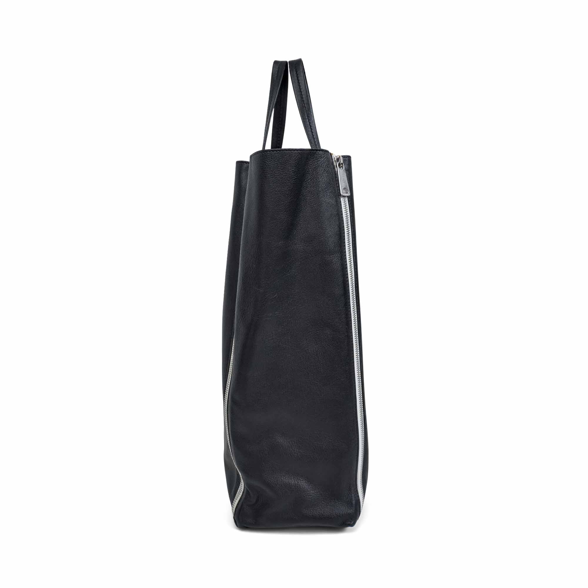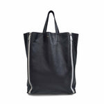 Celine 'Vertical Zip Gusset Cabas' tote bag in black leather with silver hardware and white zipper trim. Features zip-out white leather gussets and a full leather lining with interior flat zip pocket.