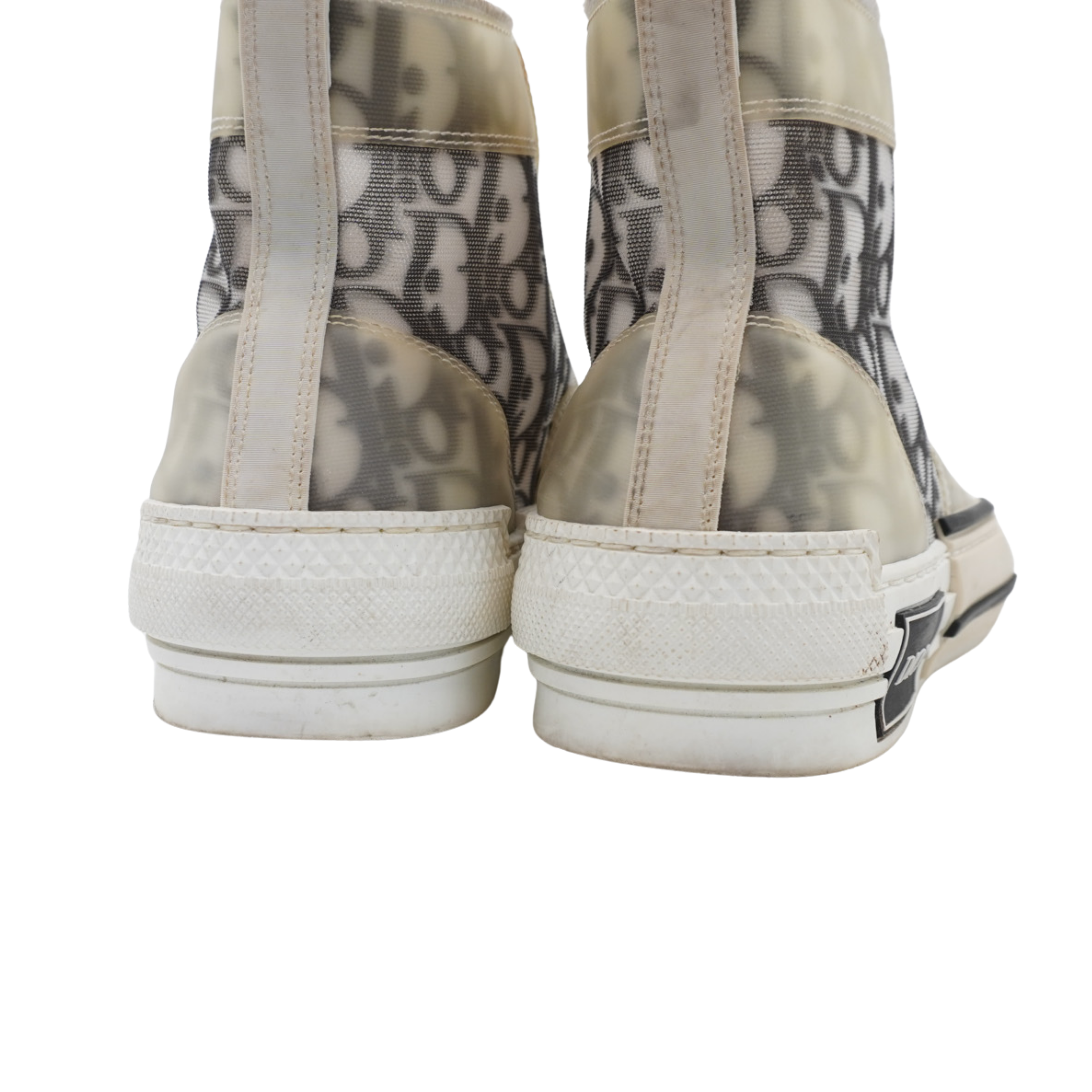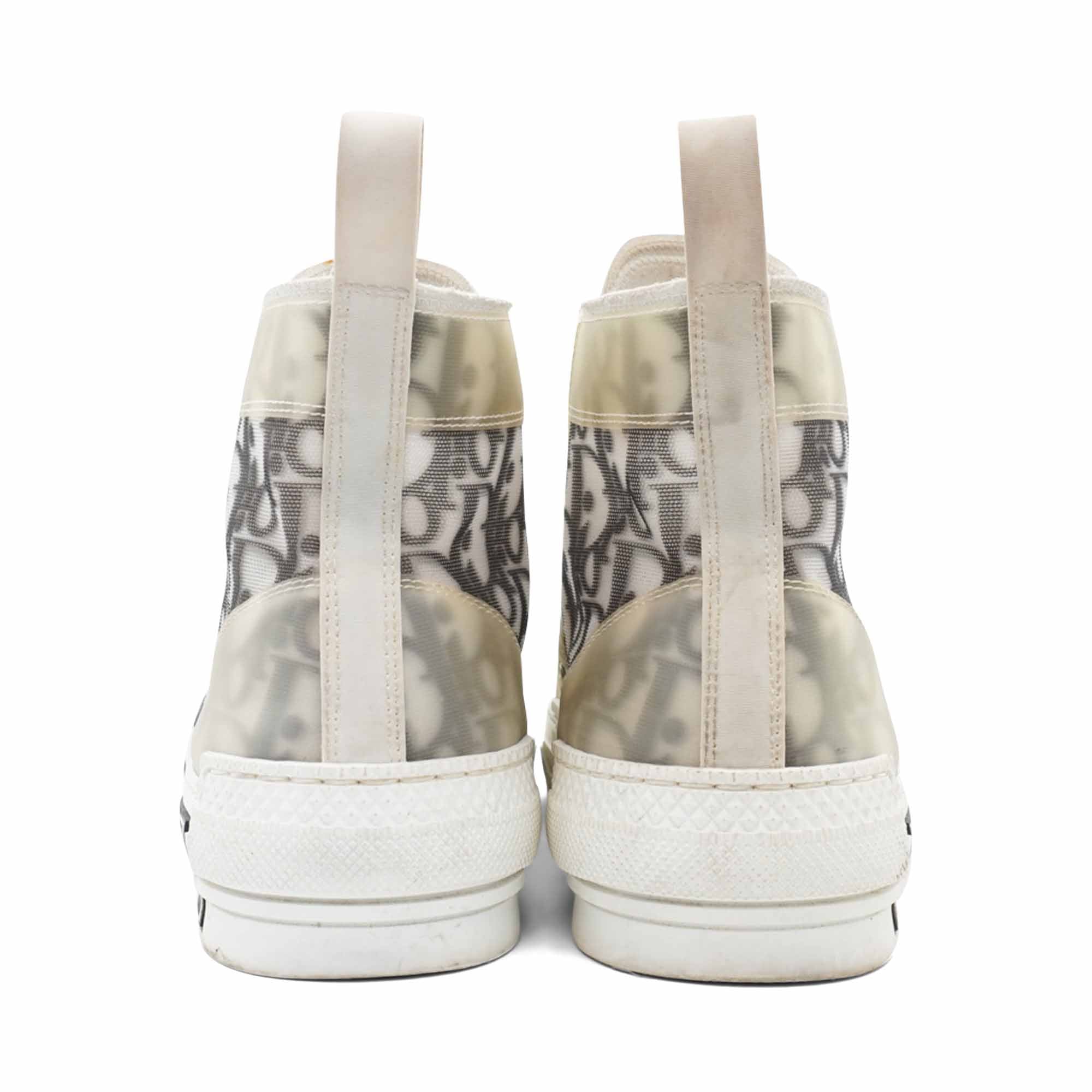 Christian Dior 'B23' high-top sneakers in white and black transparent mesh with an all-over oblique monogram print, a clear PVC trim, white laces, and a logo patch on the side sole.