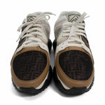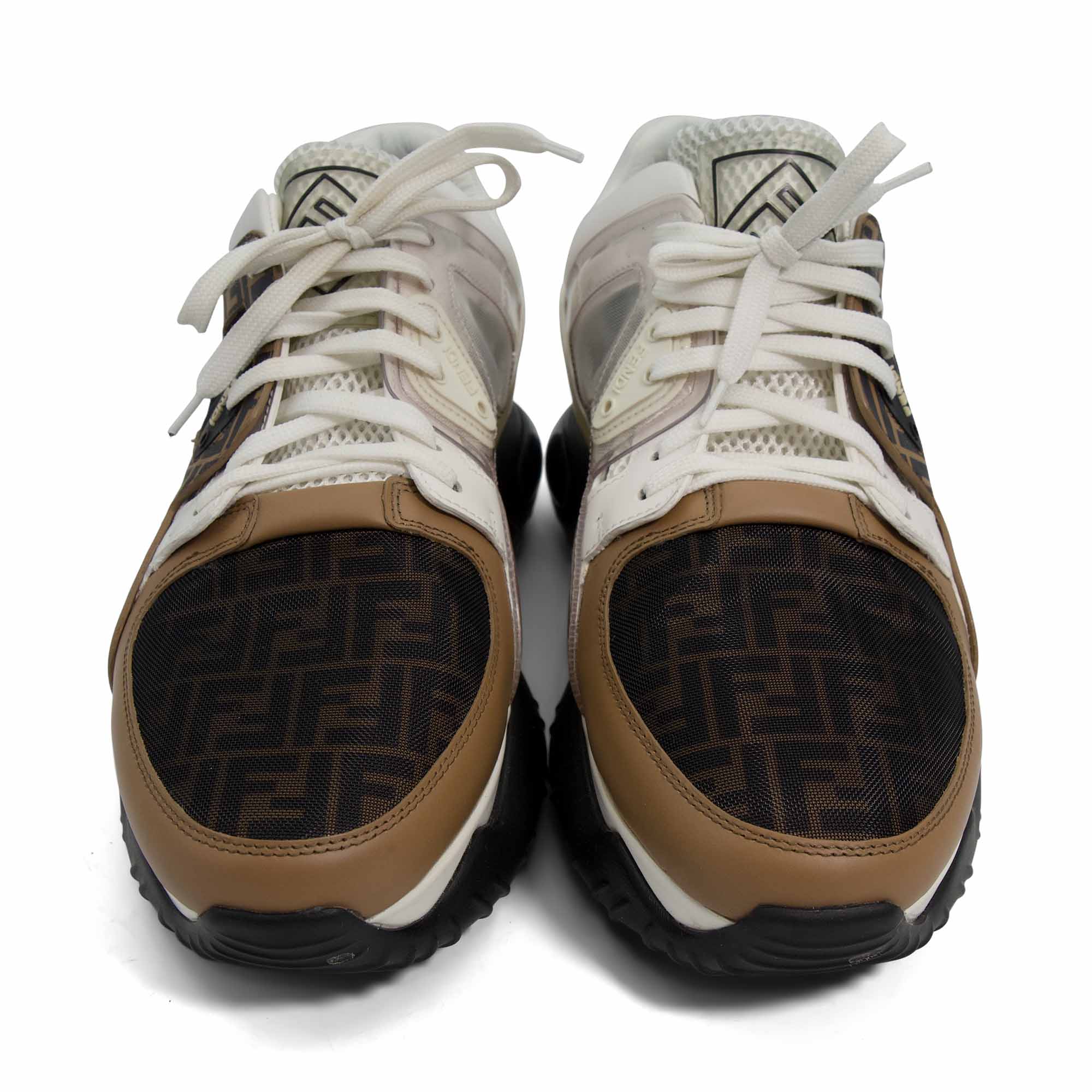 Fendi 'Multi' chunky sneakers in white, brown and zucca monogram leather. Featuring side mesh panels, zucca monogram mesh toe box and black rubber sole.