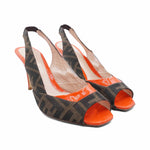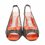 Fendi peep-toe slingback heels in brown Zucca monogram with orange patent leather heel and toe with a gold embossed 'F' heel.