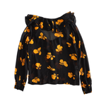 Ganni 'Fairfax Georgette' blouse in black semi-sheer viscose with an all-over orange floral print, a front-button opening, and a low neckline with ruffle trim.
