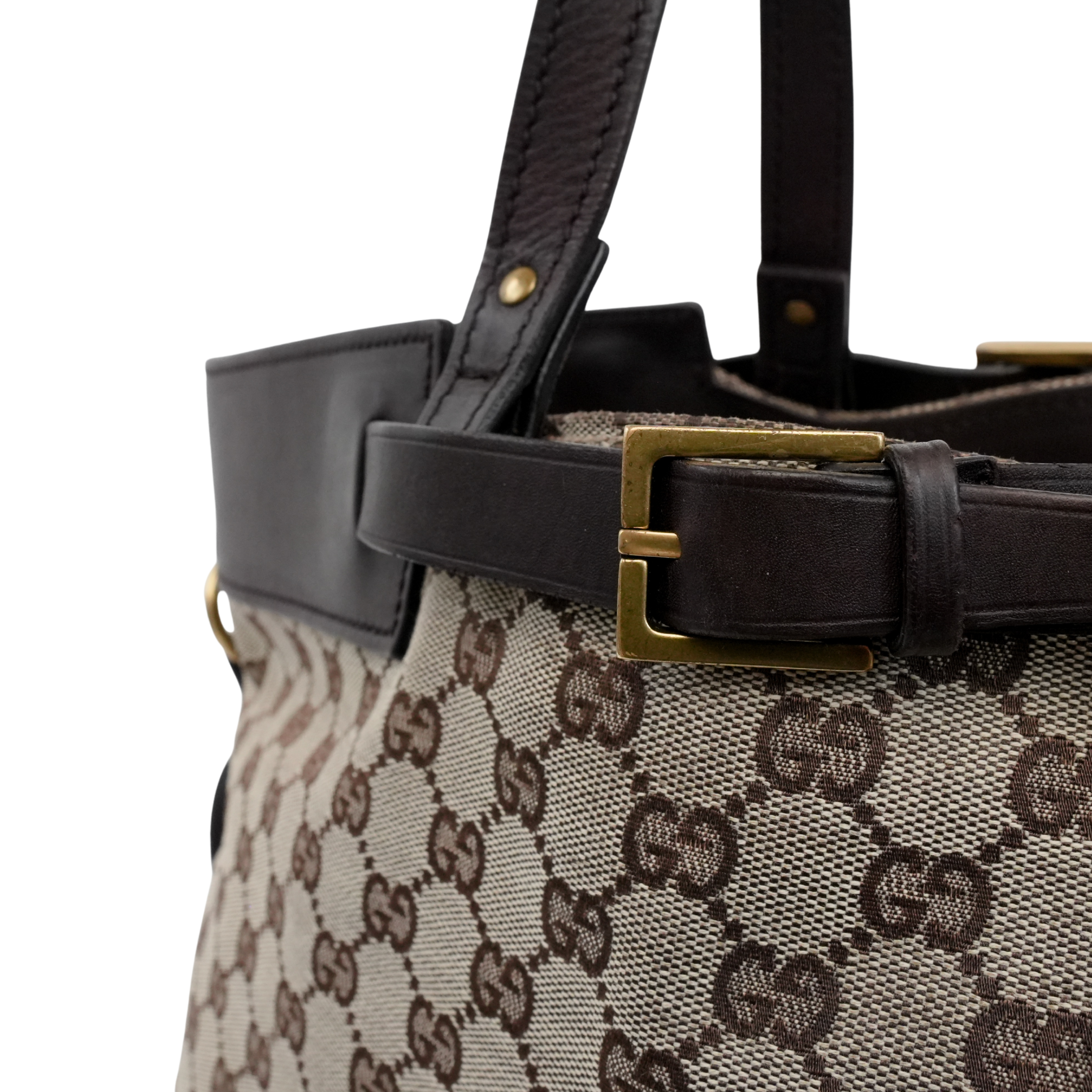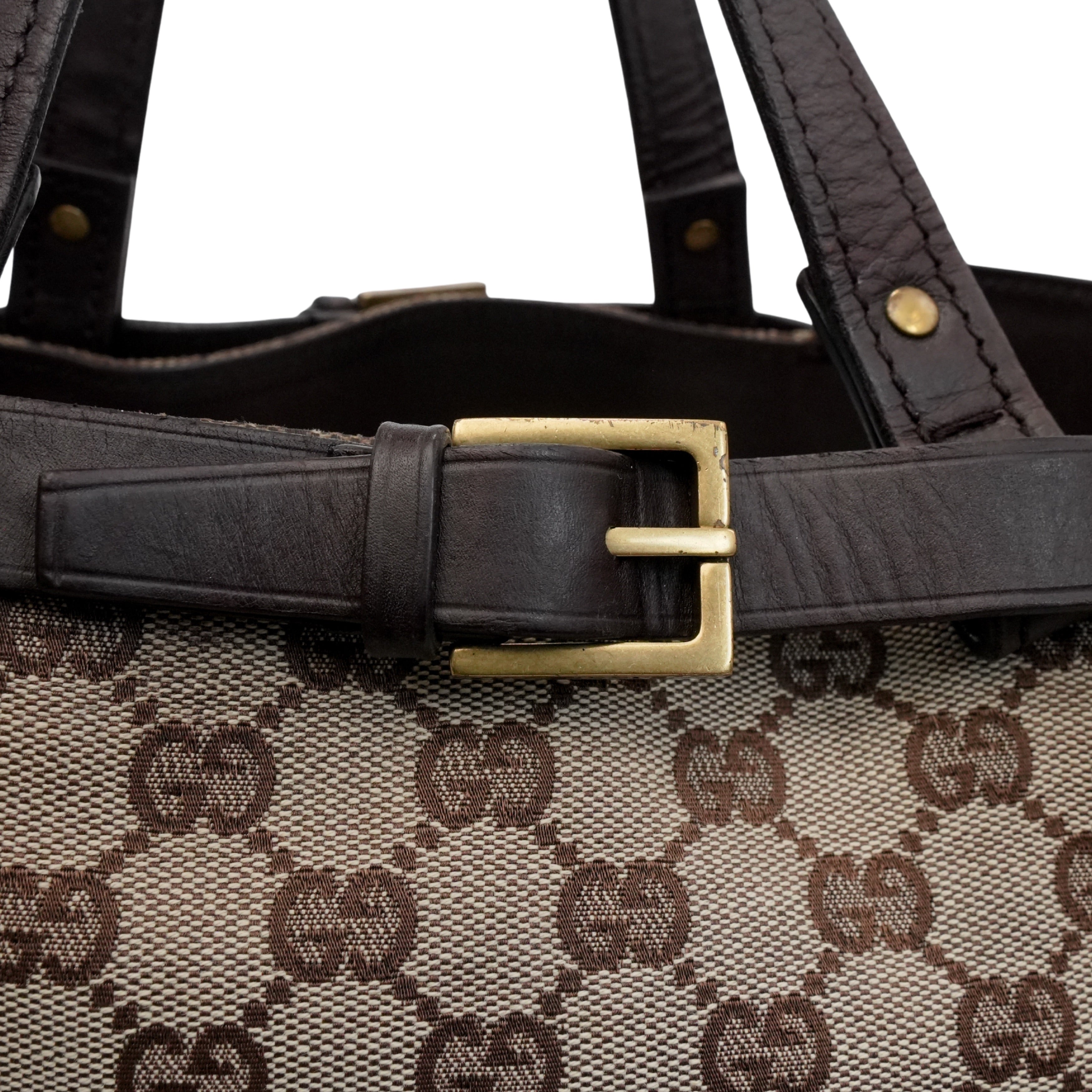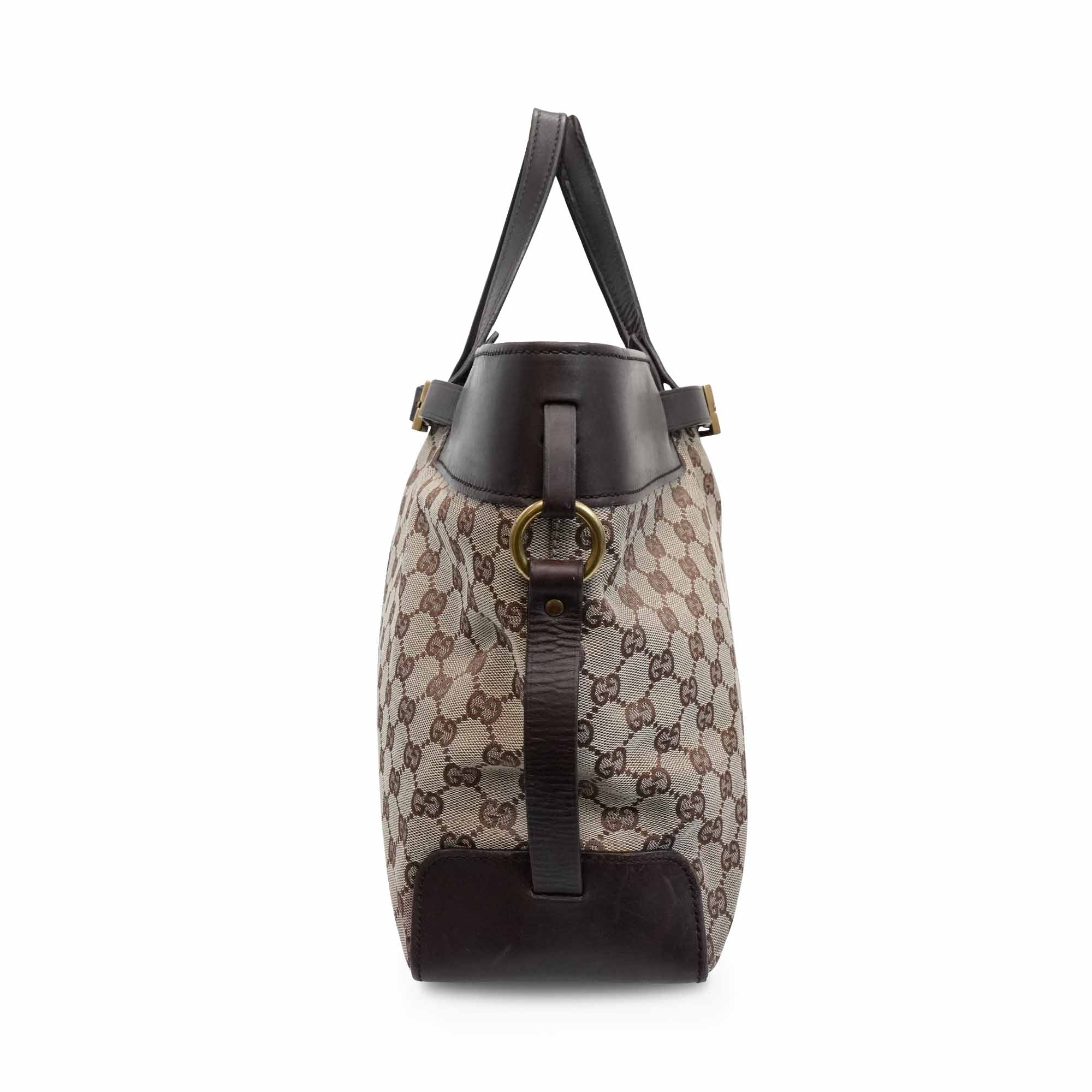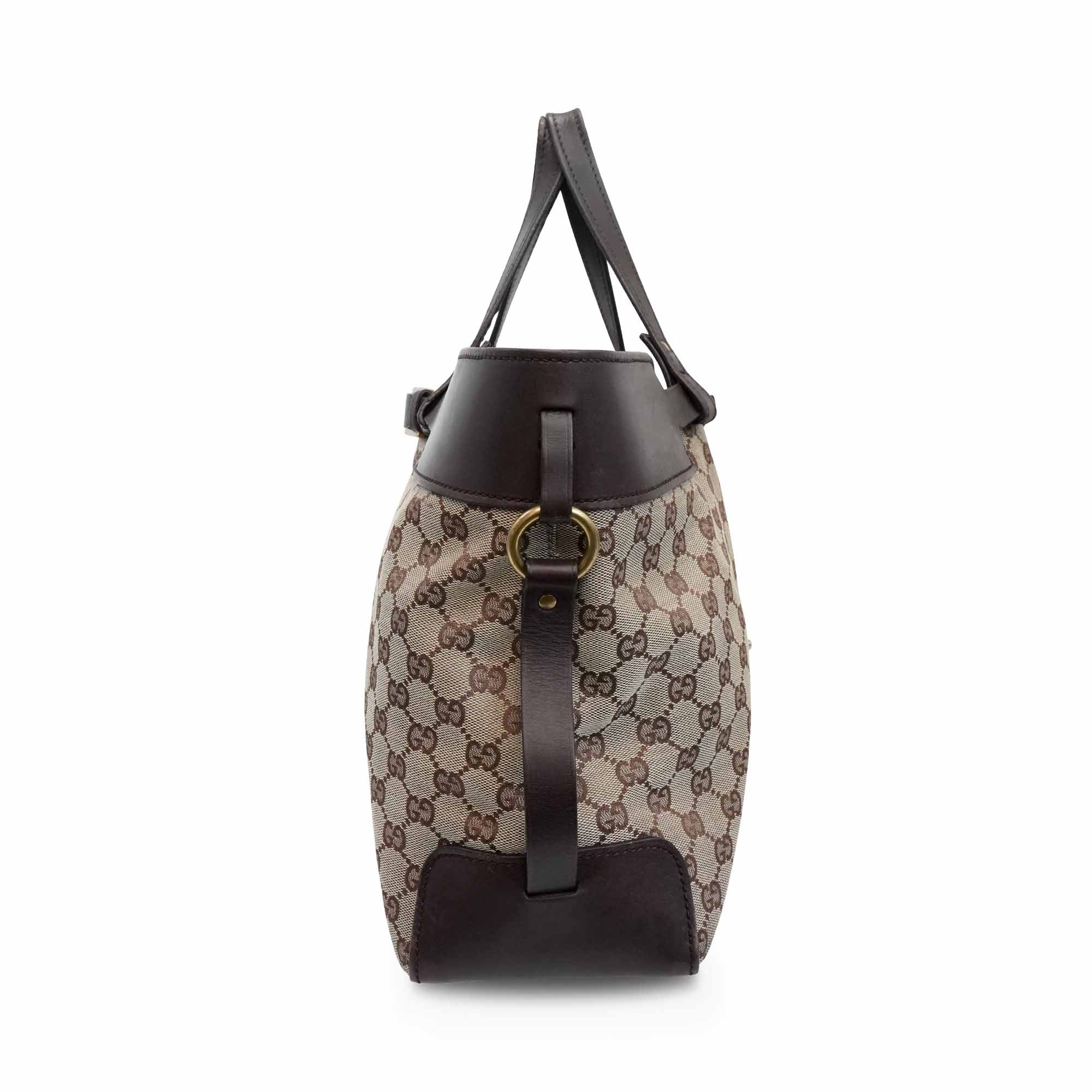 Gucci tote bag in beige and brown monogram canvas with dark brown leather accents, aged gold hardware, and decorative belt strap detail. Features a brown fabric lining with interior zip pocket.