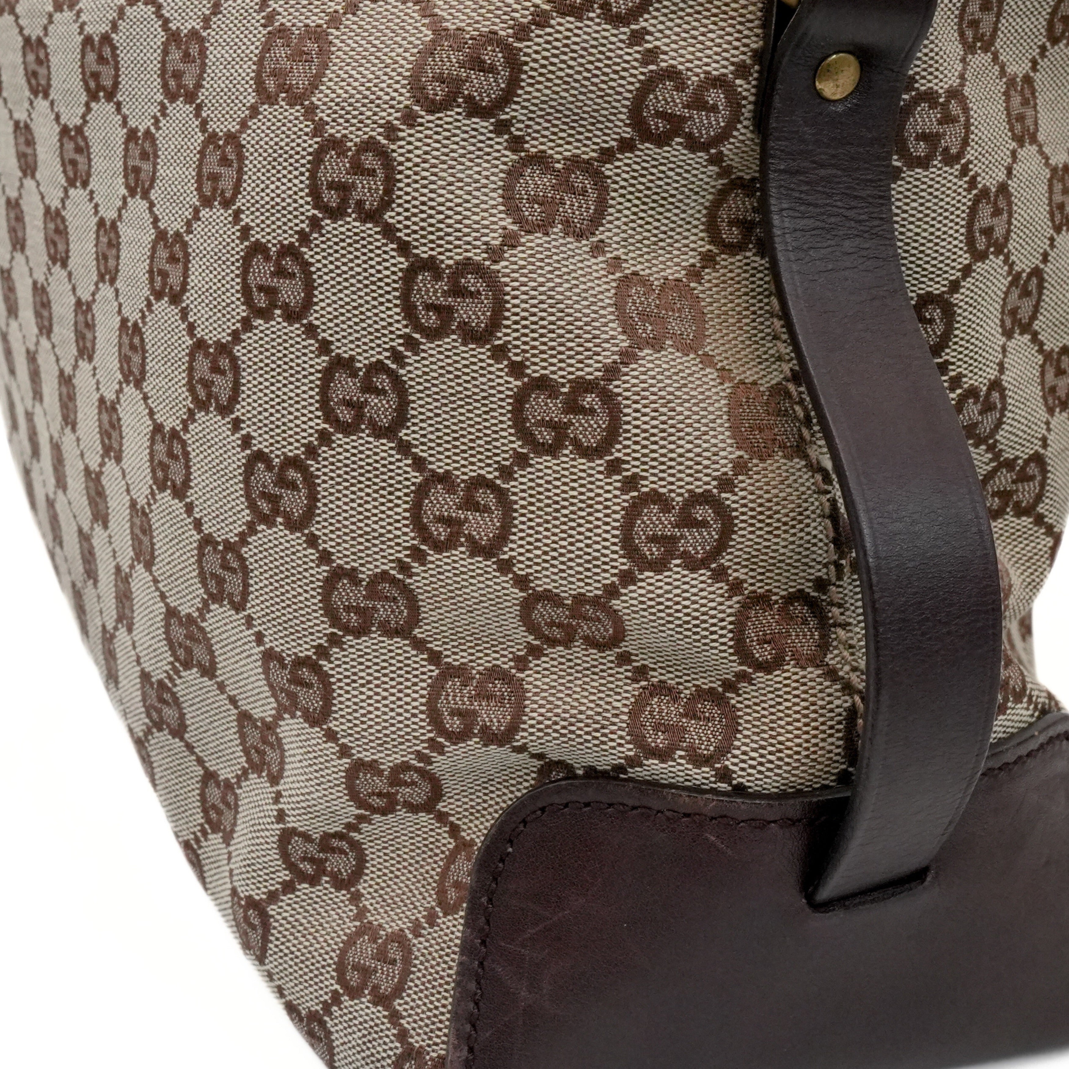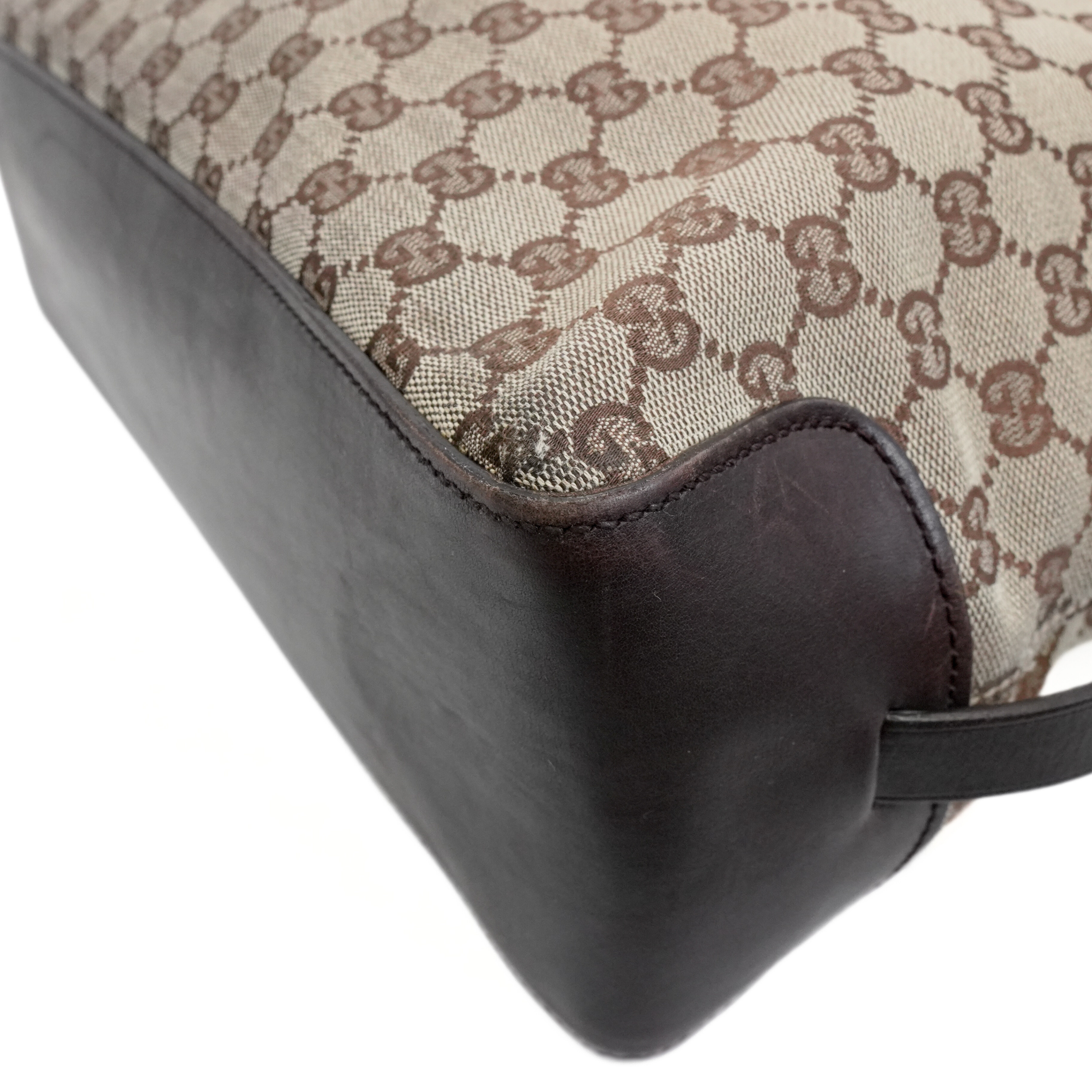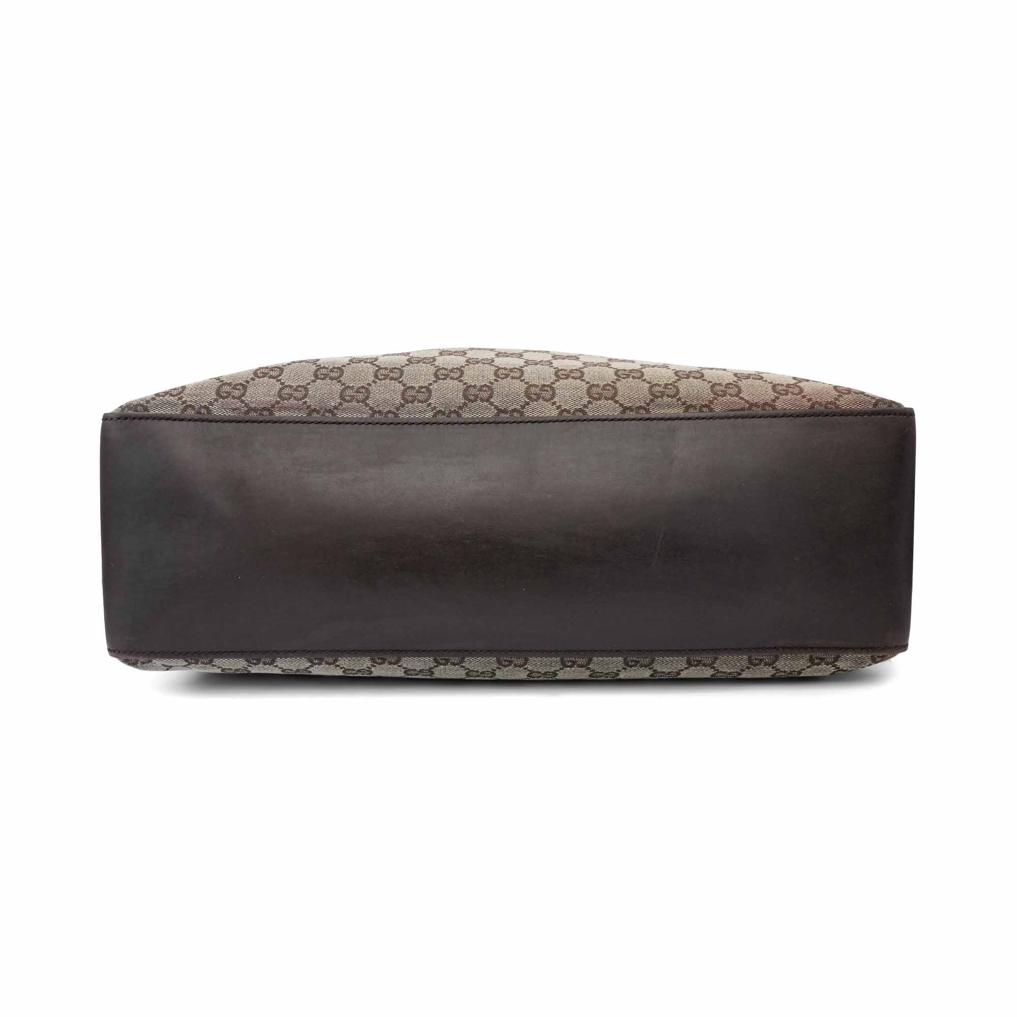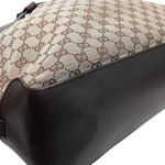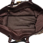 Gucci tote bag in beige and brown monogram canvas with dark brown leather accents, aged gold hardware, and decorative belt strap detail. Features a brown fabric lining with interior zip pocket.