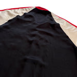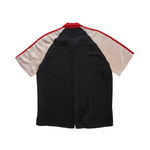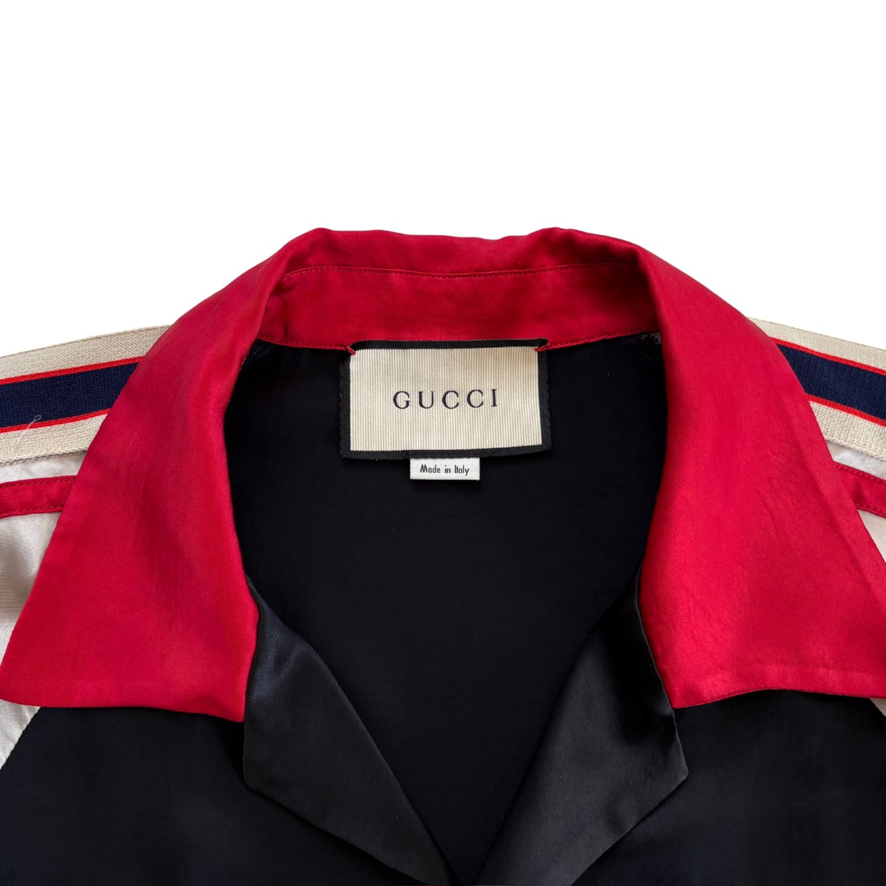 Gucci short sleeve button down shirt in black and cream with red trim and collar, chest patch pocket and elastic logo sleeve racing stripes.