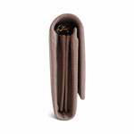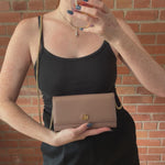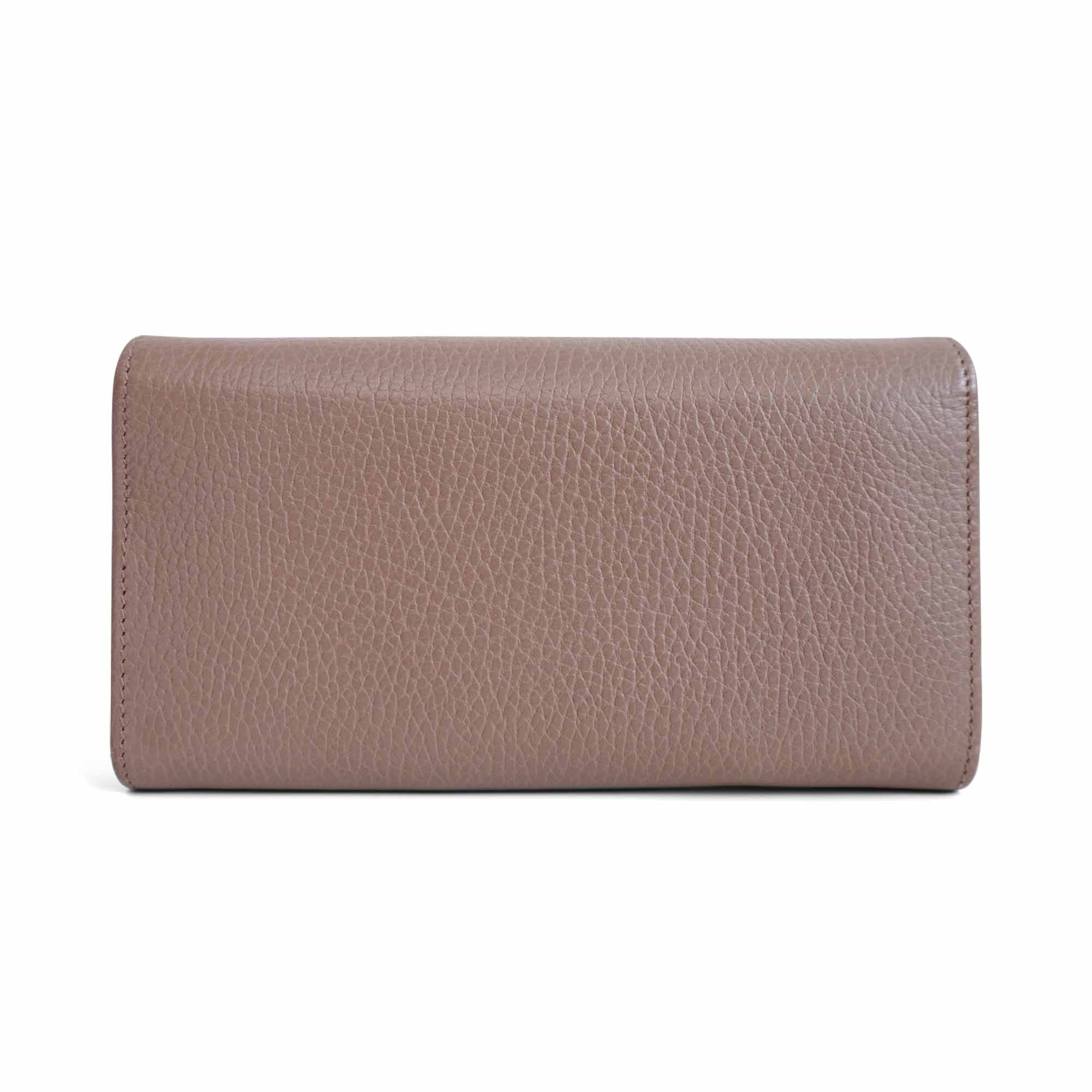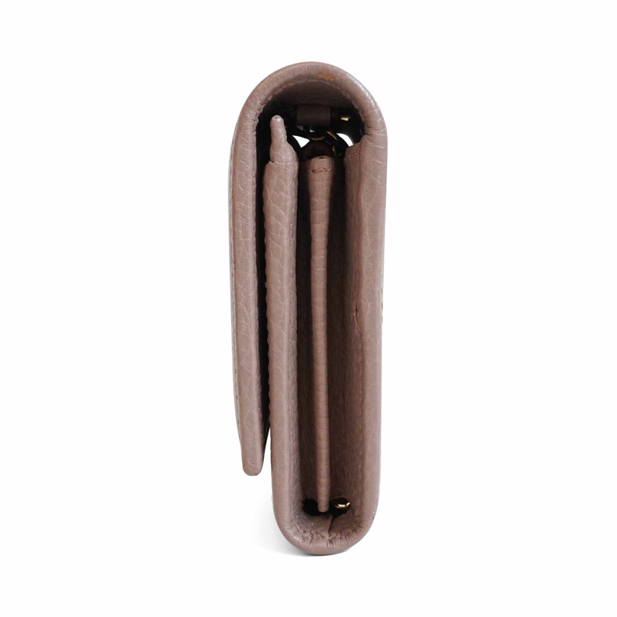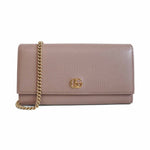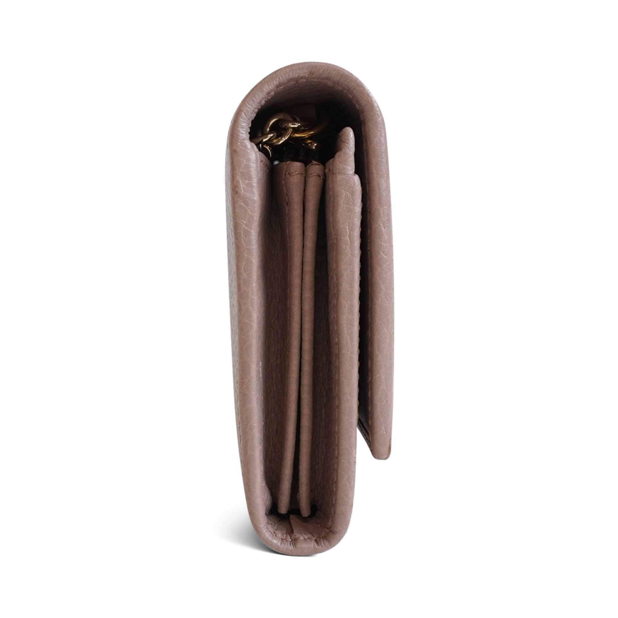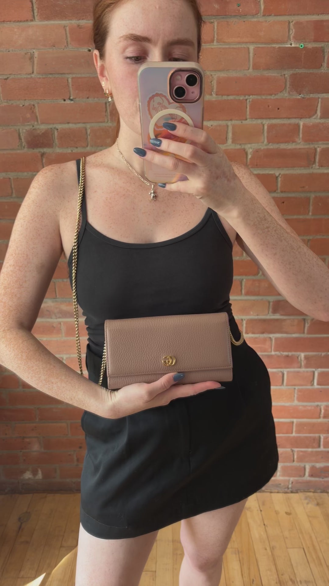 Gucci wallet on chain in tan pebbled leather with a gold 'Marmont' logo on the front, a top flap opening with a snap closure, and a removable gold crossbody chain.