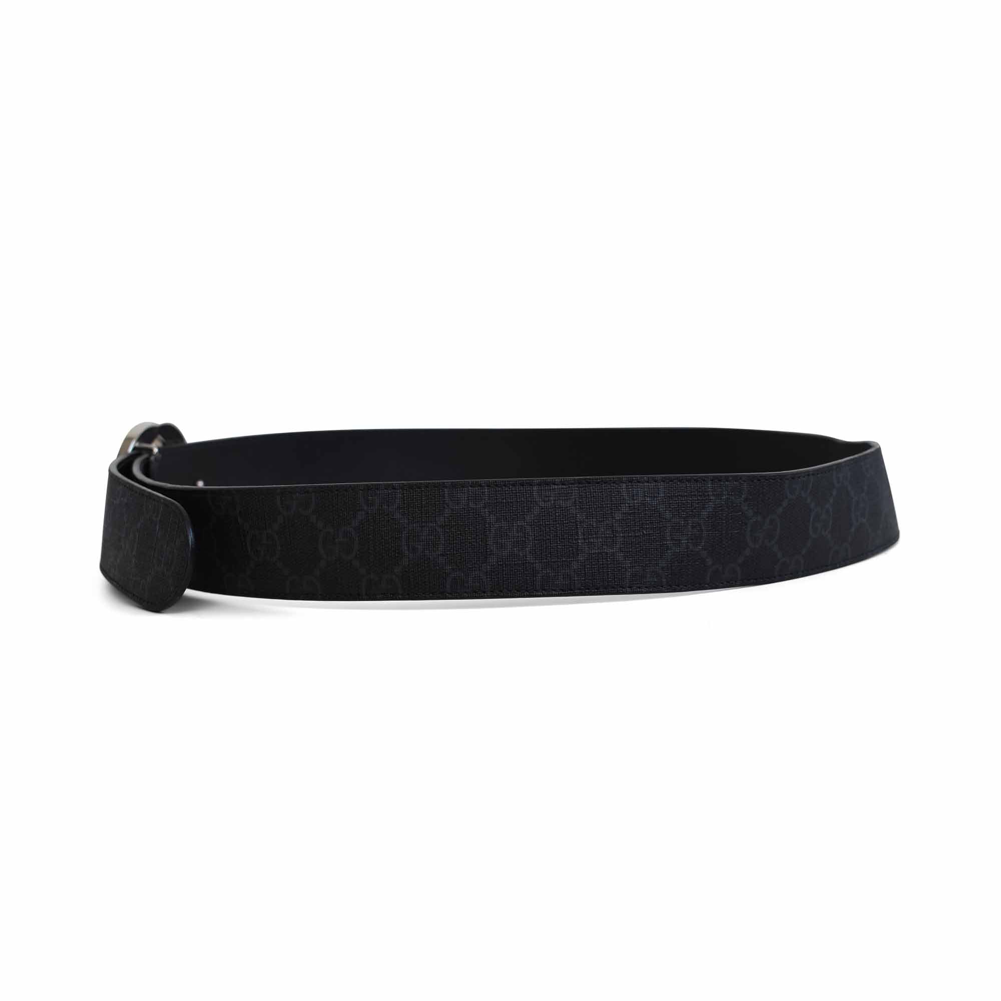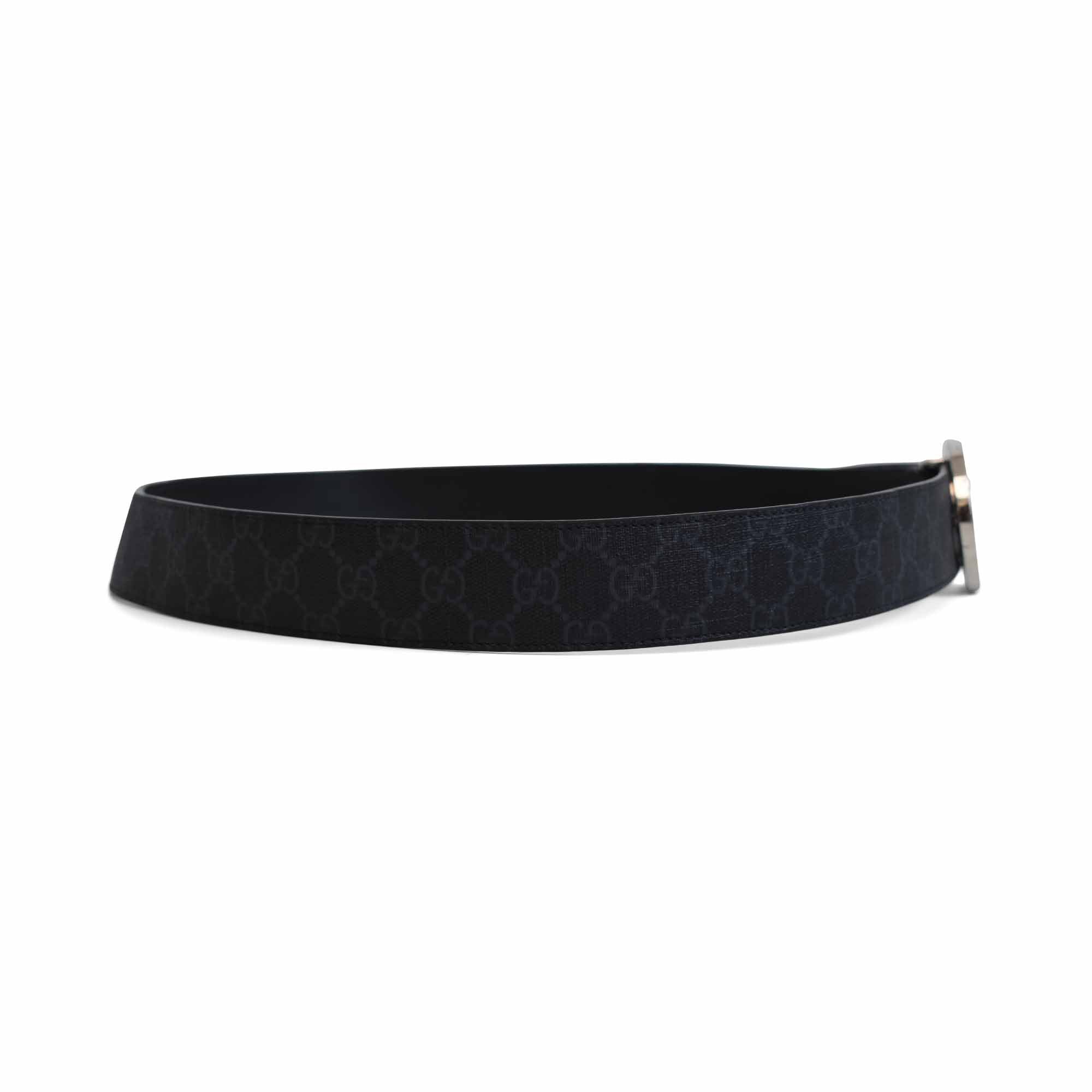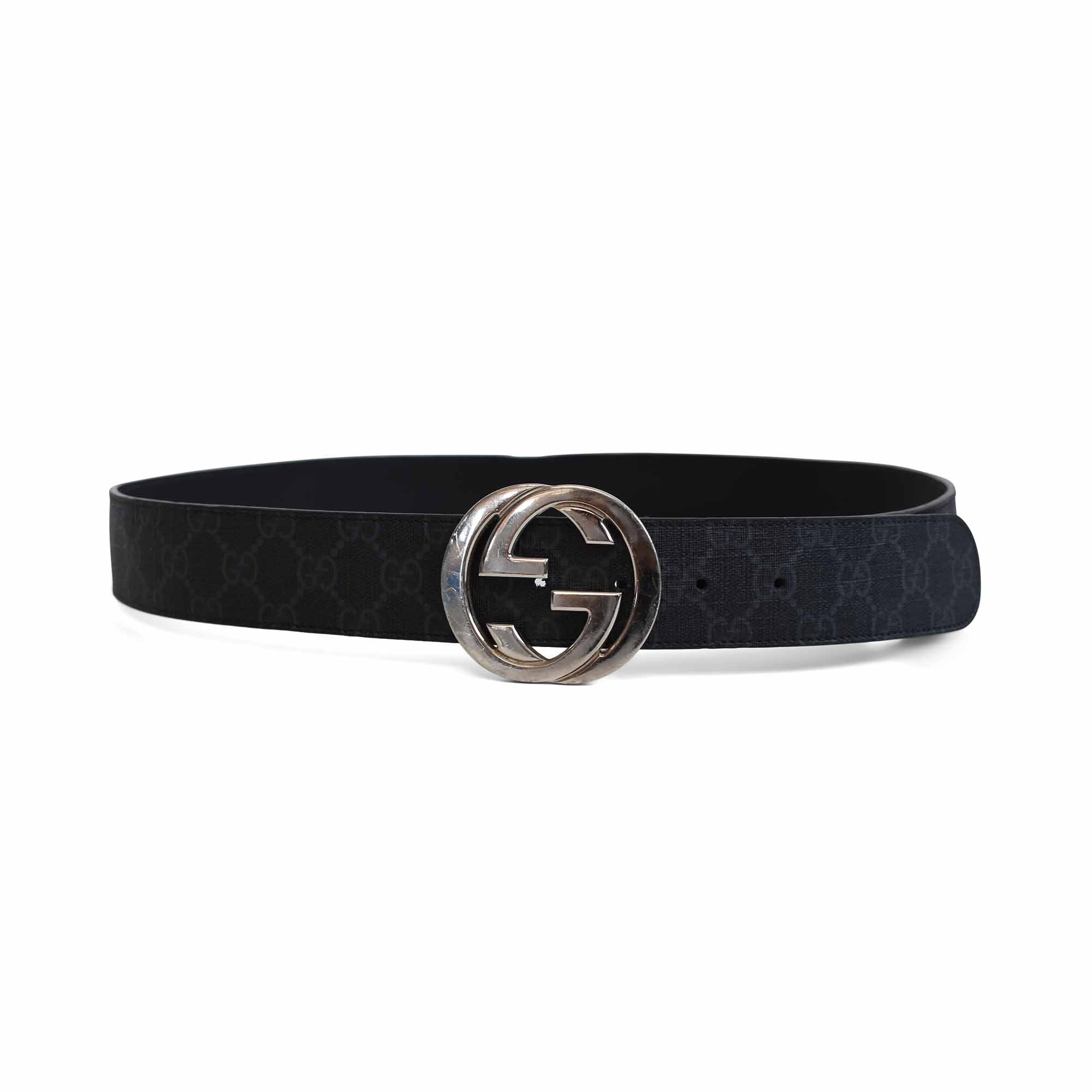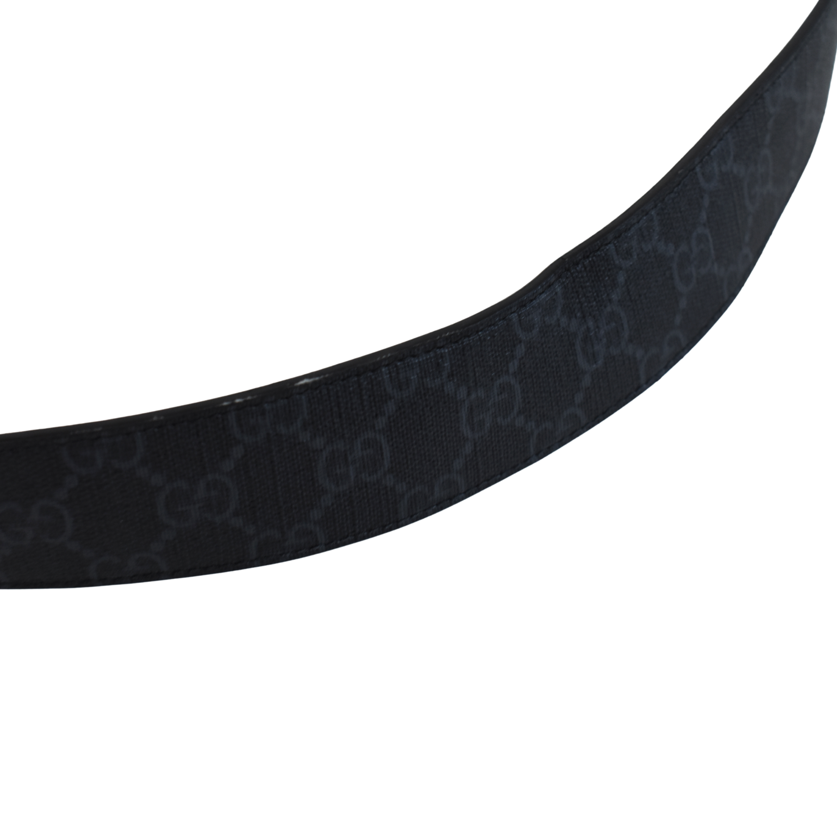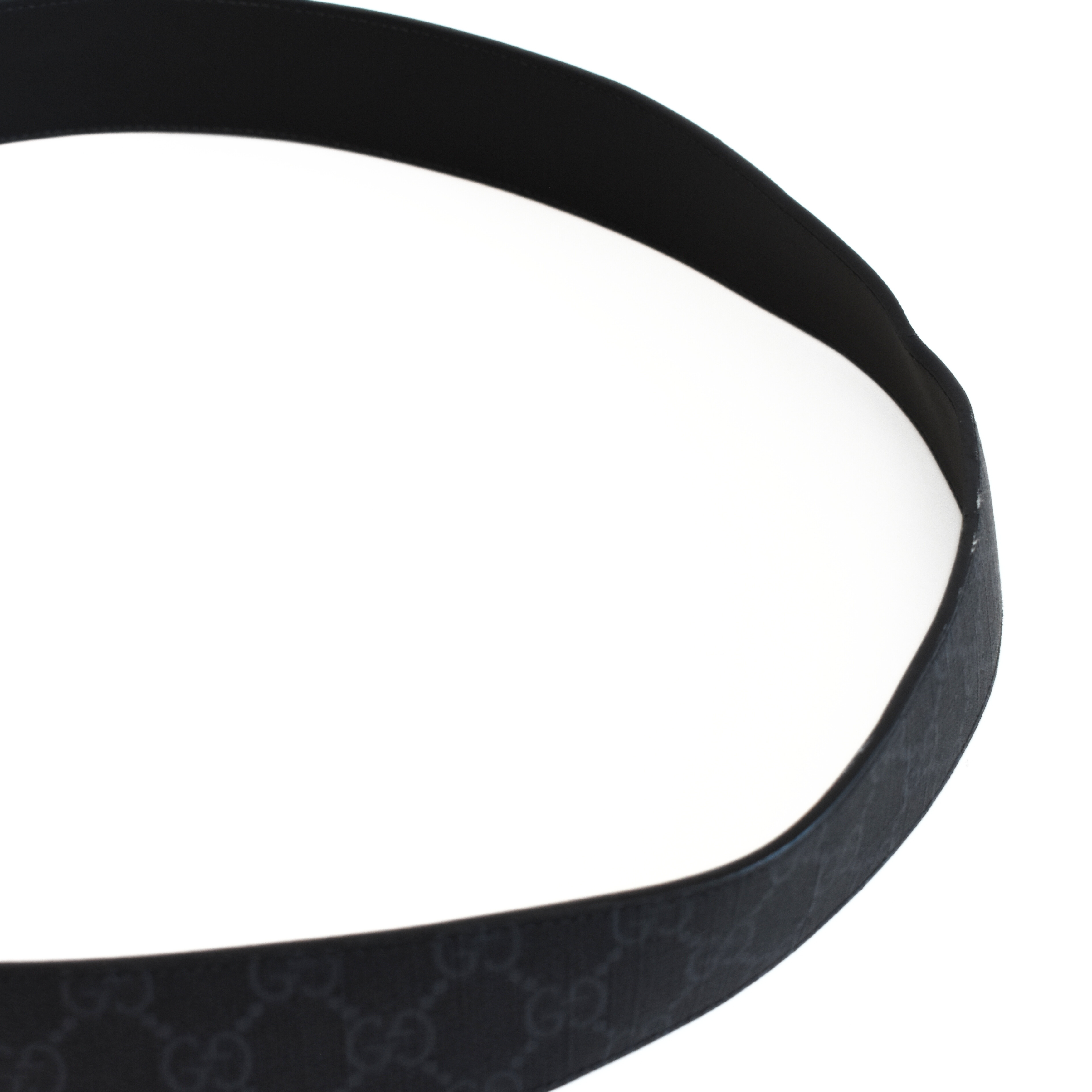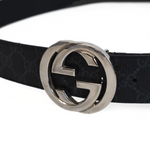 Gucci belt in black and grey 'GG Supreme' coated canvas with a black leather interior and a silver 'interlocking G' buckle.
