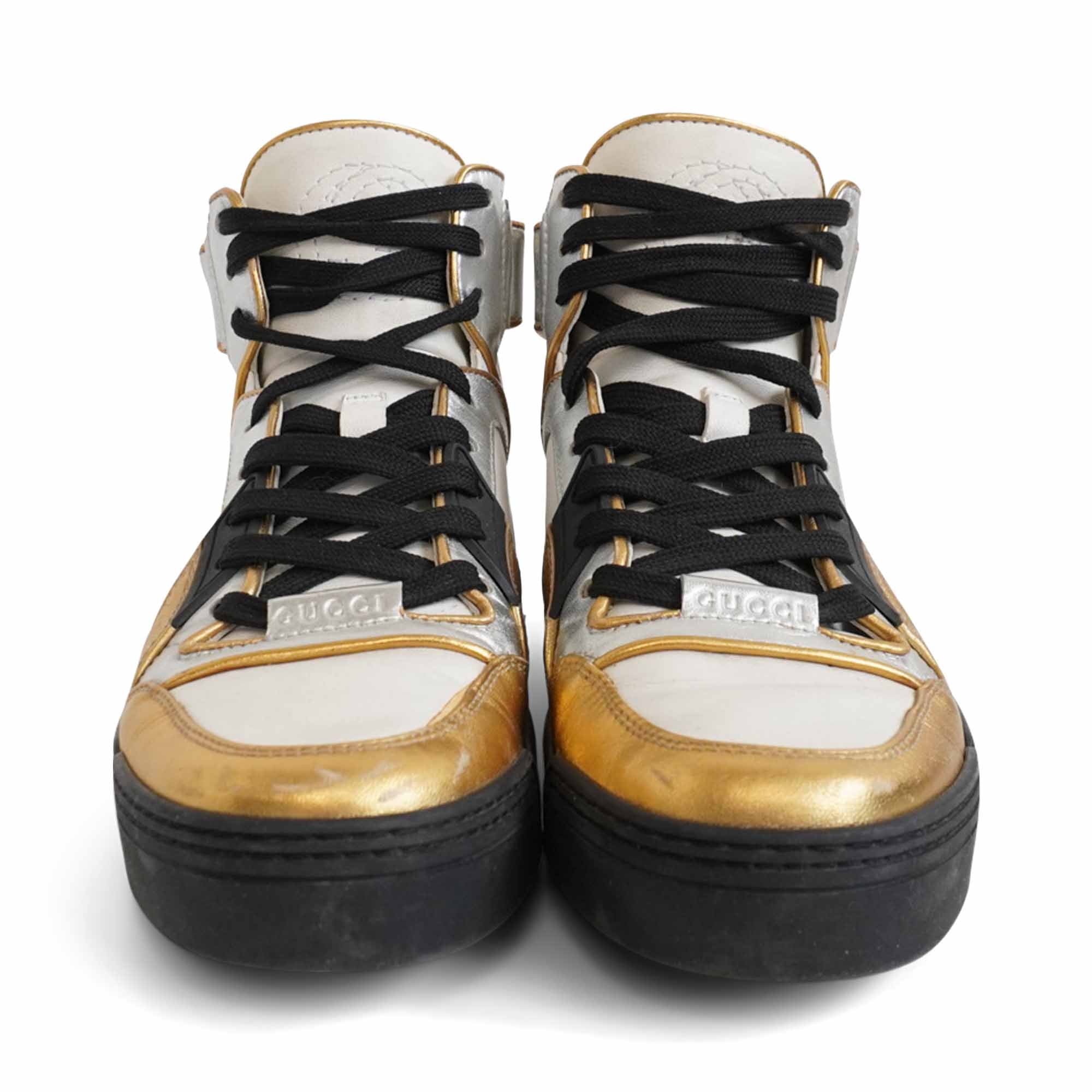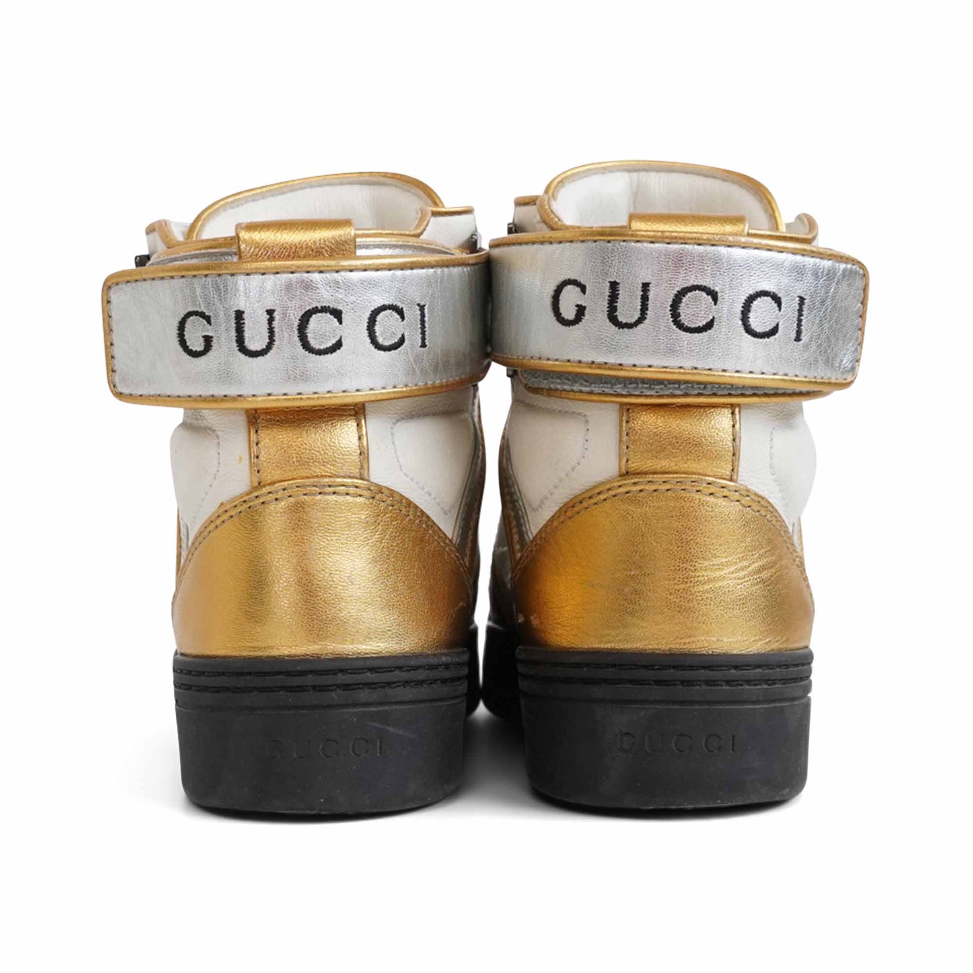 Gucci 'Tri Color' vintage hightop sneakers in white leather with silver and metallic gold leather panels, black rubber soles and black flat laces. Featuring a silver logo velcro strap on the back ankle.