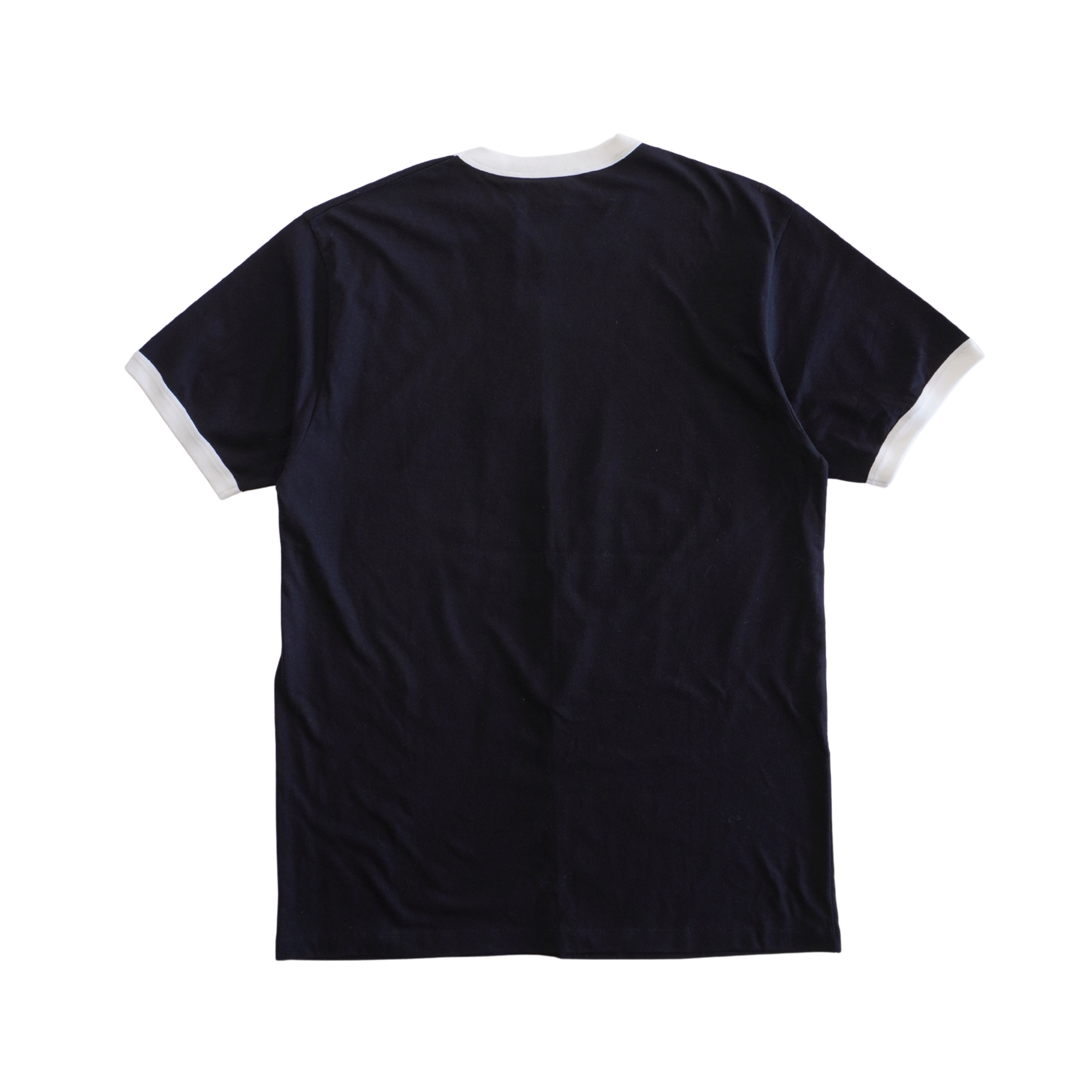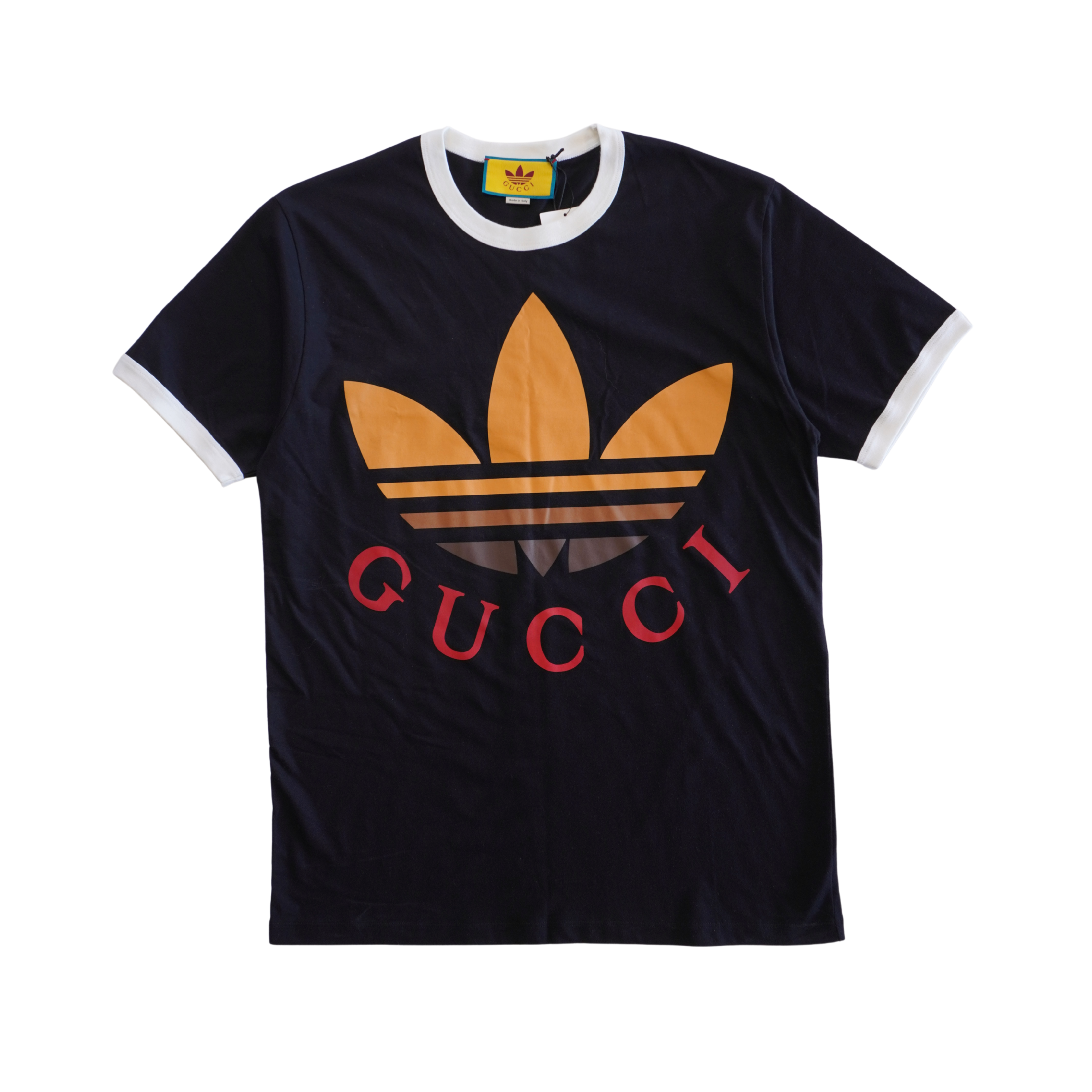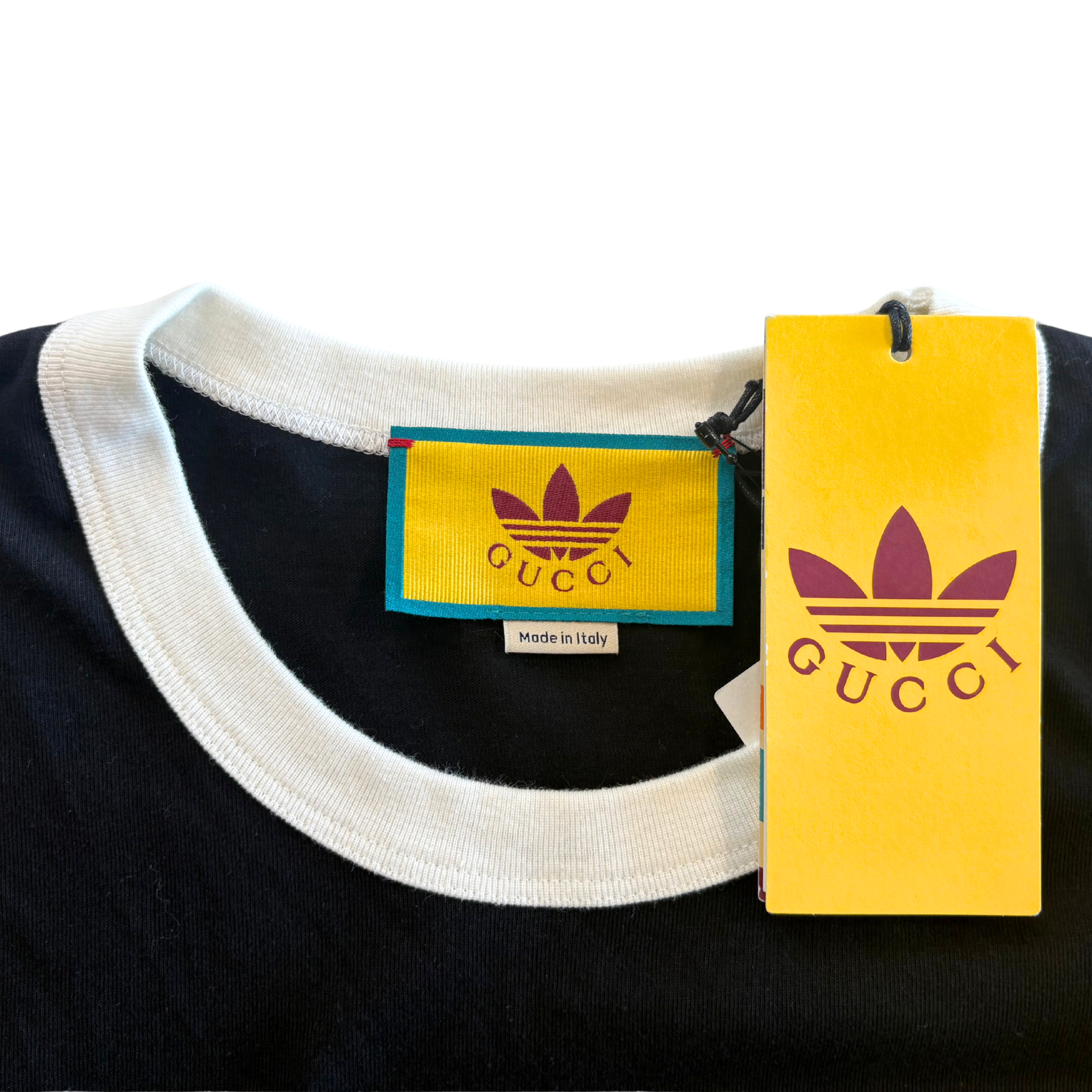 Gucci x Adidas ringer t-shirt in black cotton with a large logo graphic on the chest and white trim at the collar and sleeves.