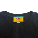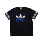 Gucci x Adidas 'Metamorfosi' T-shirt in black cotton with blue, yellow, red and white Trefoil and Gucci logo. Features white racing stripes on the sleeve and white and yellow writing across the back.