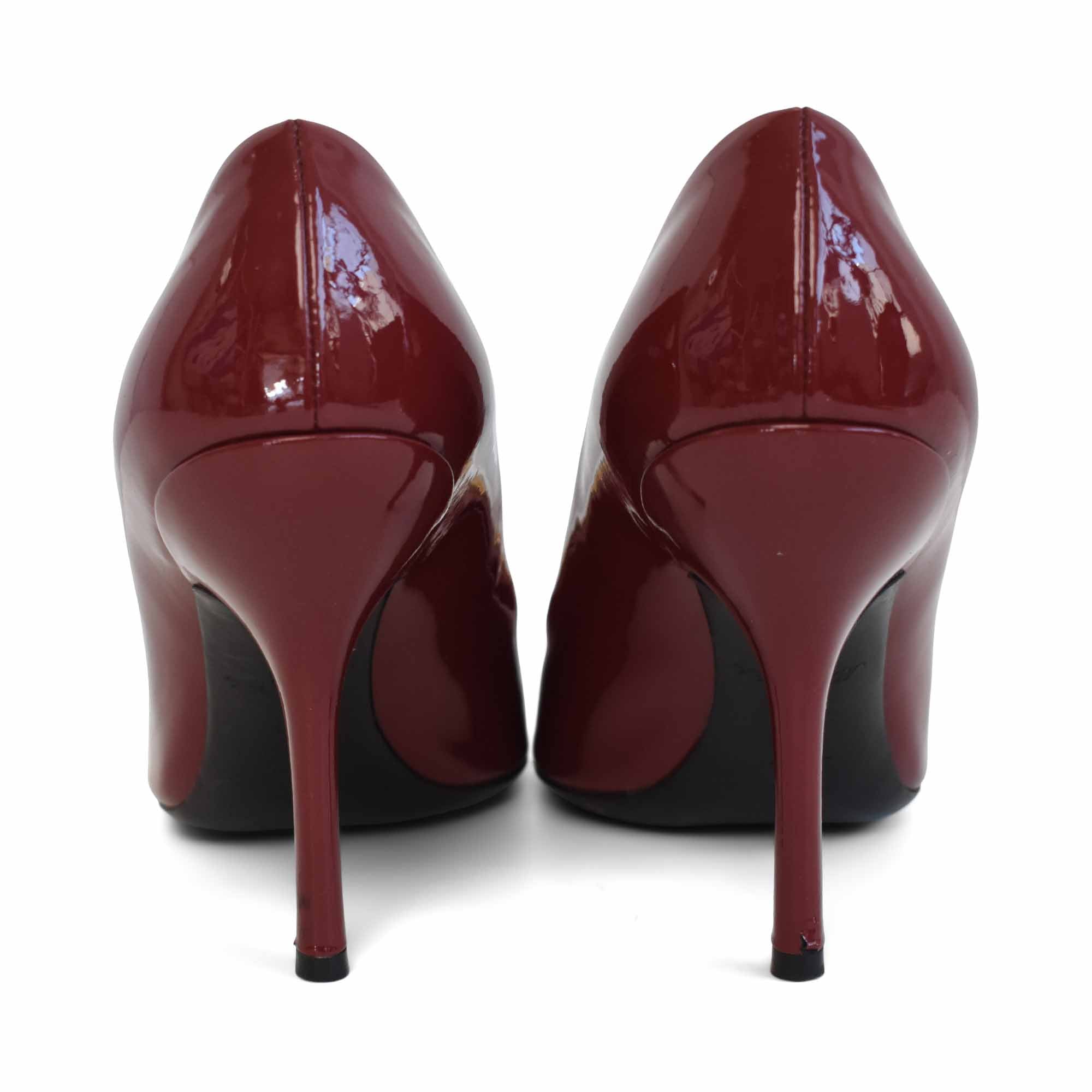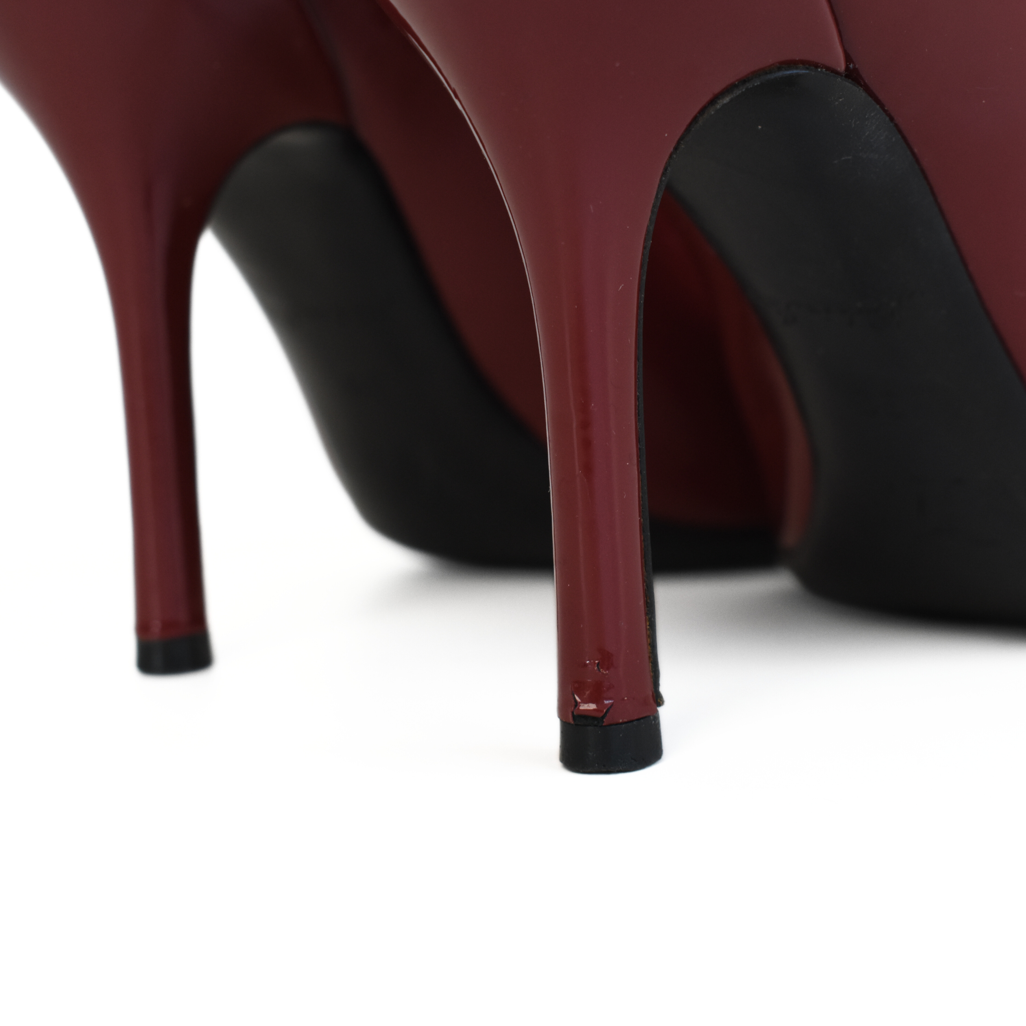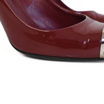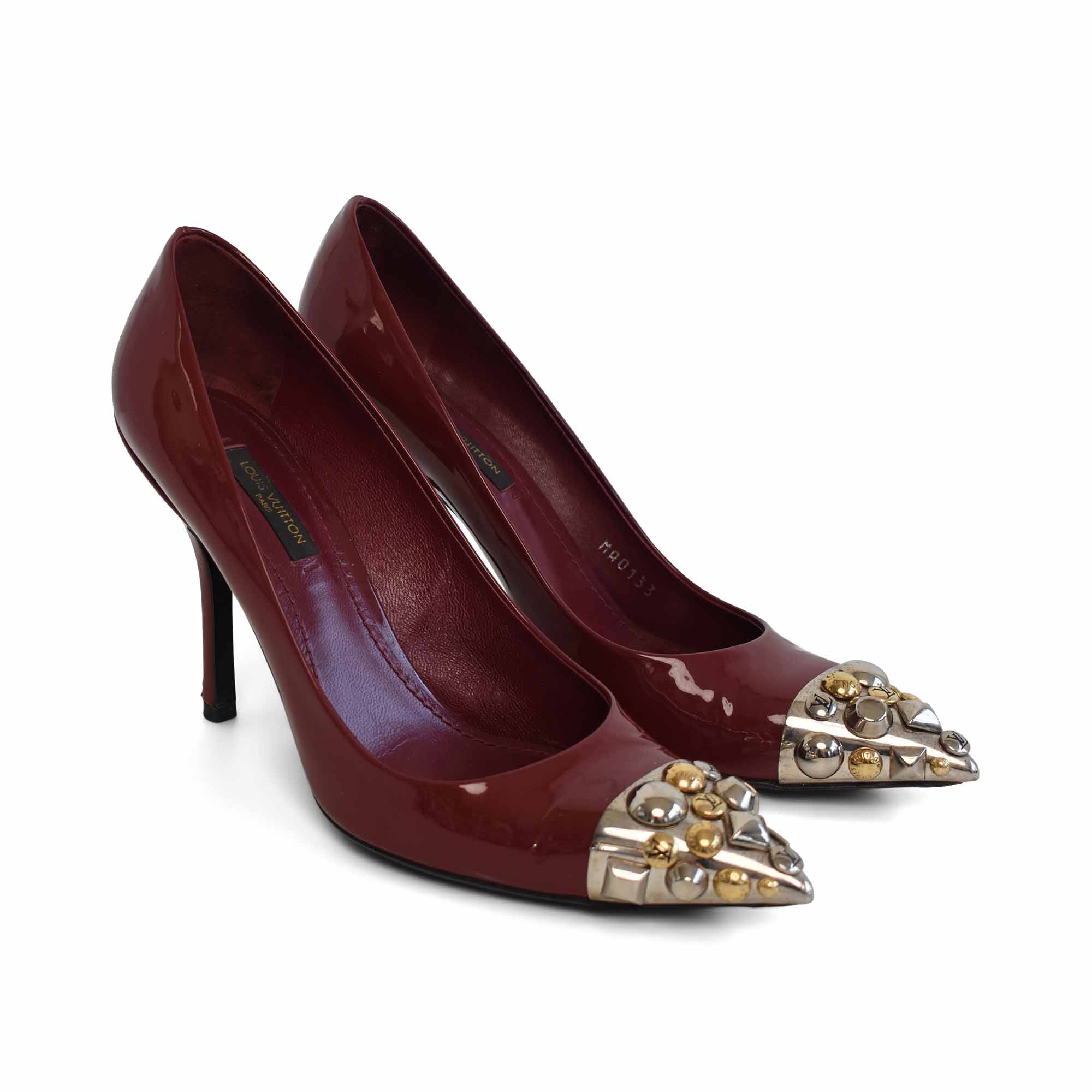 Louis Vuitton 'Bernice' pumps in maroon patent leather with a stiletto heel and a pointed toe featuring various silver and gold studs.