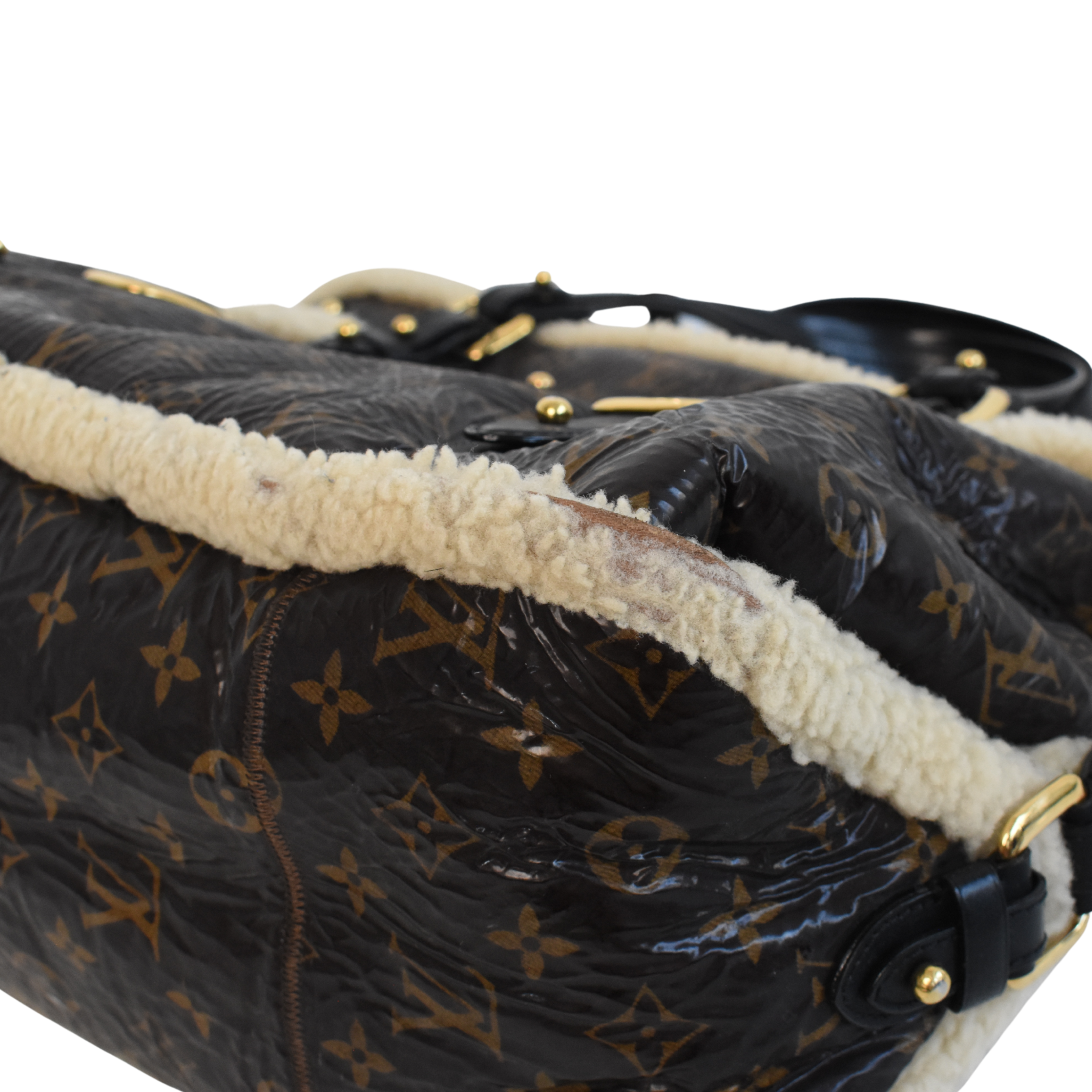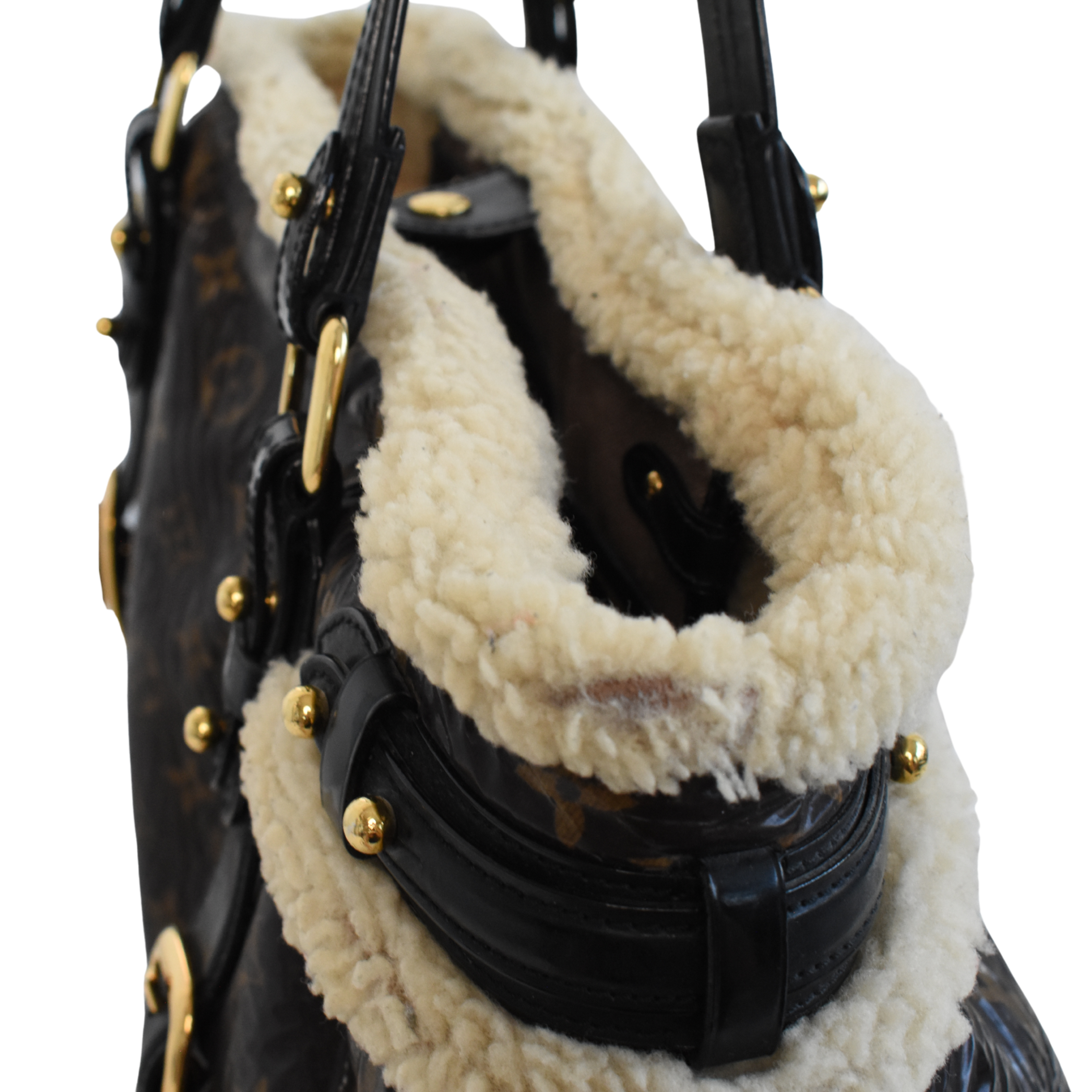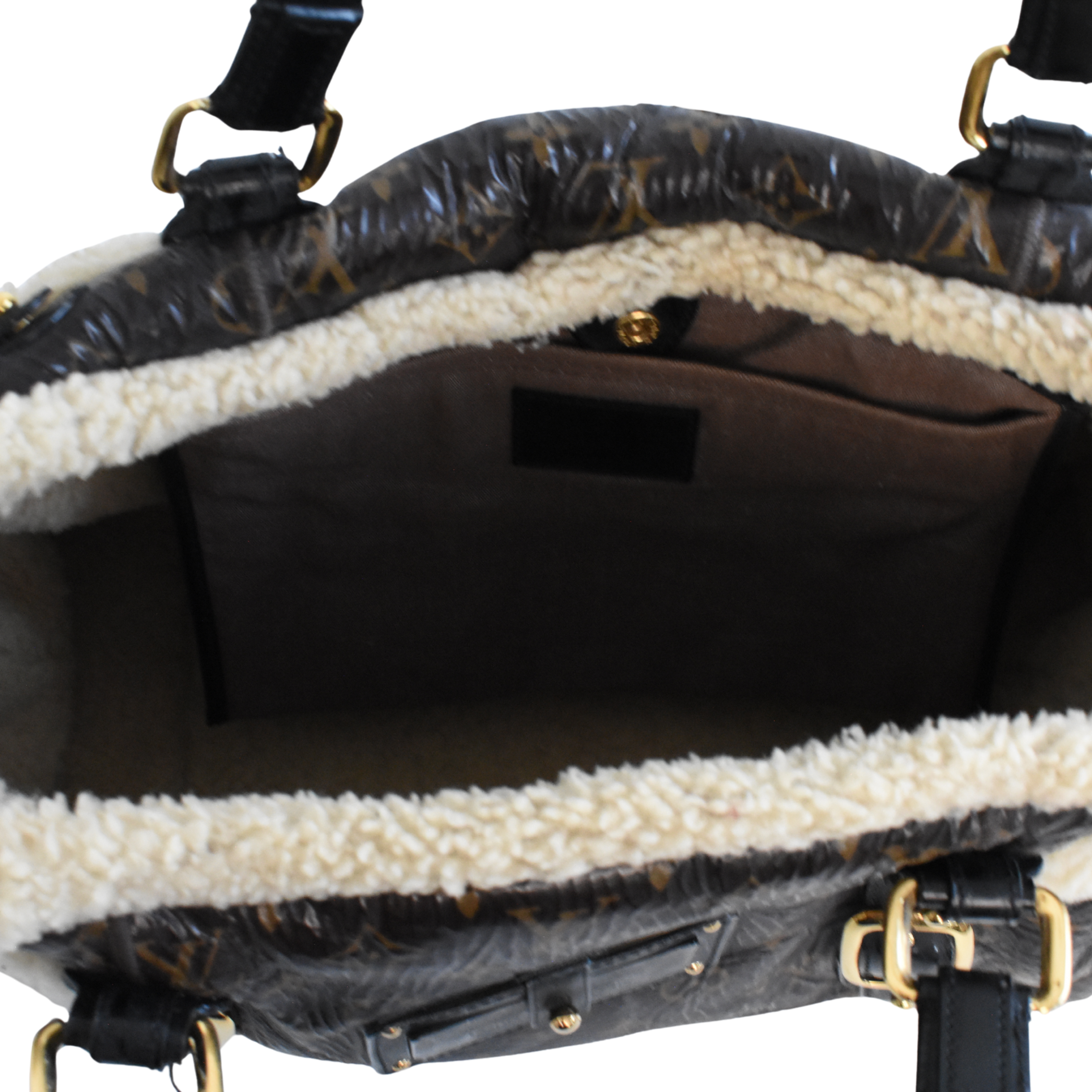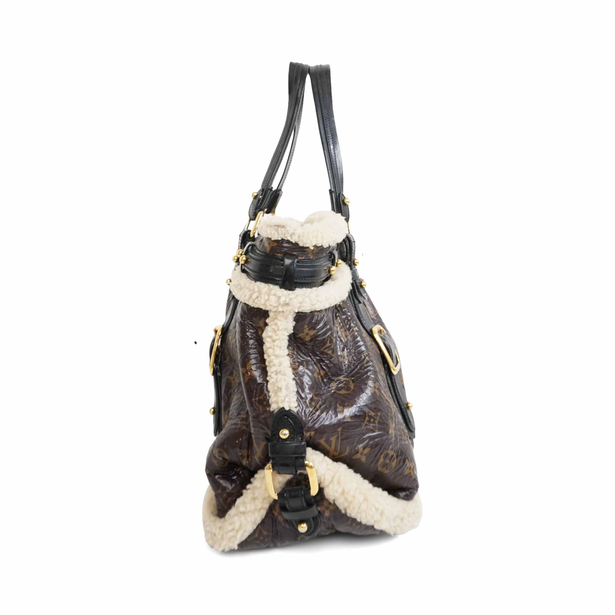 Louis Vuitton 'Thunder' shoulder bag in brown monogram patent with black patent leather accents and a beige shearling trim. The bag has dual top handles with gold buckle hardware, a top snap button closure, and a shearling lined interior with two canvas pockets.