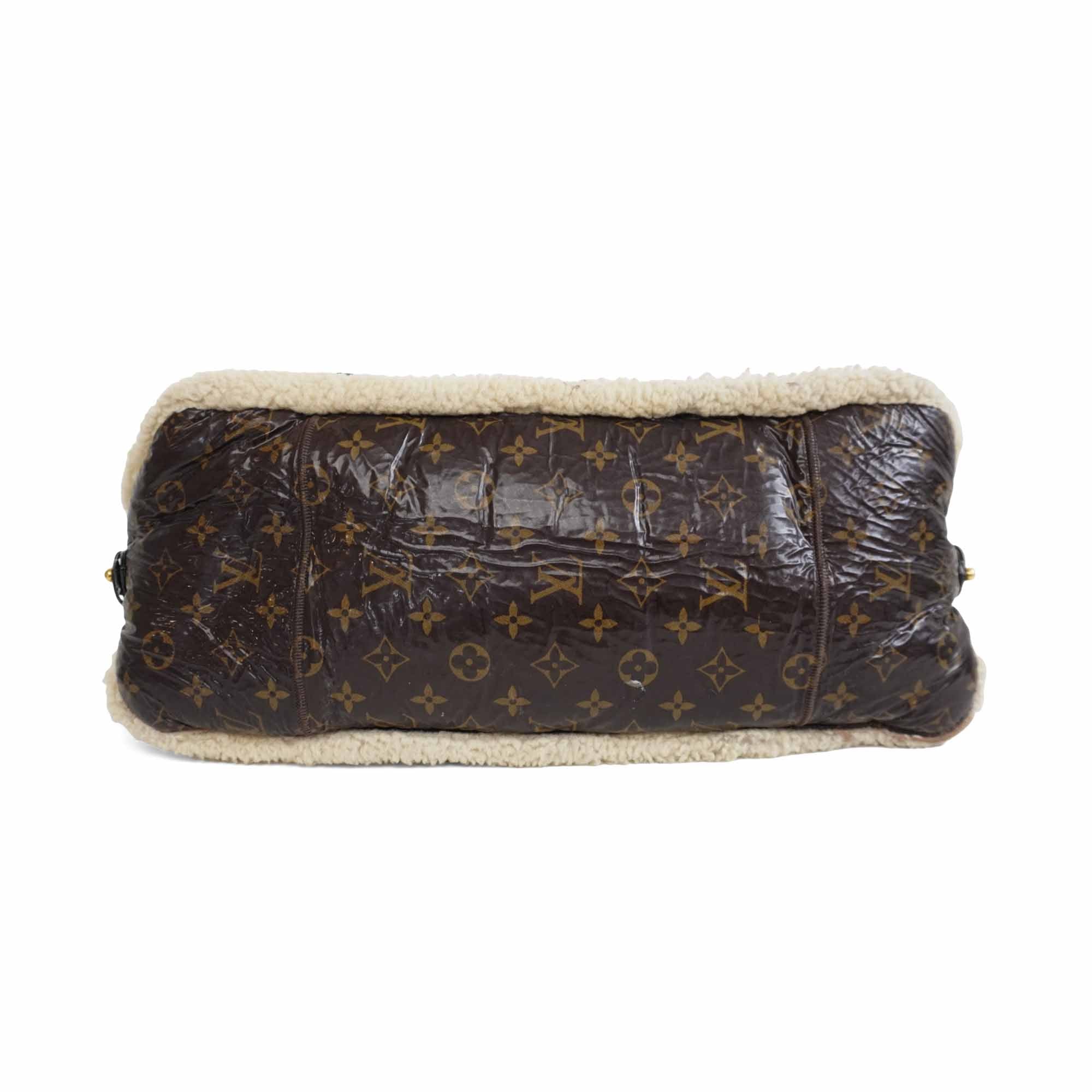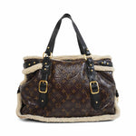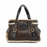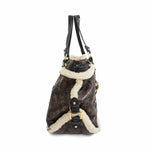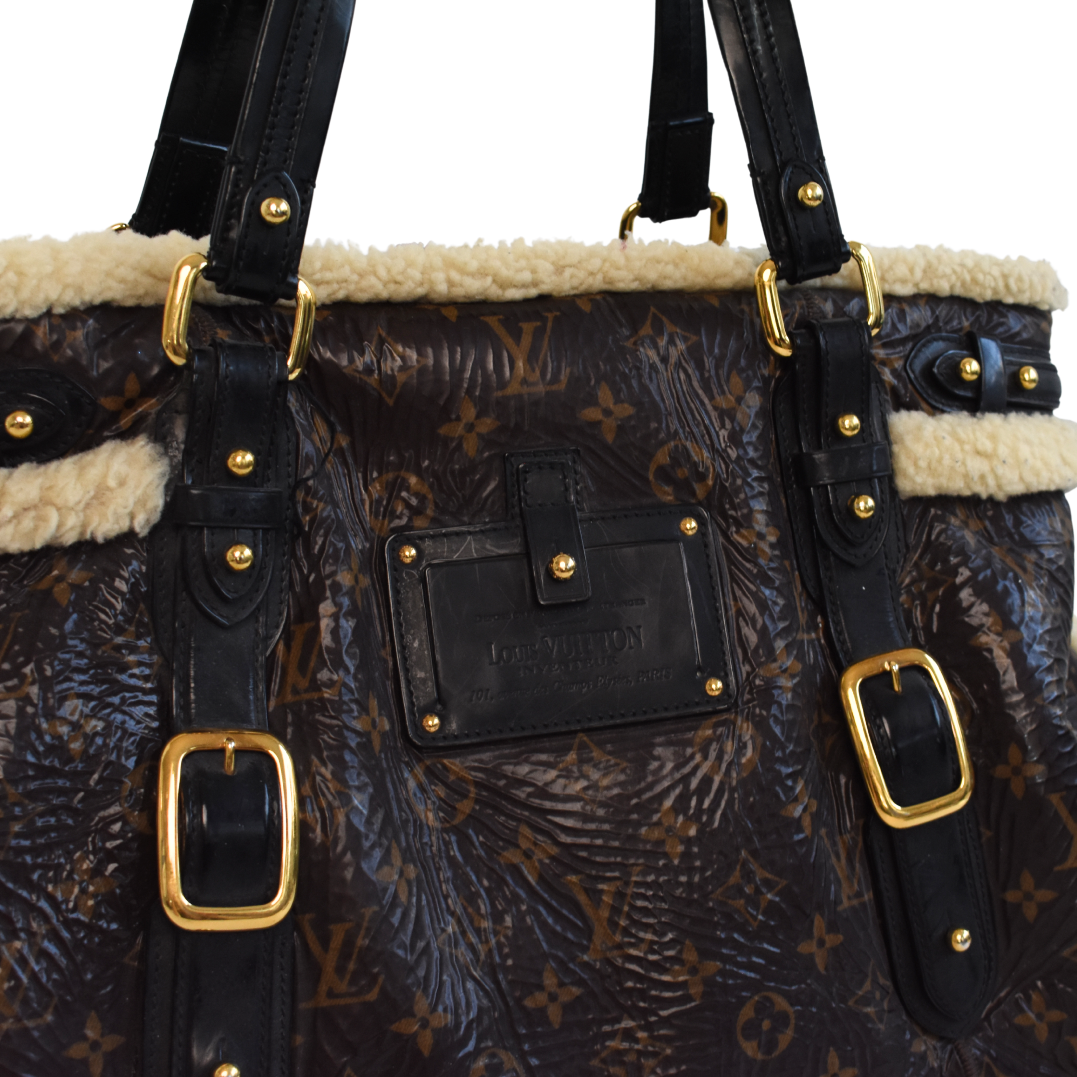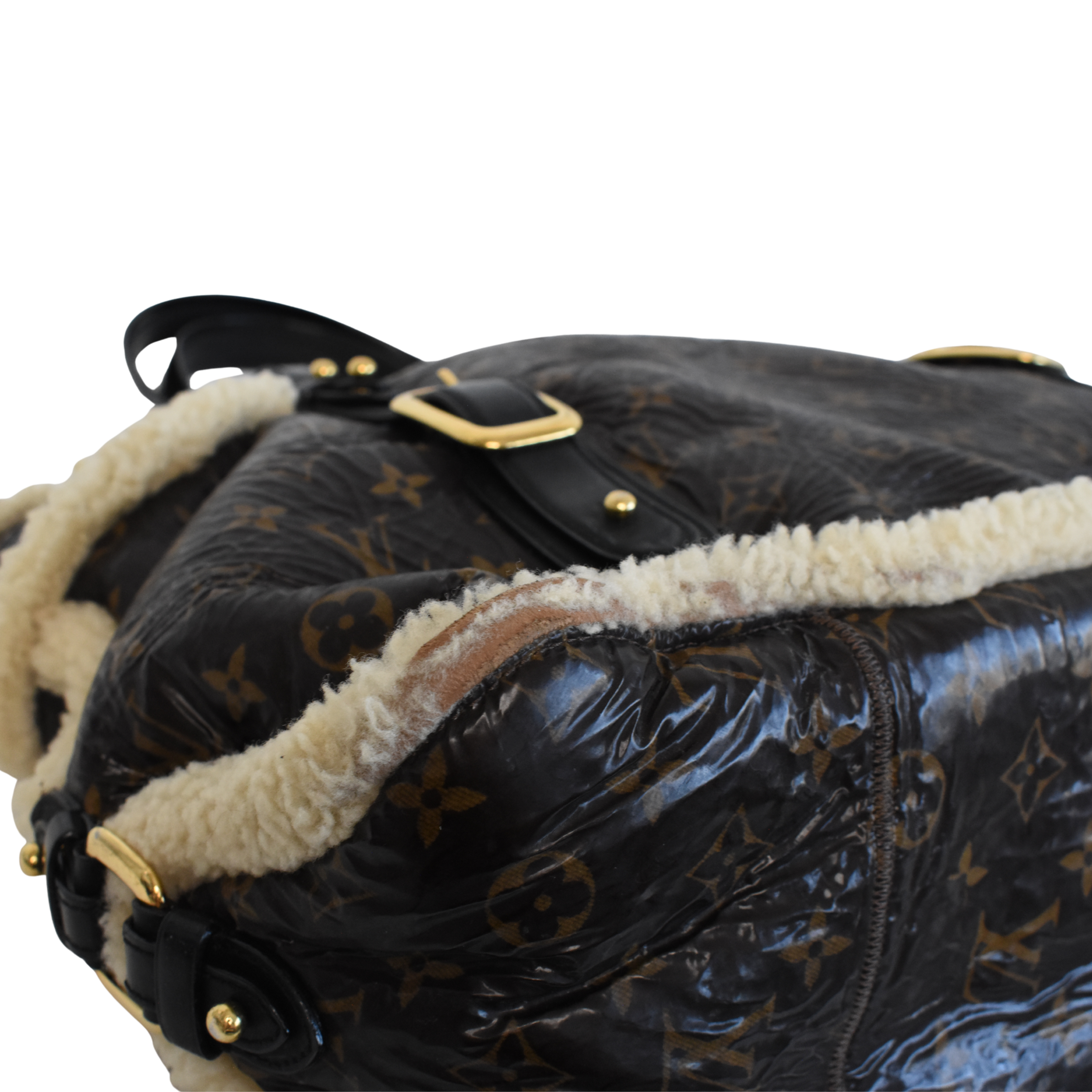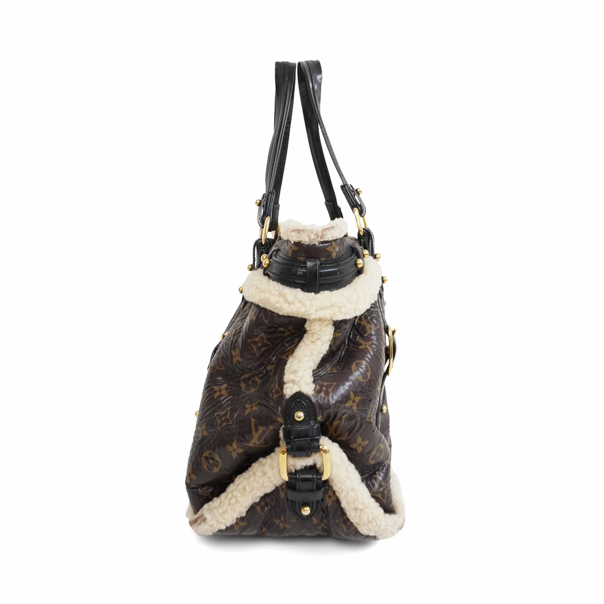 Louis Vuitton 'Thunder' shoulder bag in brown monogram patent with black patent leather accents and a beige shearling trim. The bag has dual top handles with gold buckle hardware, a top snap button closure, and a shearling lined interior with two canvas pockets.