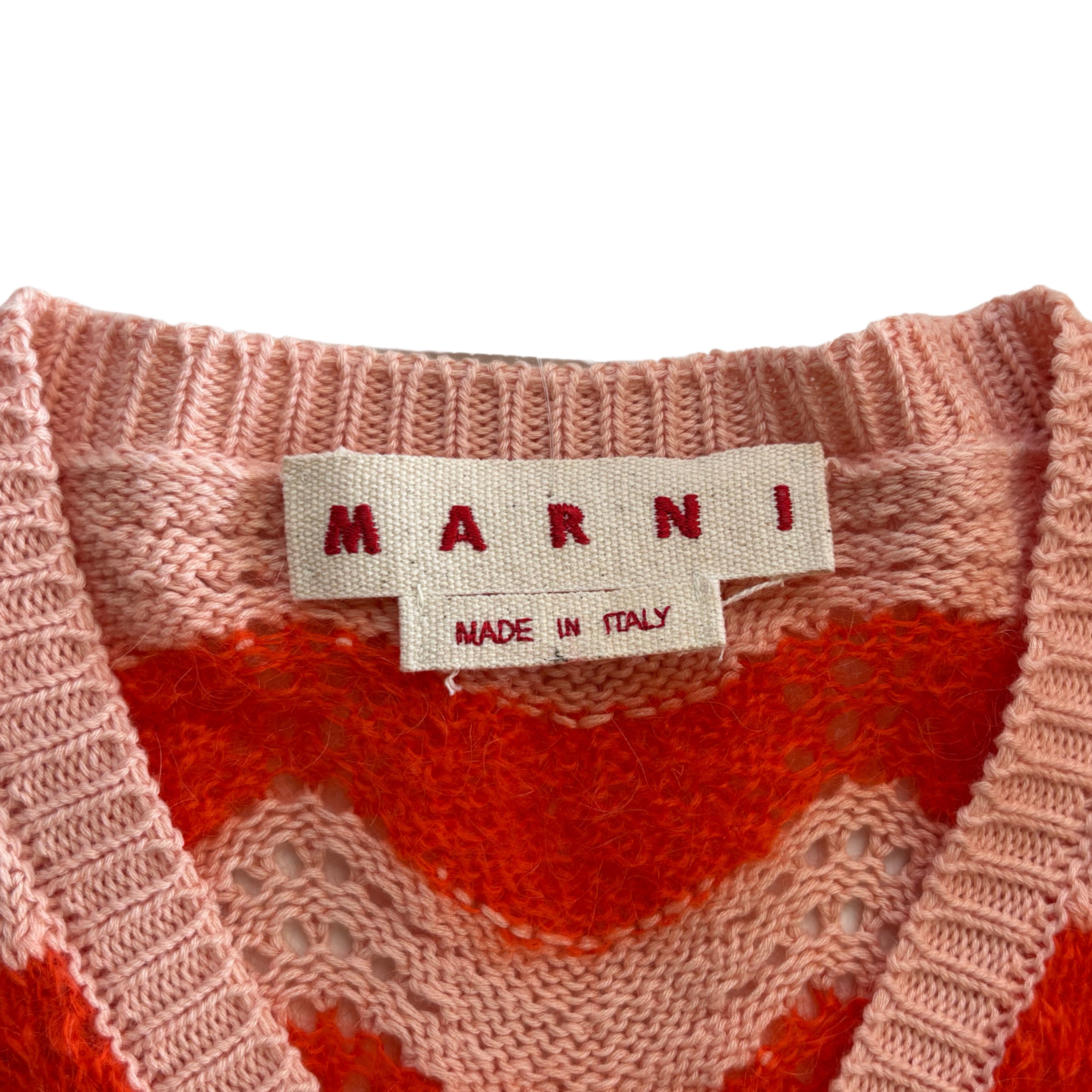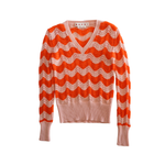 Marni knit sweater in orange and peach zig-zag knit cotton-mohair blend with a v-neckline and a thick trim.