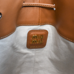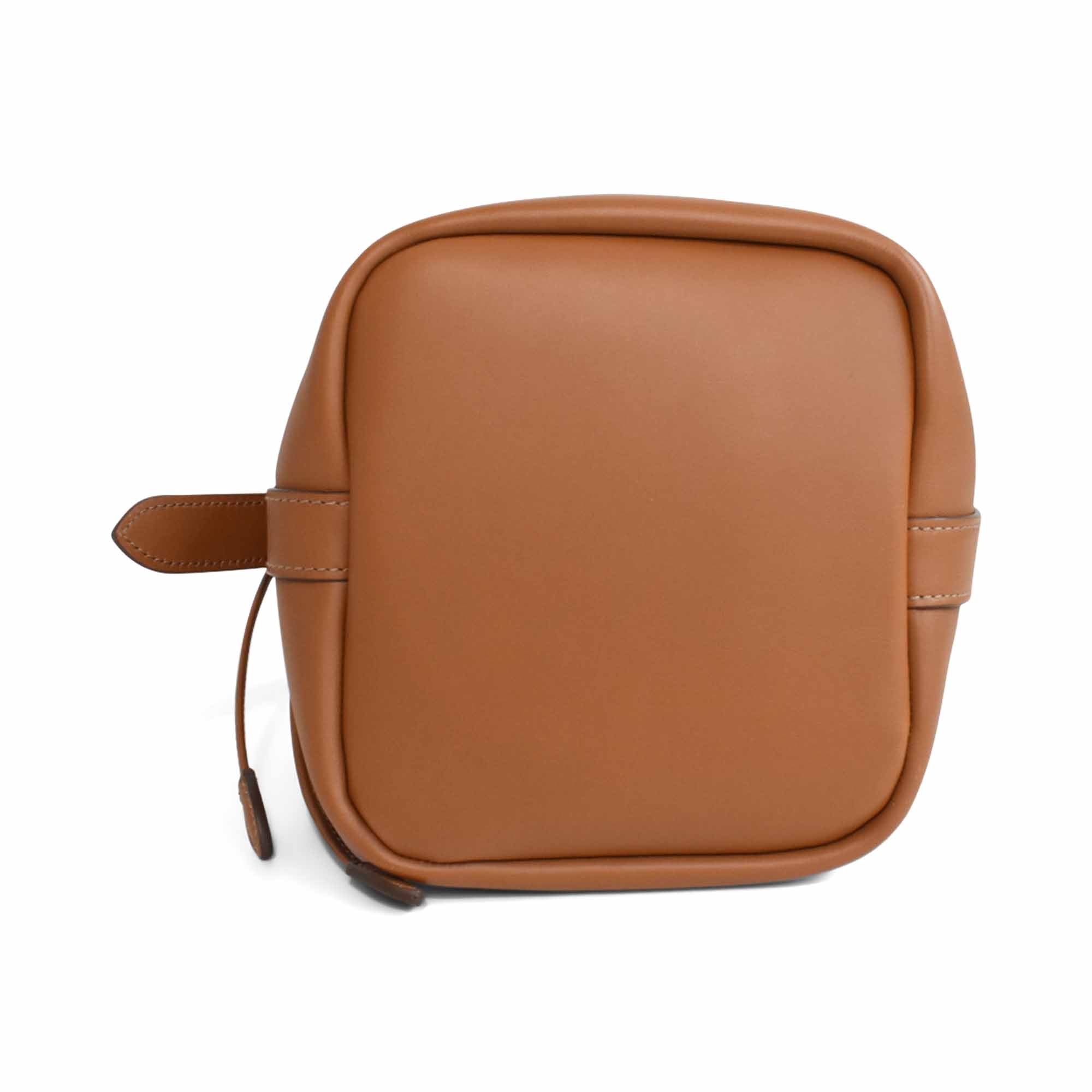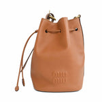 Miu Miu 'Softy' bucket bag in soft brown leather with an embossed logo on the front, an adjustable crossbody strap with gold buckle hardware, and a top drawstring closure revealing a beige canvas interior lining.