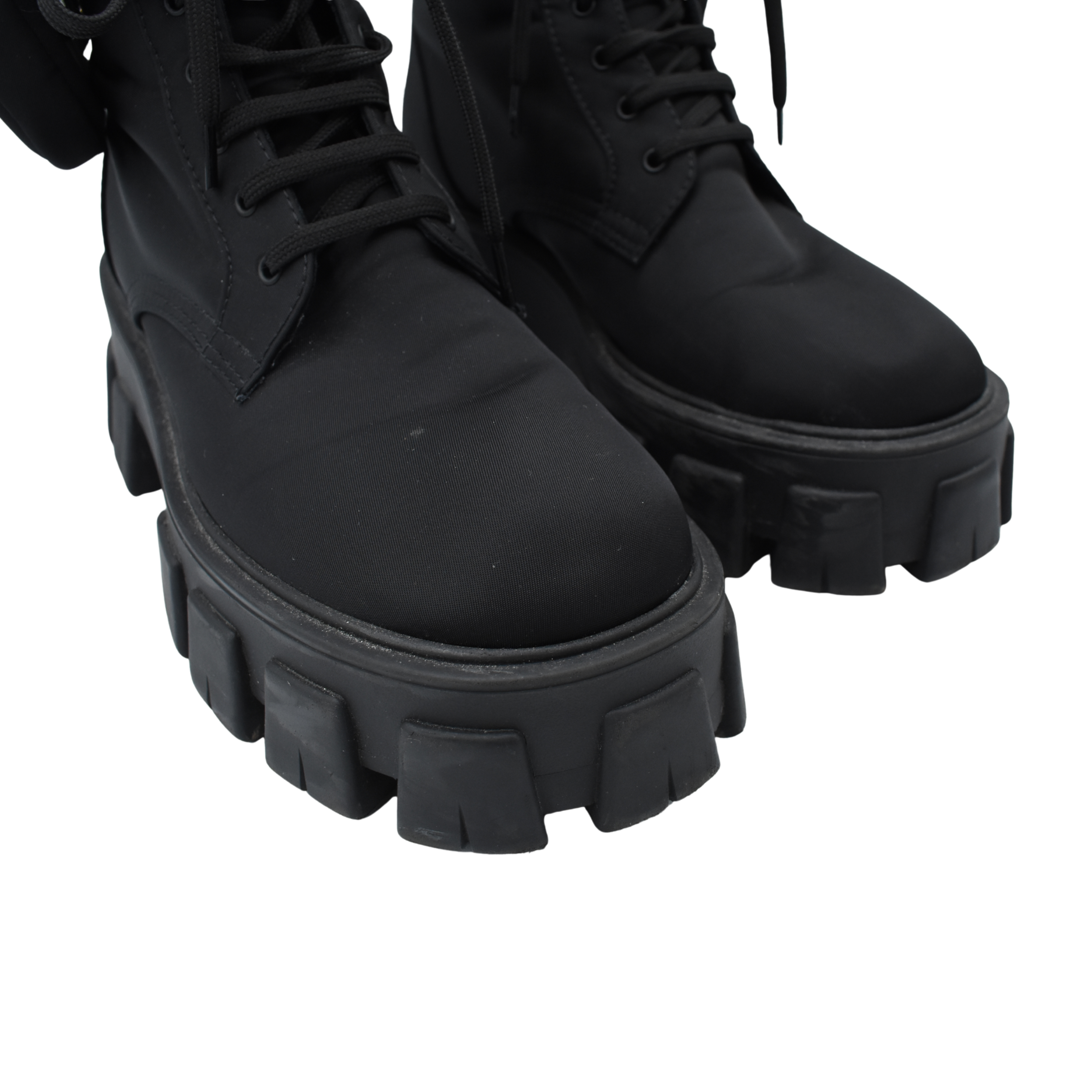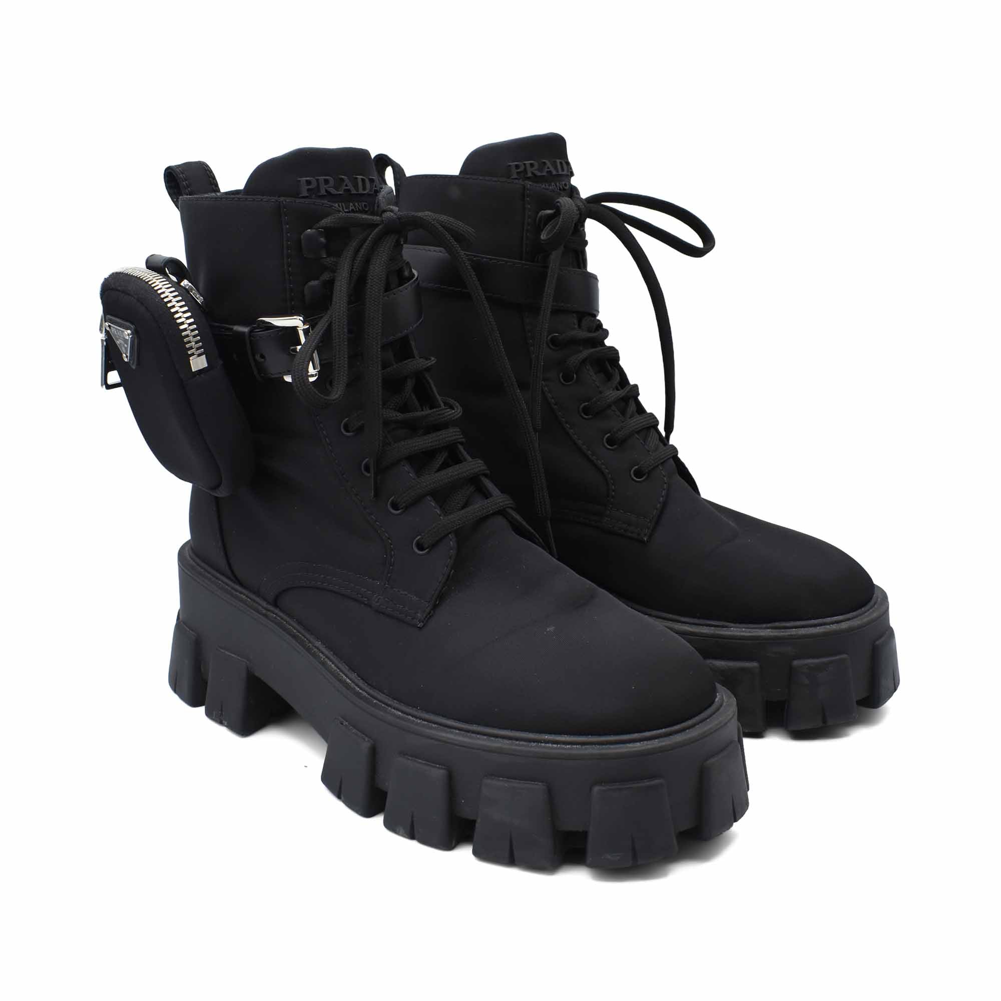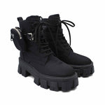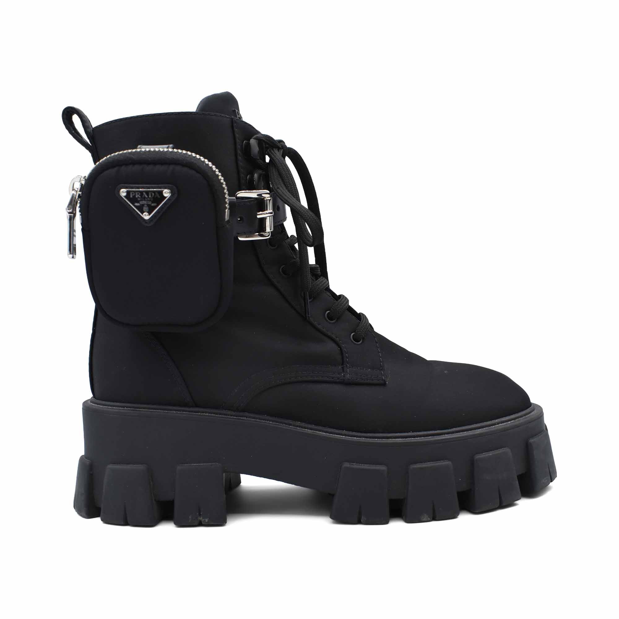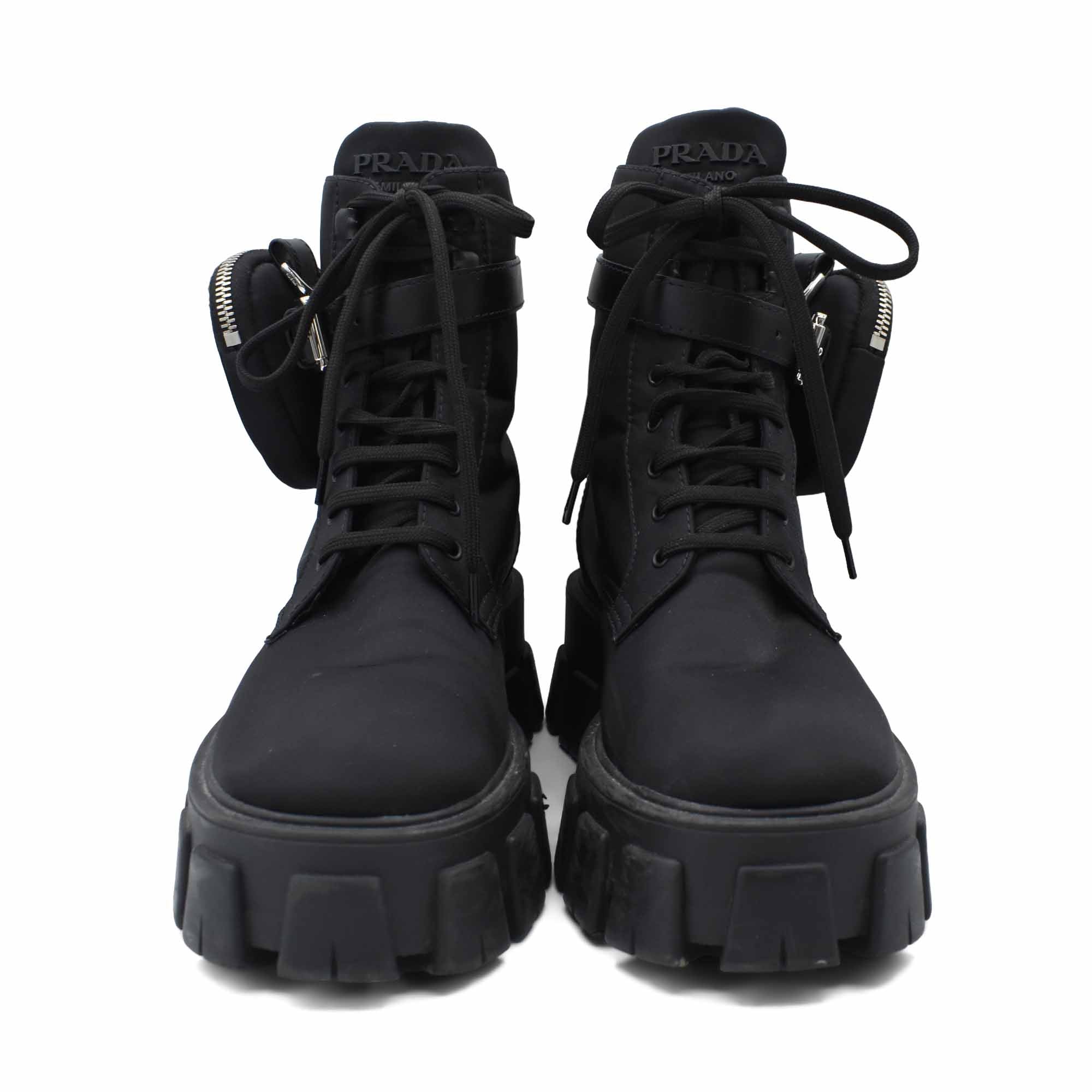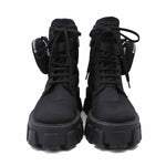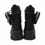Prada 'Monolith' combat boots in black nylon with chunky platform soles and removable zip pouches.