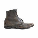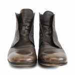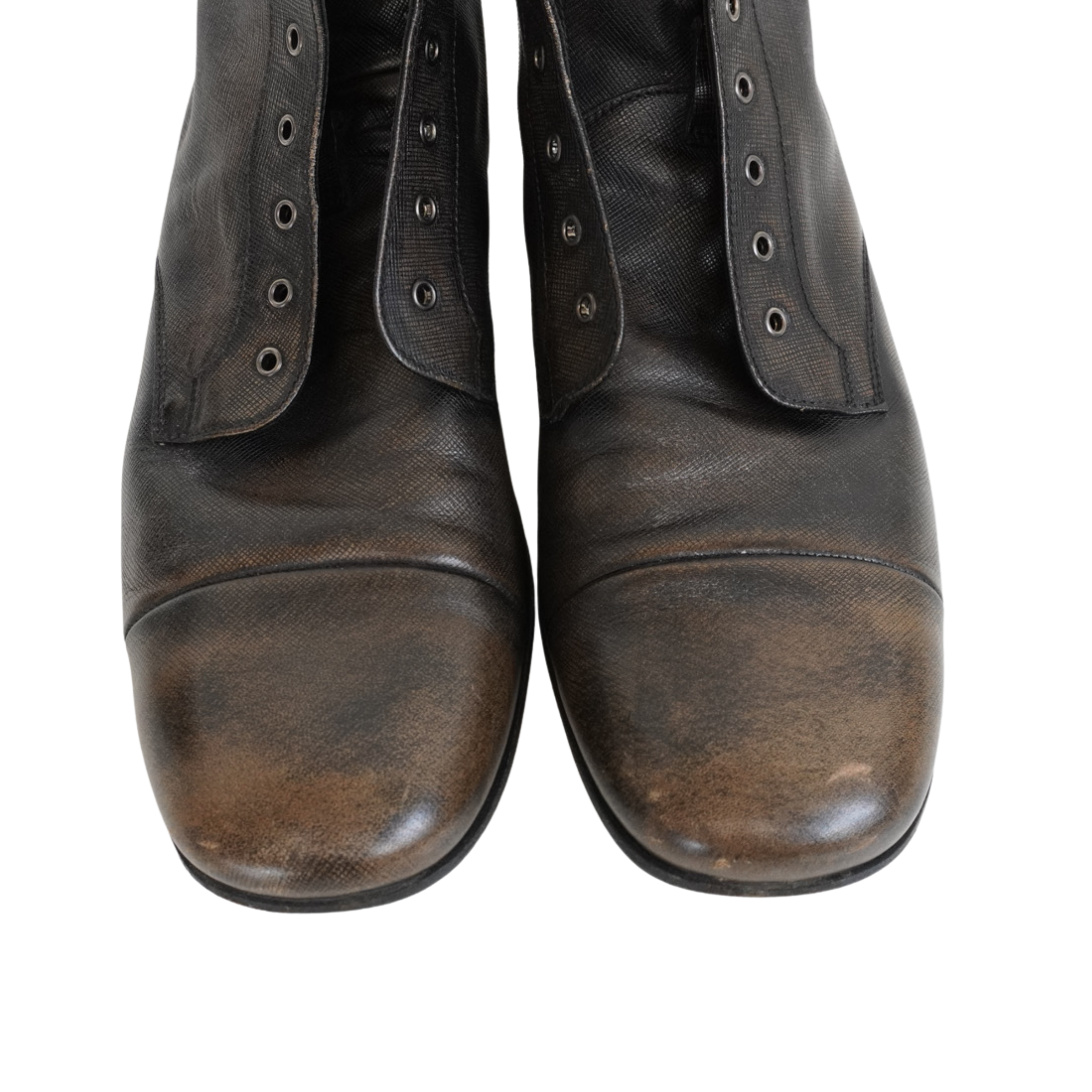 Prada ankle combat boots in distressed brown saffiano leather with a wooden sole and silver grommet hardware.