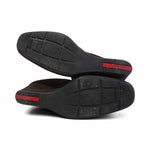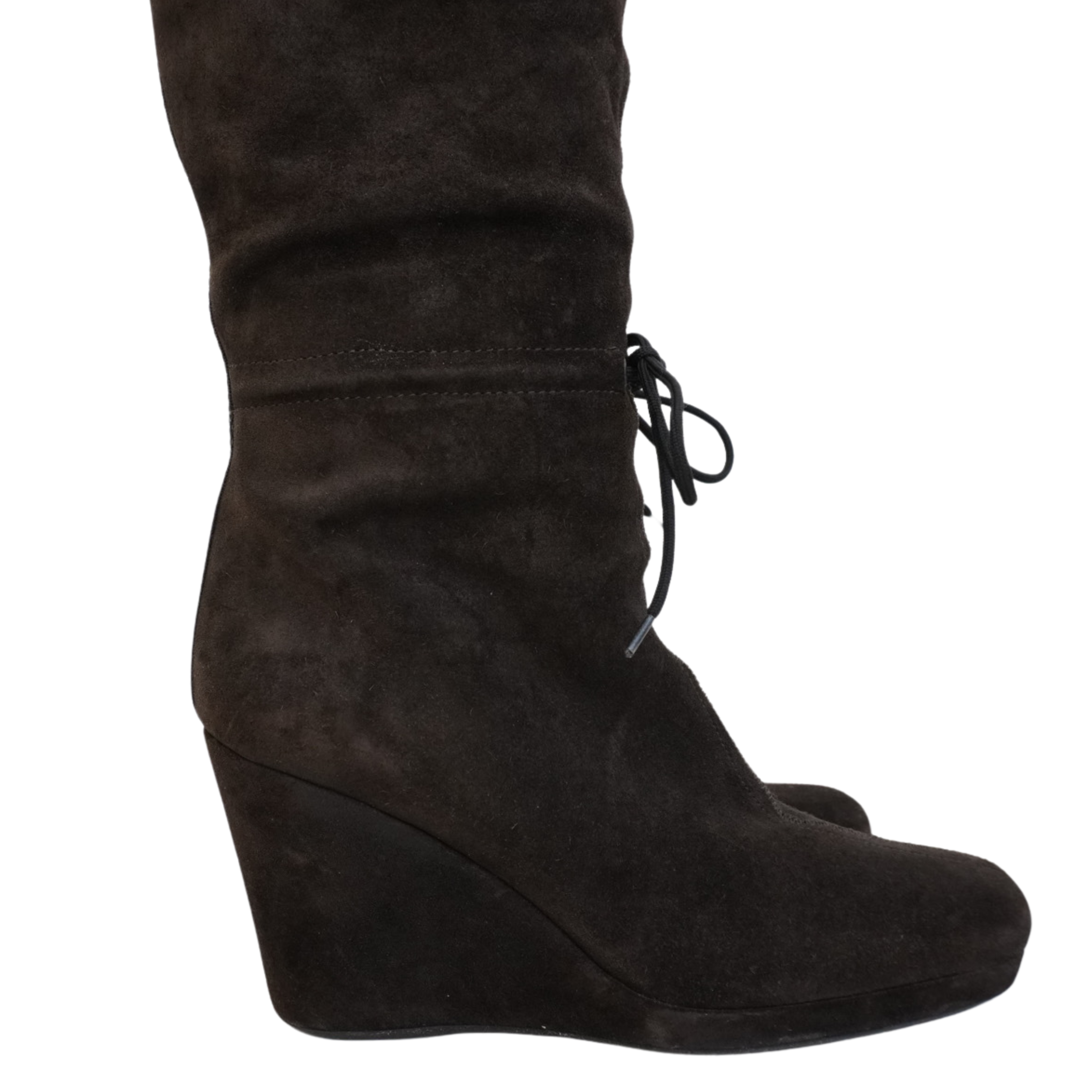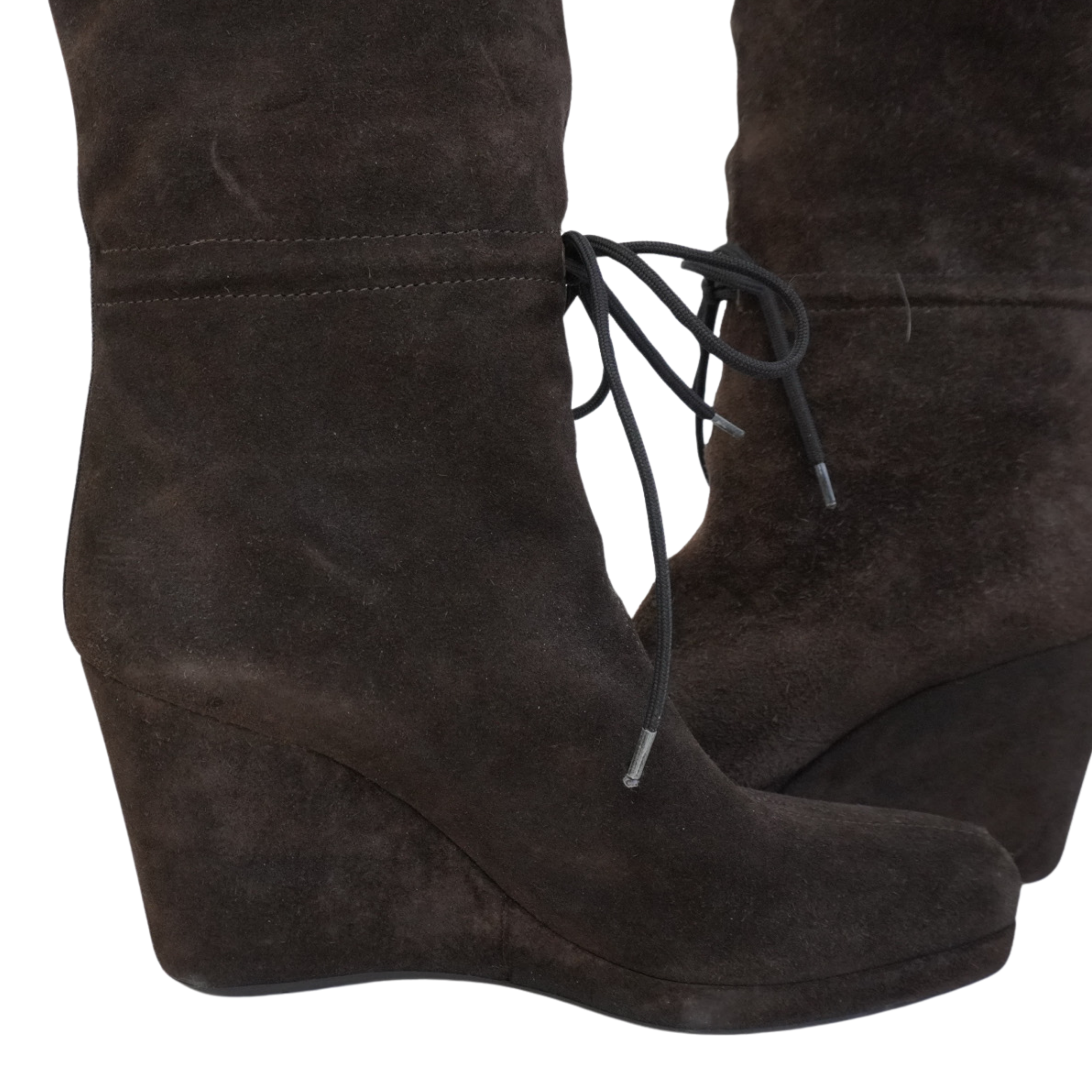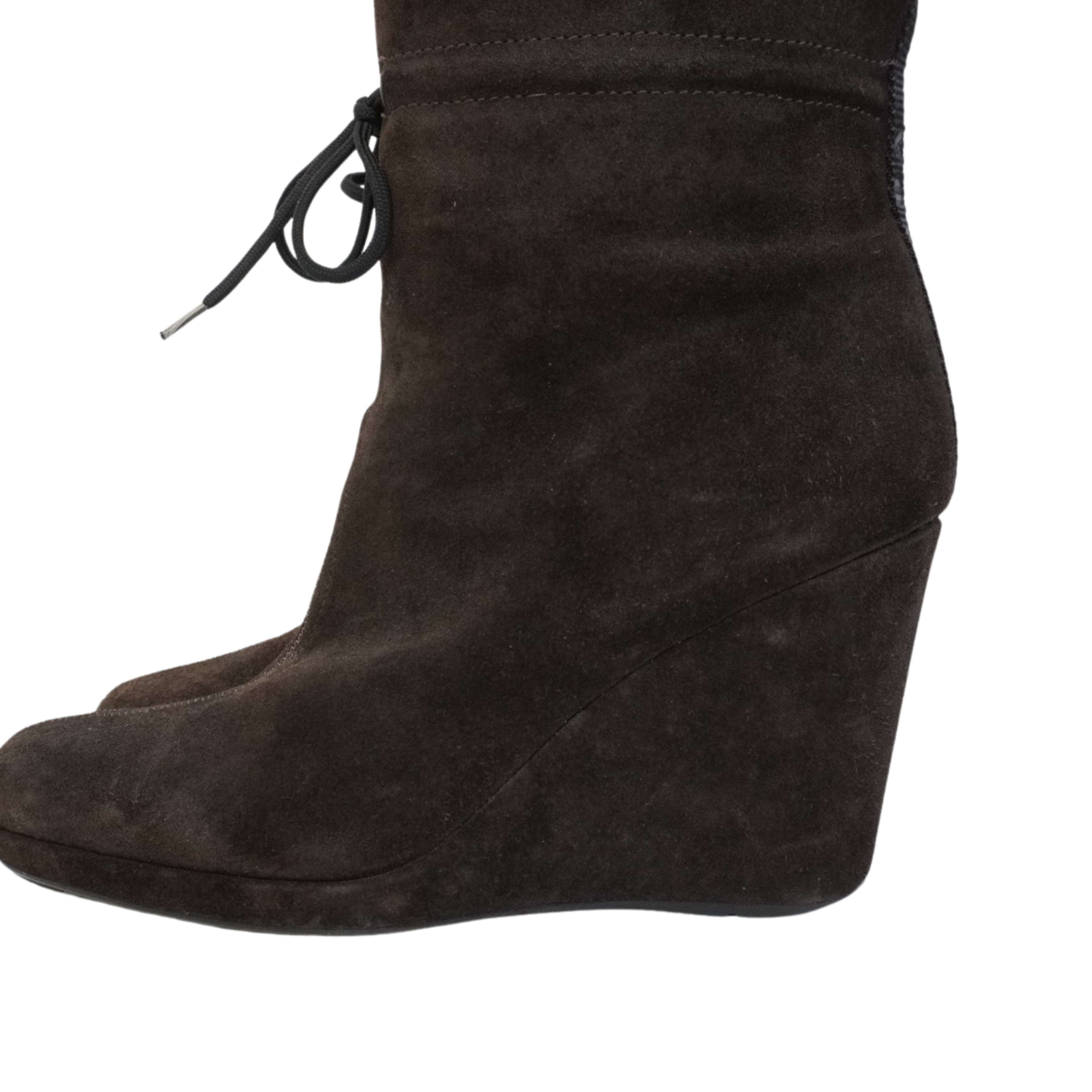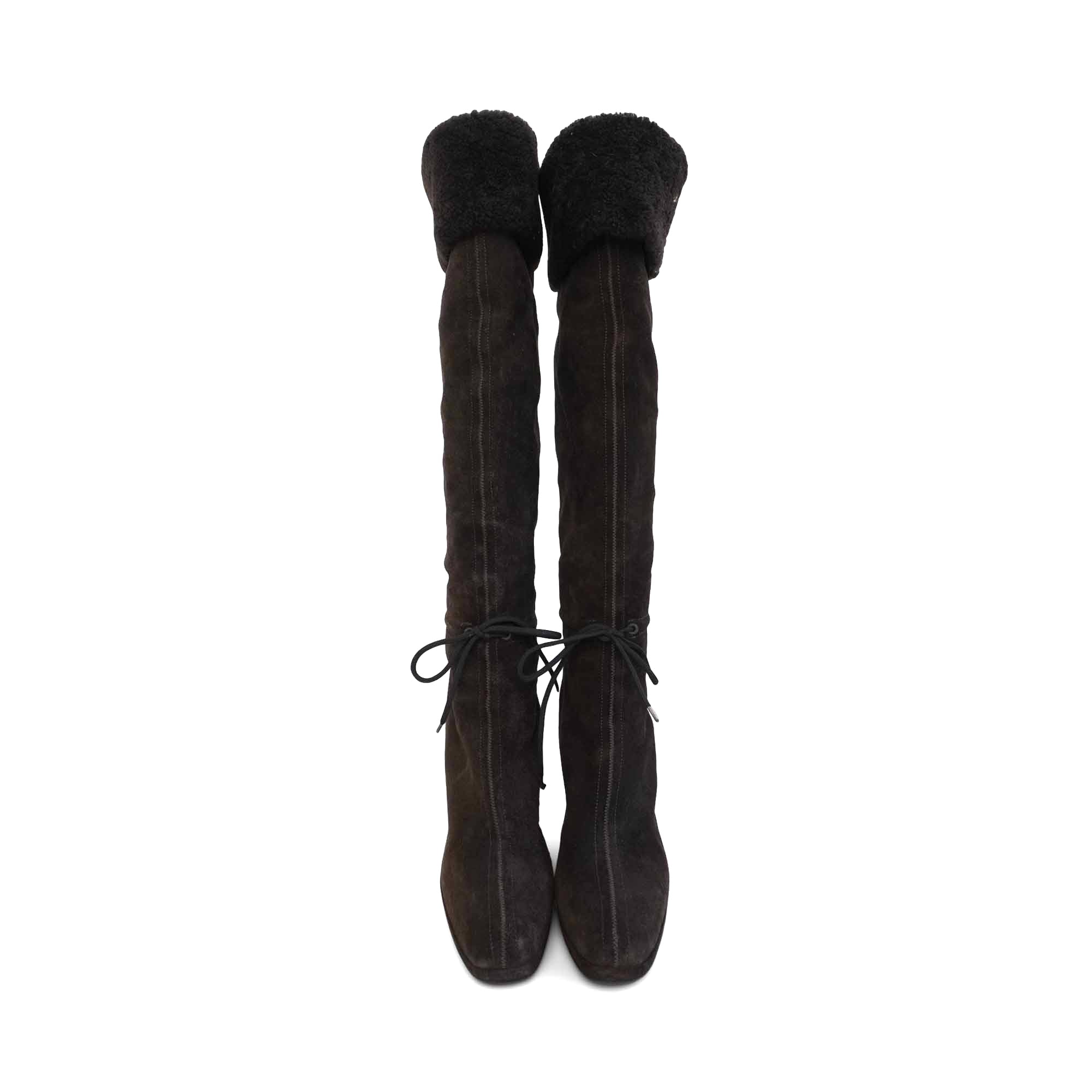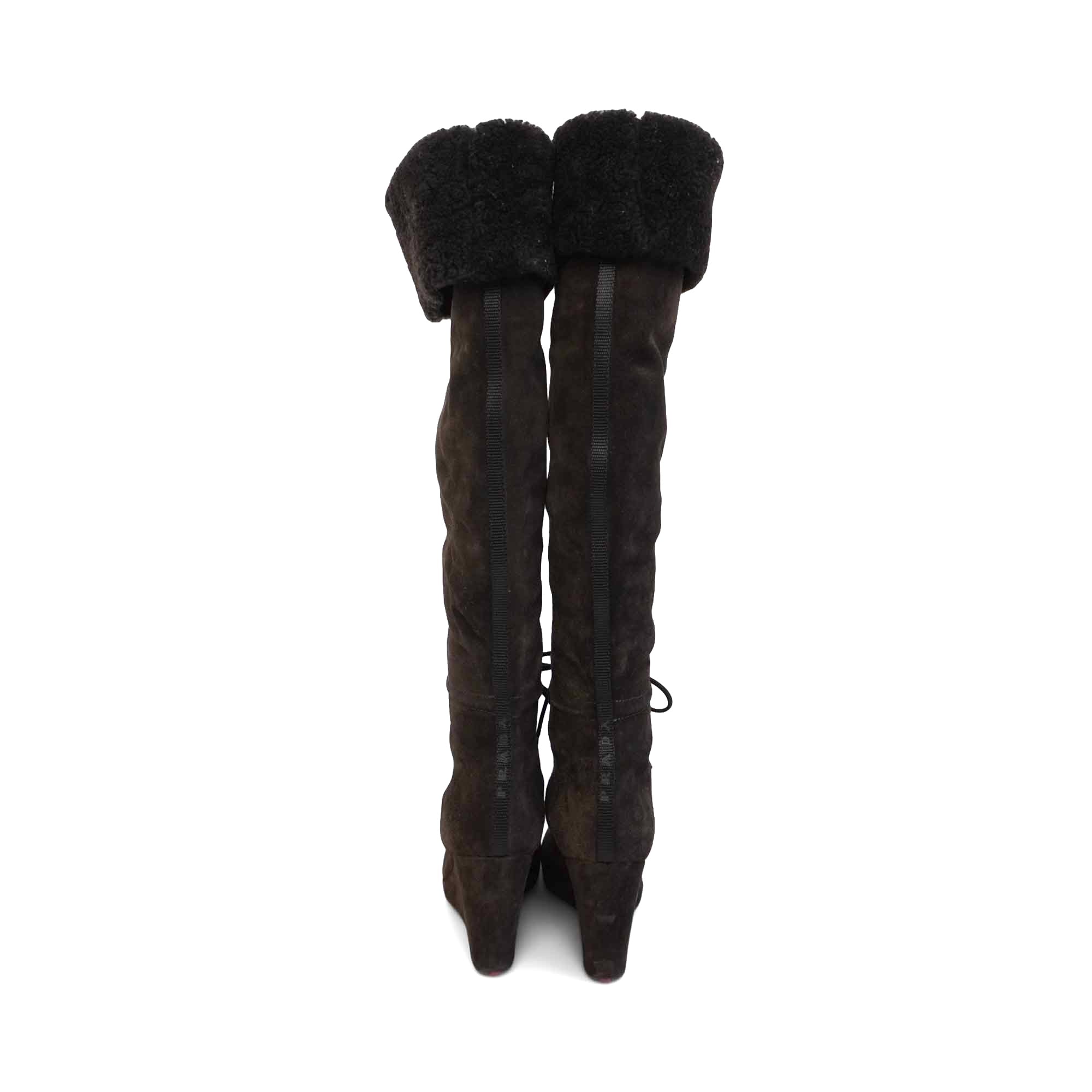 Prada knee-high wedge boots in brown suede with a shearling cuff, a black canvas stripe down the back, and a black tie detail at the ankle.