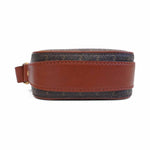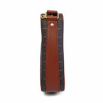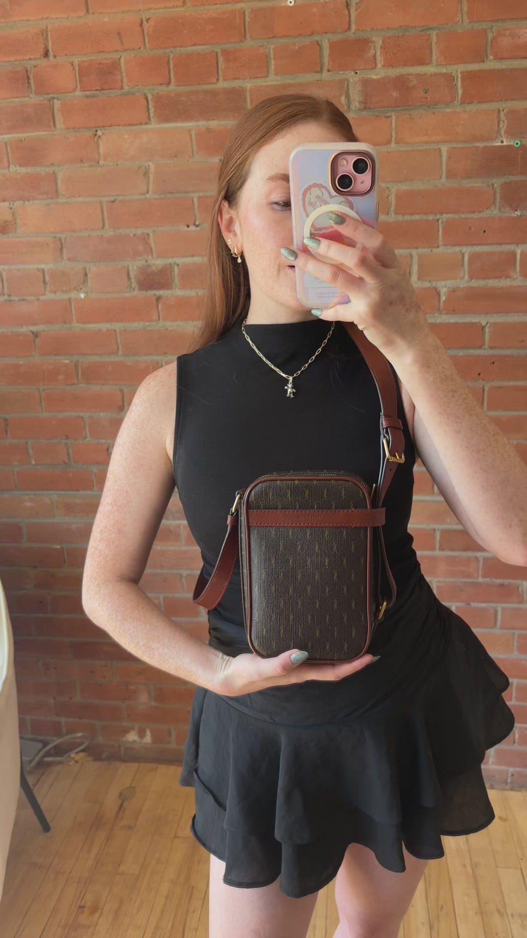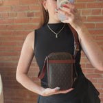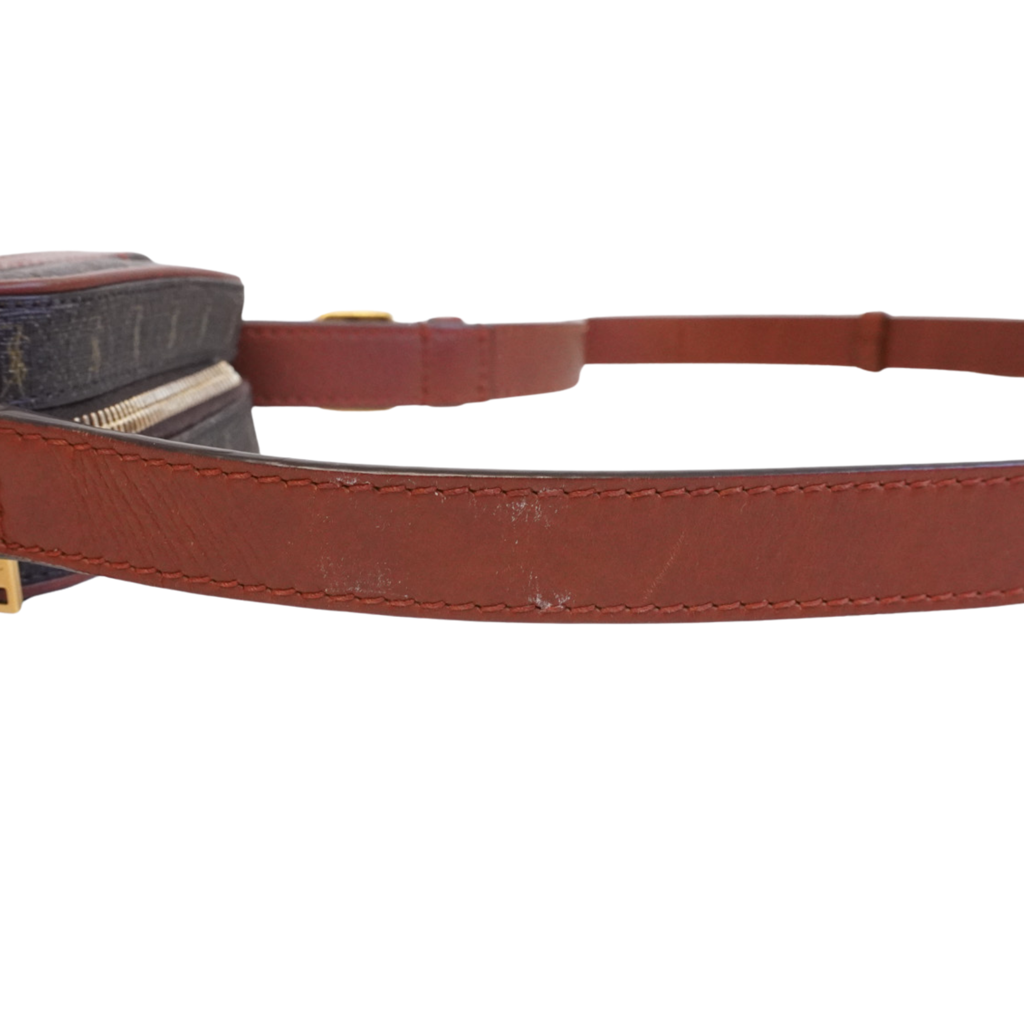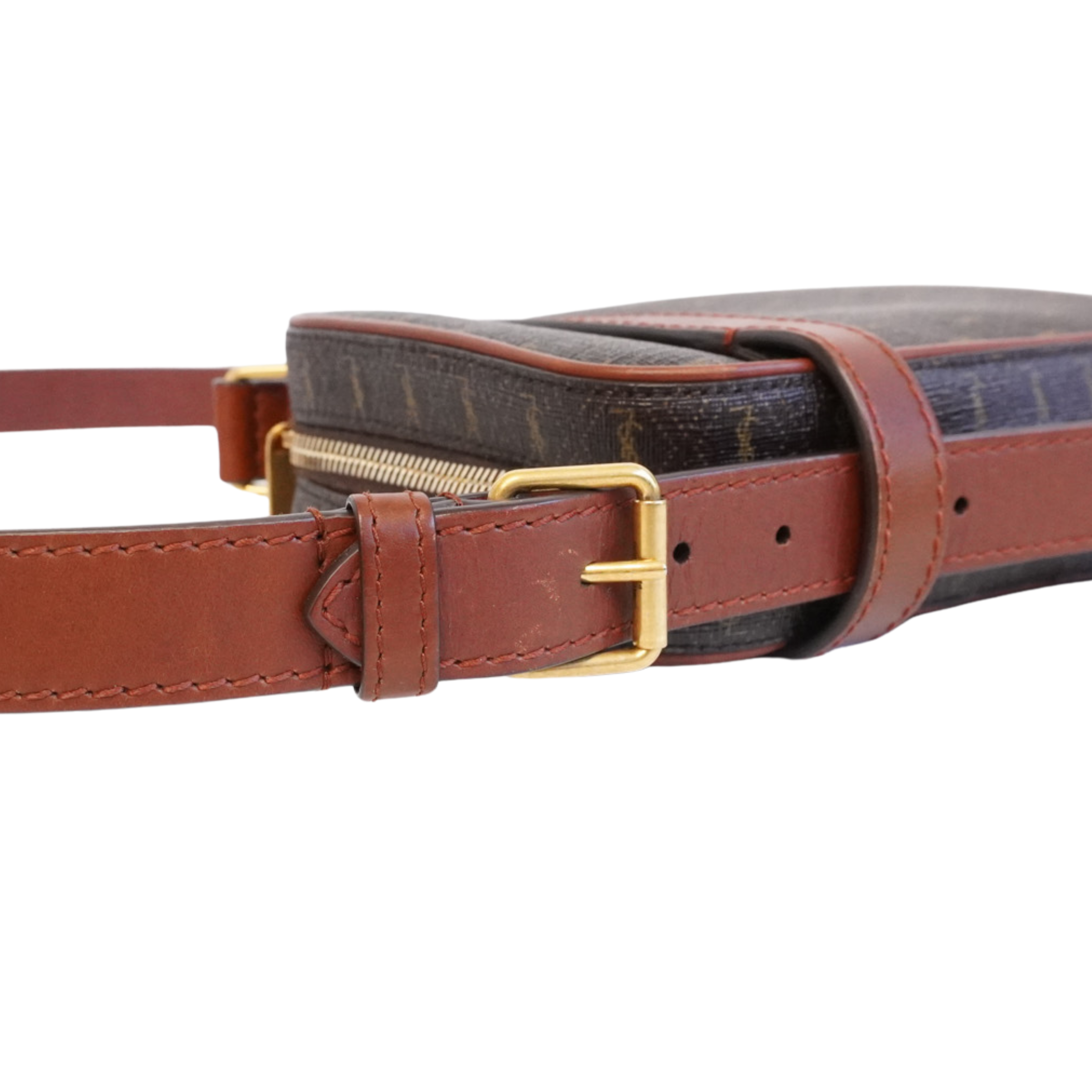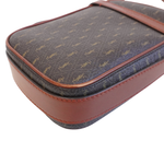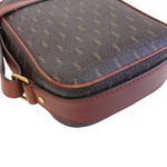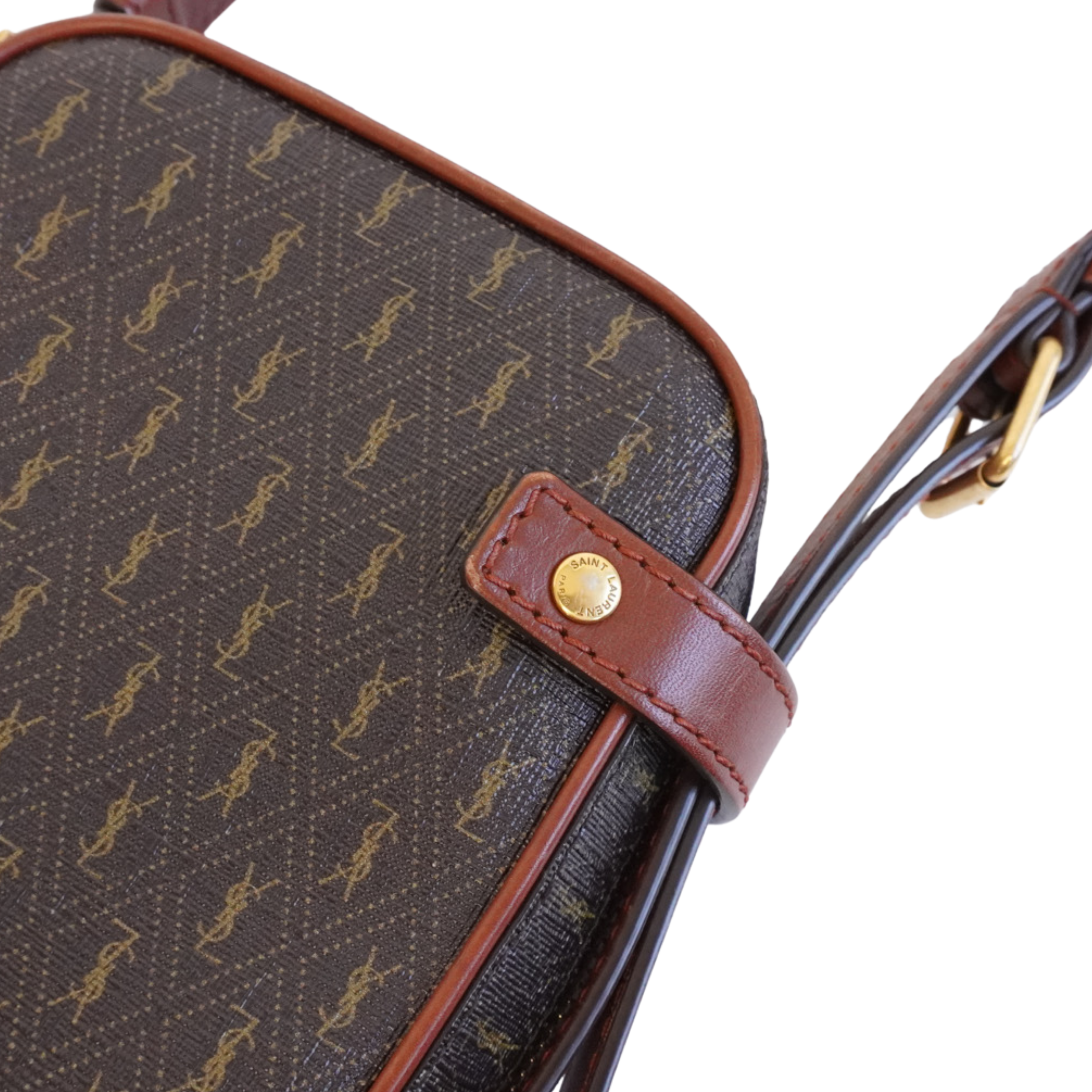 Saint Laurent 'Le Monogramme' crossbody pouch in brown monogram water repellent cassandre coated canvas with chestnut contrast trim in leather with front slip pocket, adjustable strap and strap controller. Interior features brown canvas lining.
