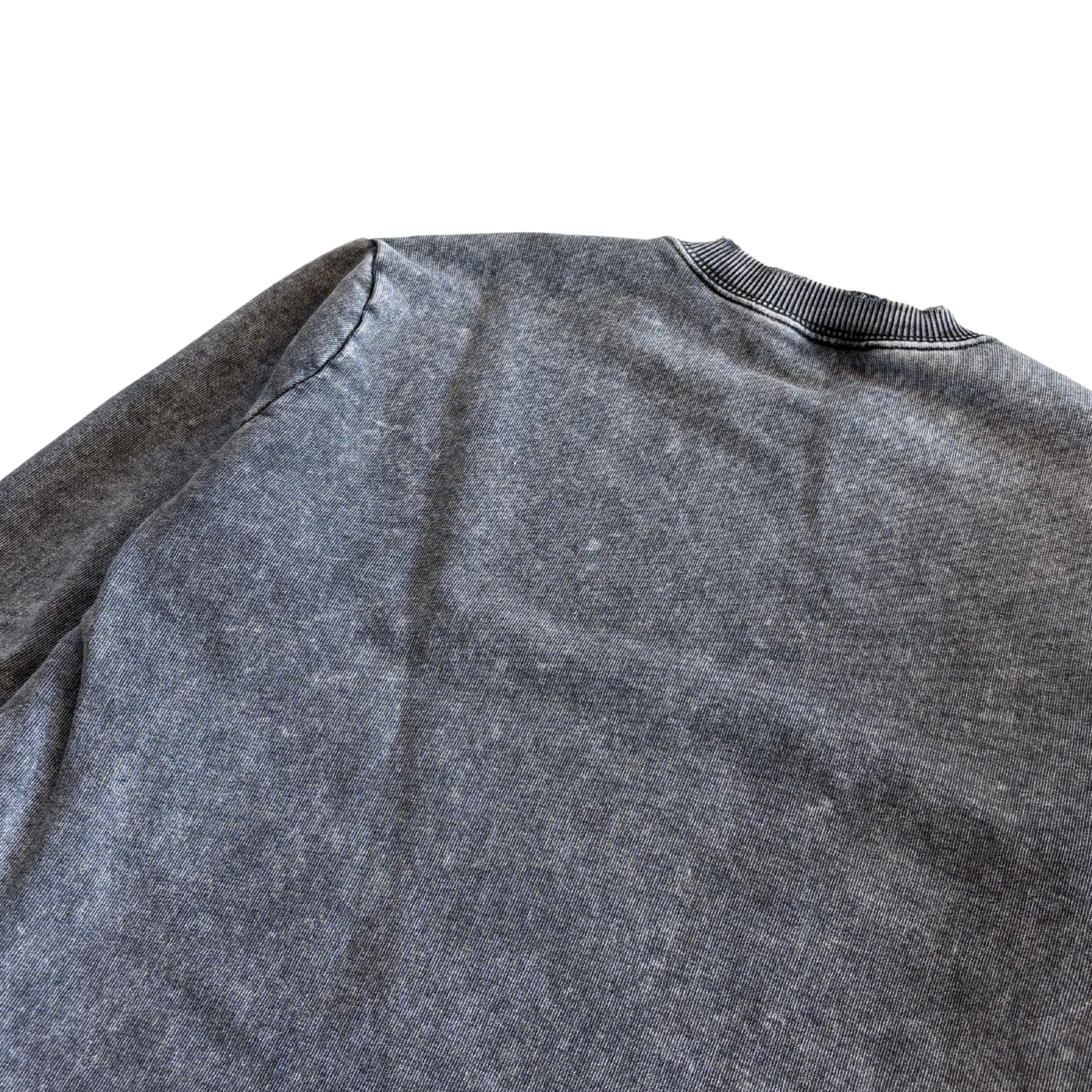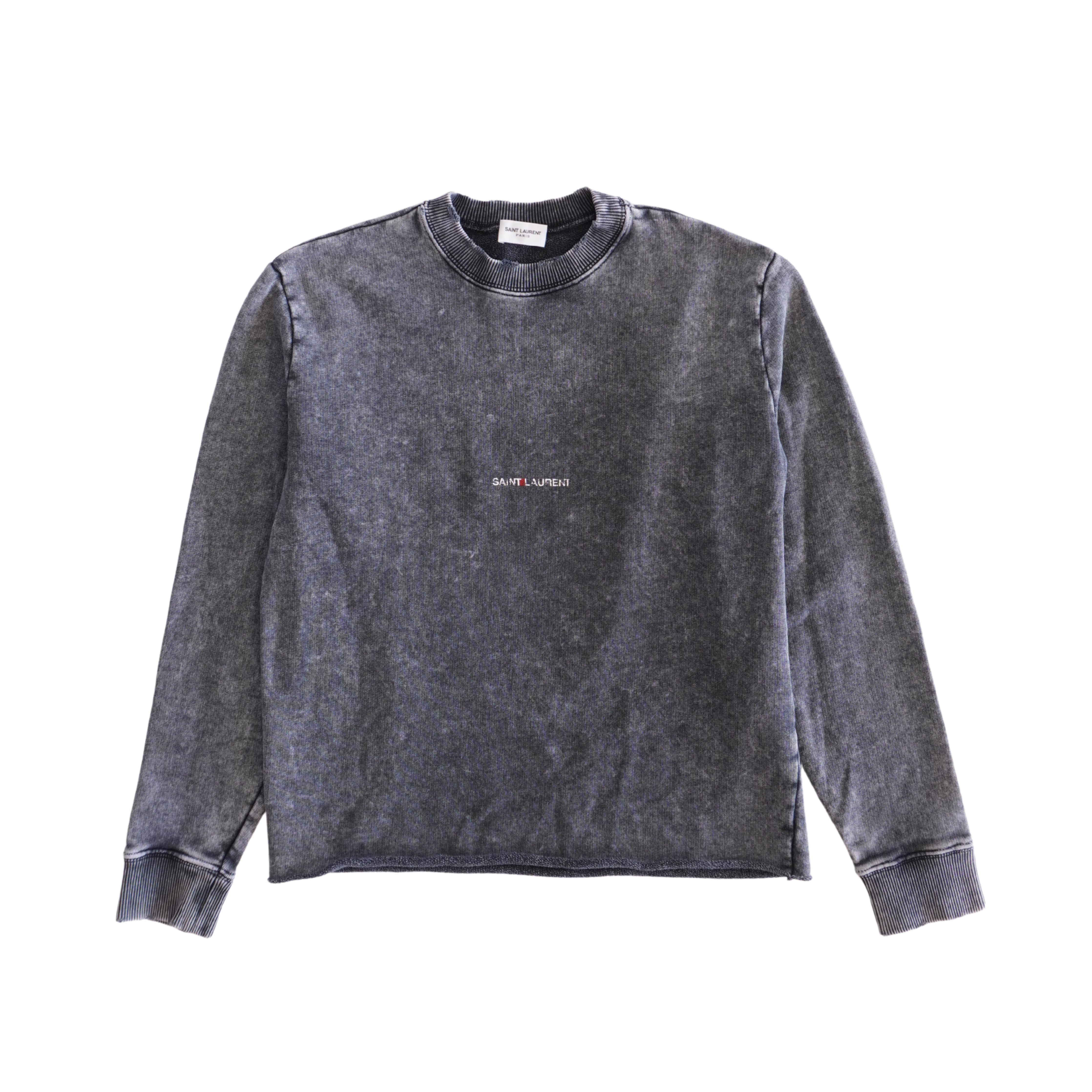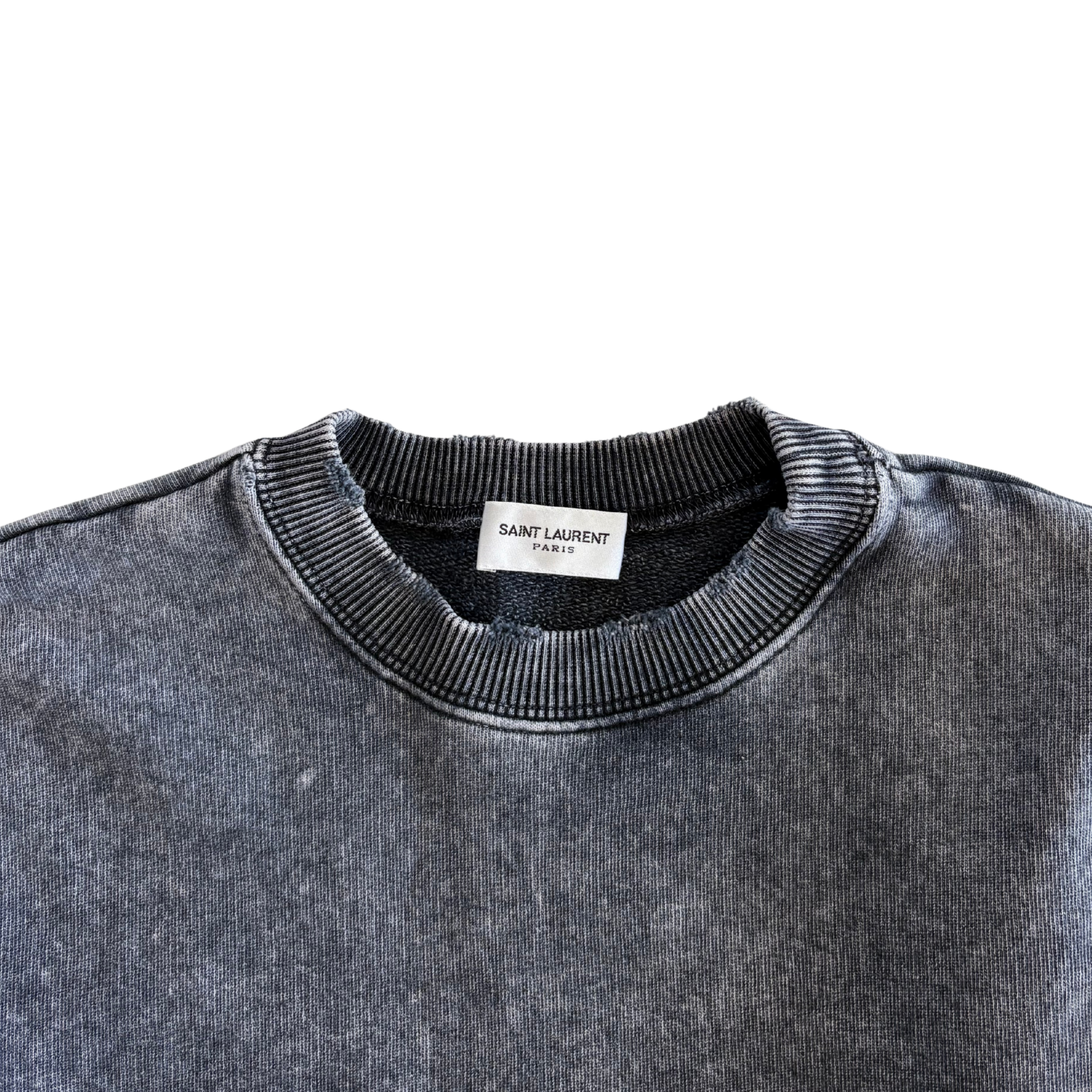 Saint Laurent logo sweatshirt in washed stone grey cotton with a distressed red and white logo monogram on the chest, a distressed collar and cuffs, and a raw hem.
