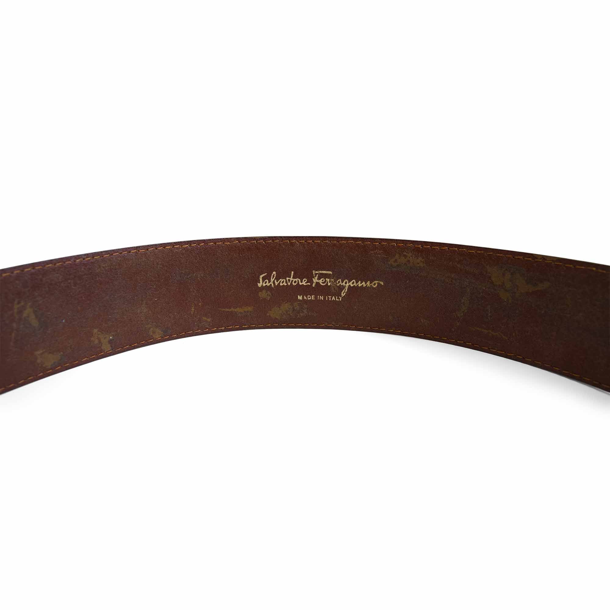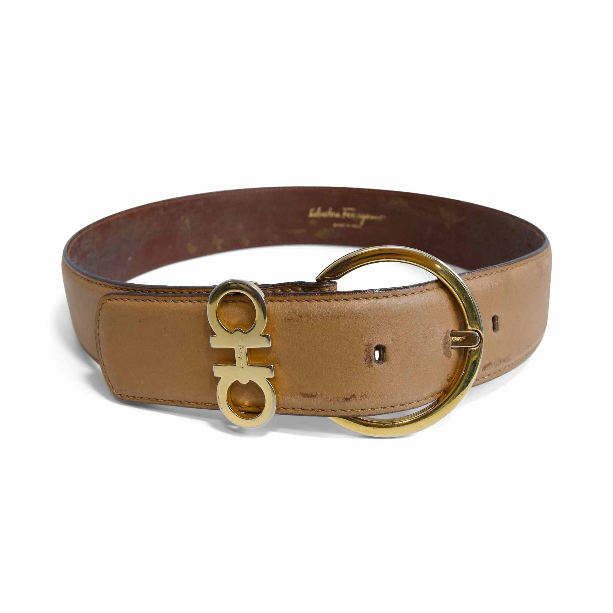 Salvatore Ferragamo 'Gancini' belt in tan leather with round buckle in gold hardware and gancini detailing.