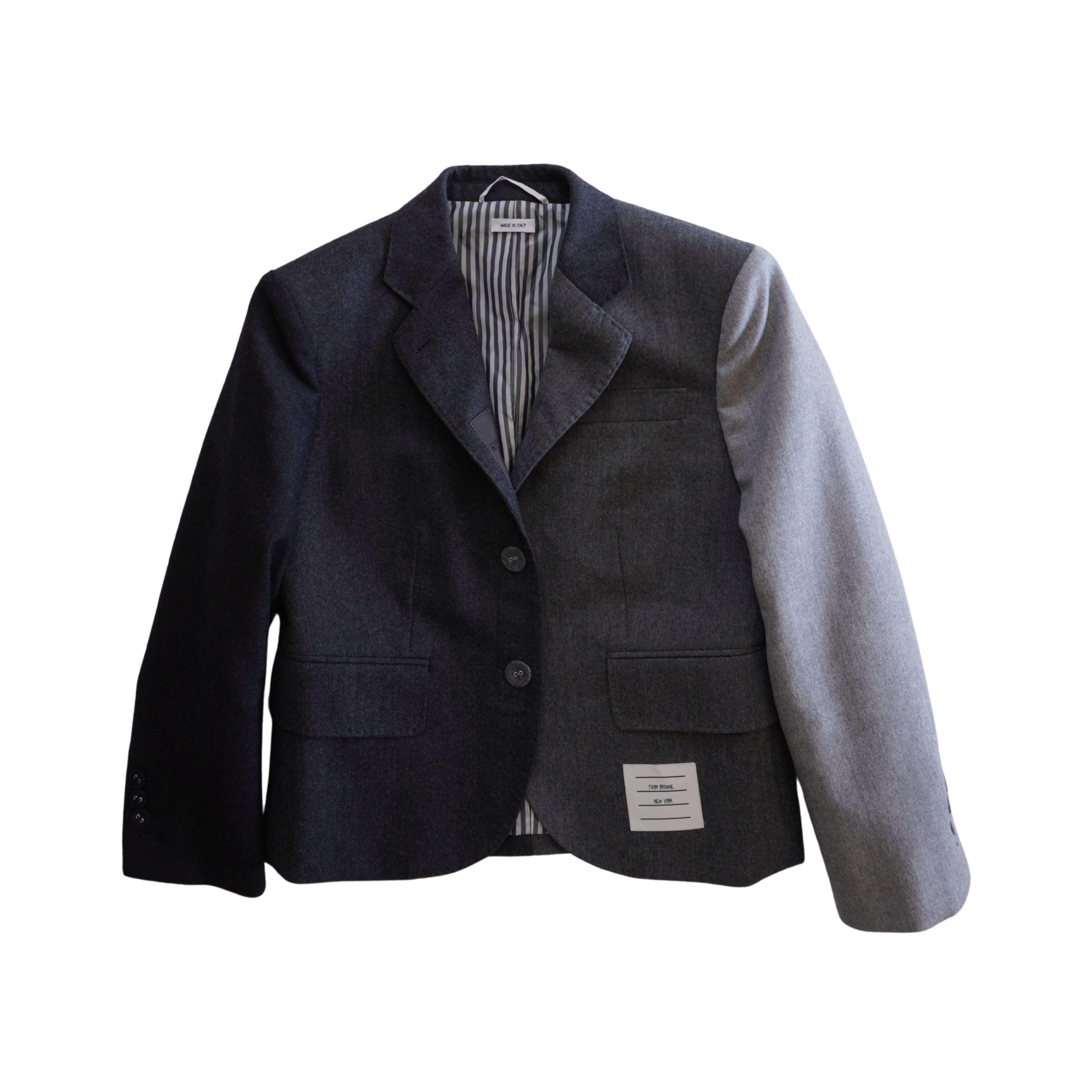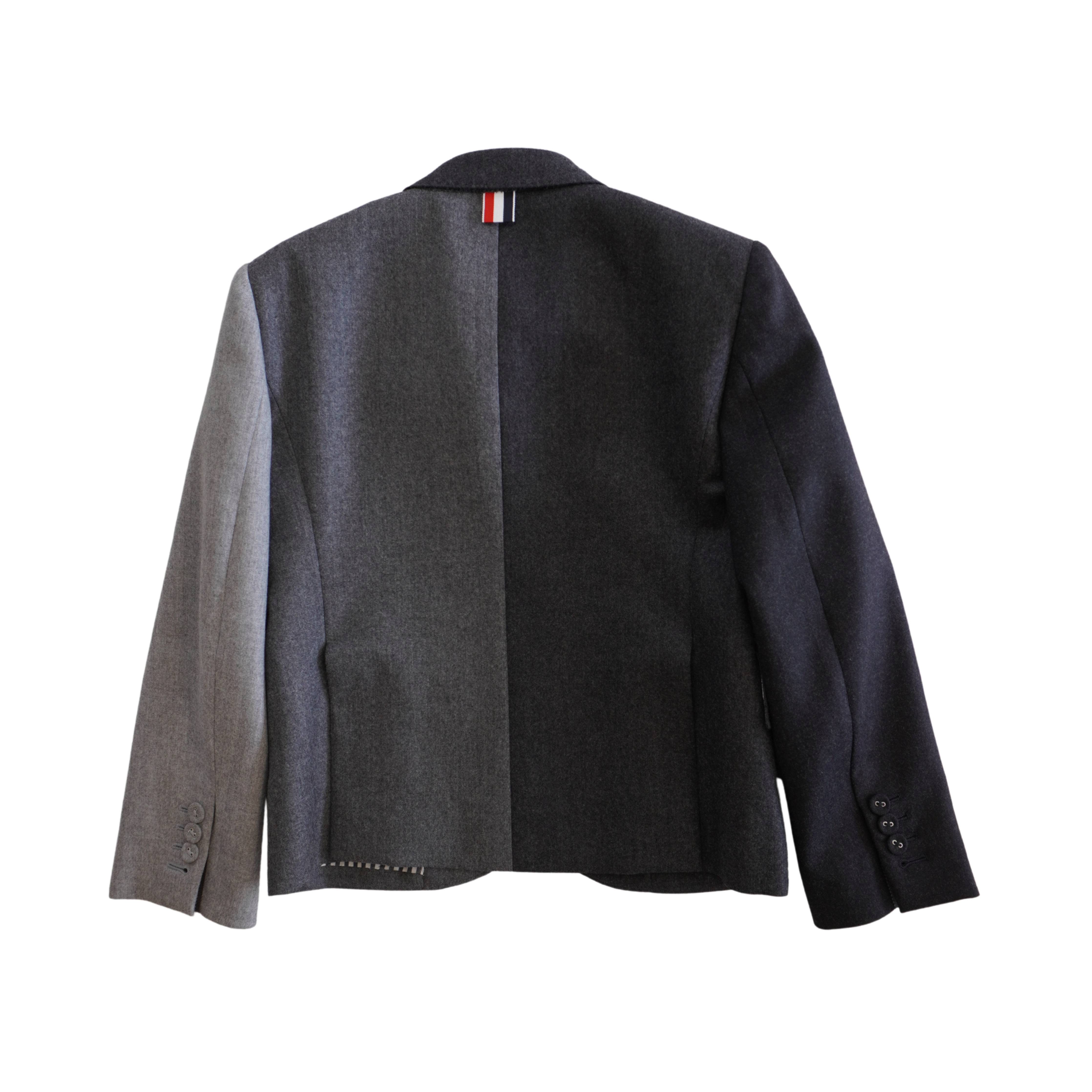 Thom Browne colour blocked blazer jacket in various shades of grey wool with a front-button closure with covered wool buttons, front flap pockets, and a notch lapel collar.