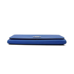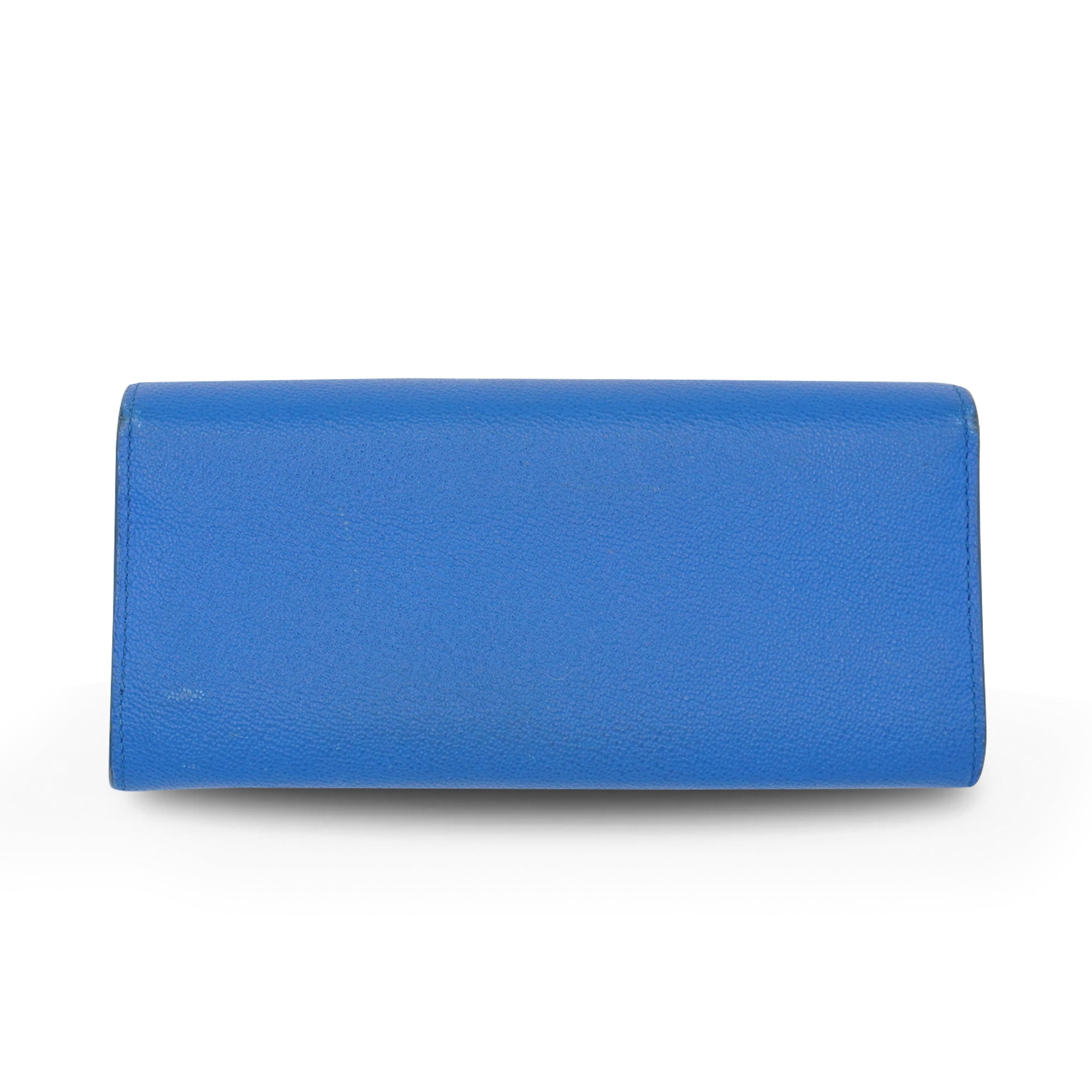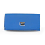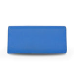 Tod's long wallet it in blue leather with orange leather interior and silver logo plate. Features a snap button closure, 18 card slots, zip change pocket, and cash slot.