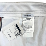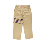 Thom Browne straight-leg trousers in beige brown cotton with a front button closure, a navy, white and orange stripe detail around the thigh, and a signature stripe logo tab on the back waistband.