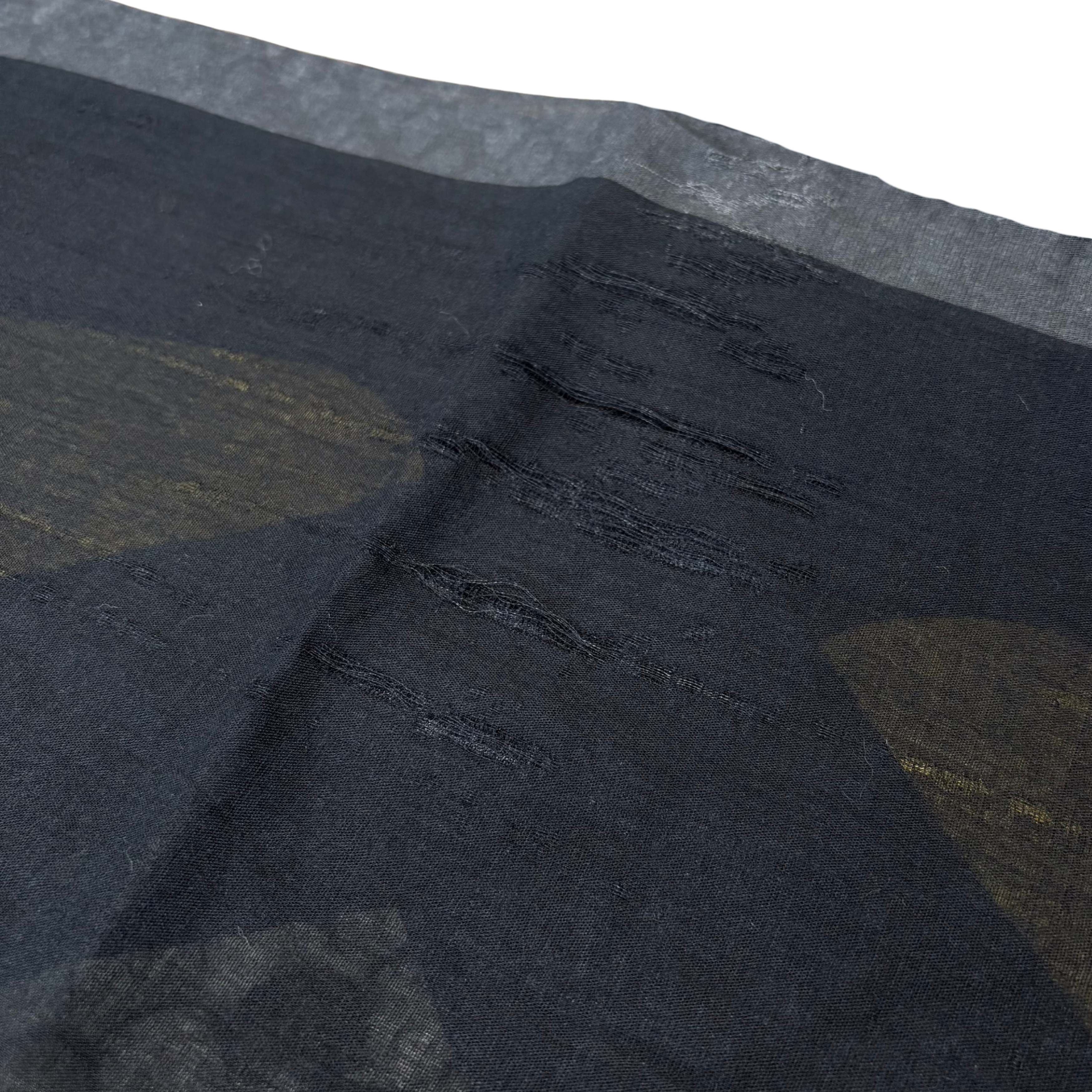 Fendi 'Monster' rectangular scarf in black cotton with signature yellow monster eyes and grey snakeskin pattern with fringe trim.