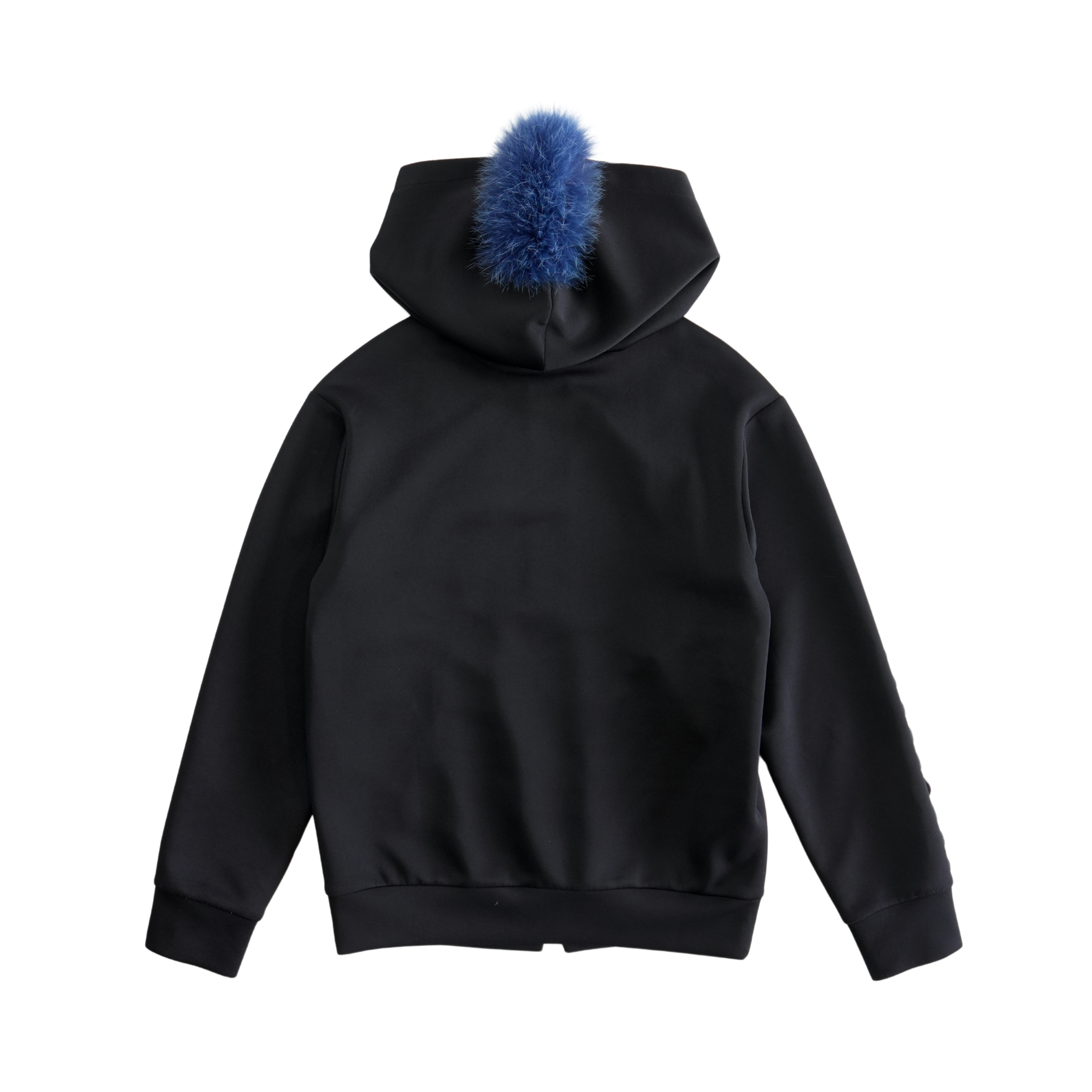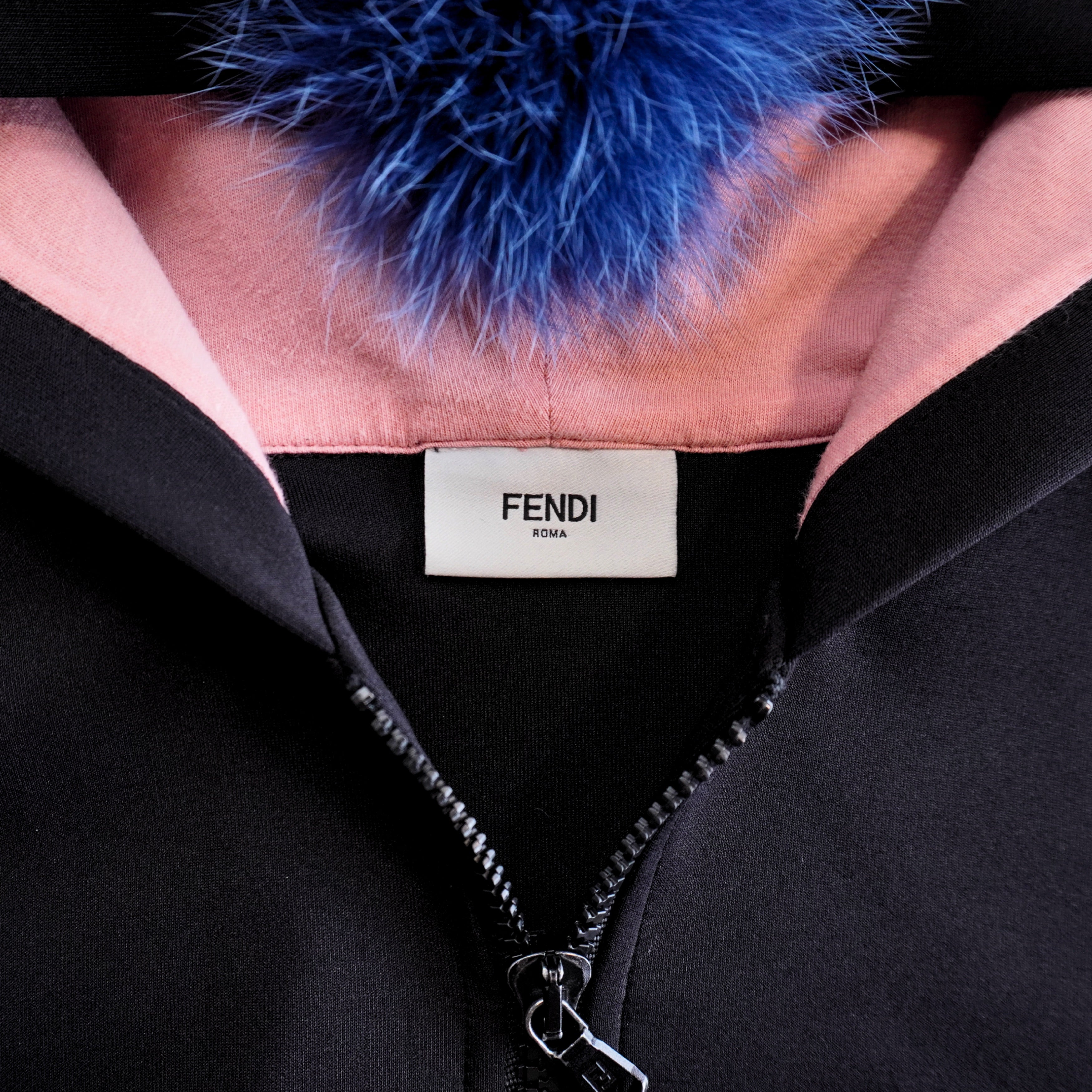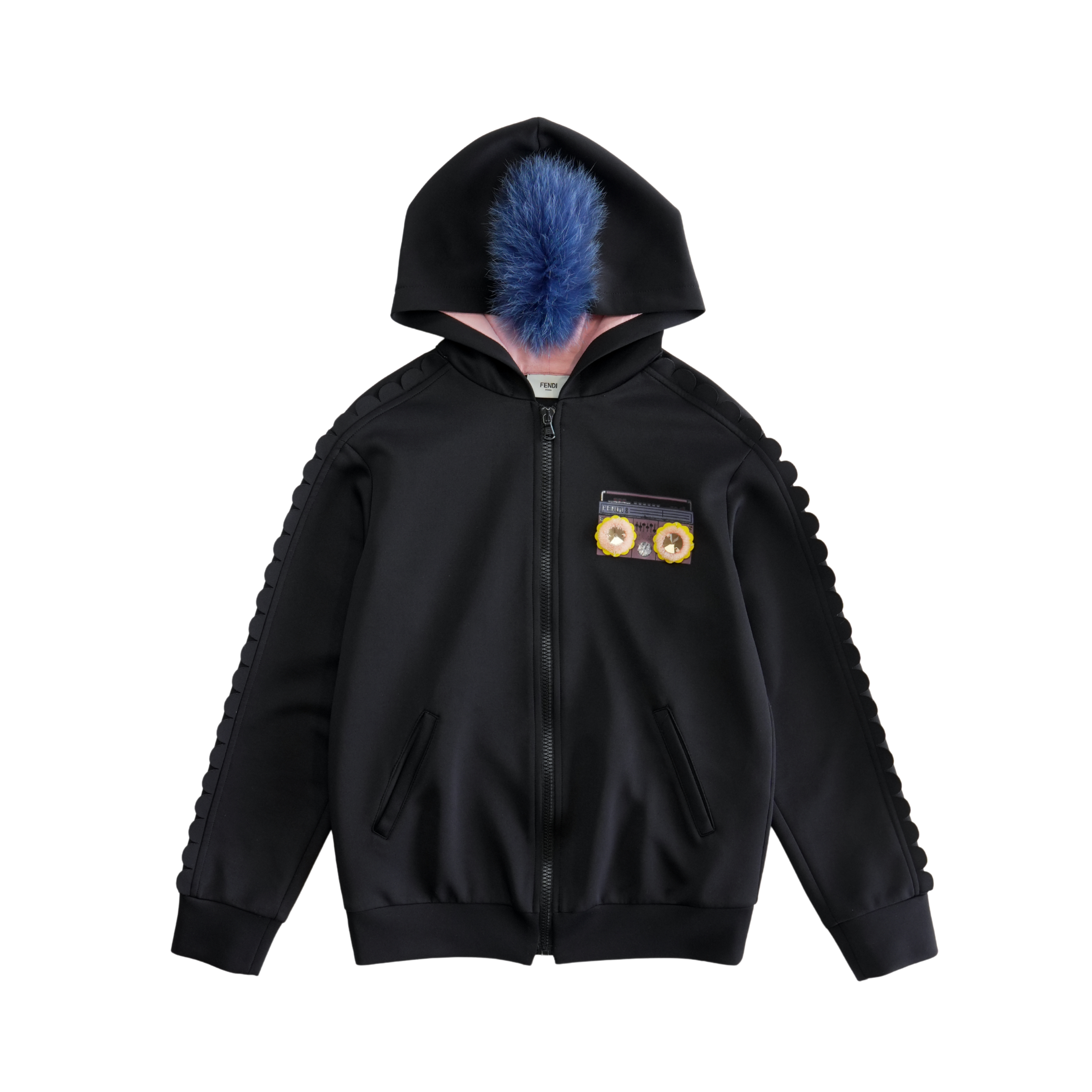 Fendi 'Stereo' zip-up hoodie in black neoprene with a boom box graphic on the chest, a scallop trim down the sleeves, and a removable blue fur stripe down the hood.
