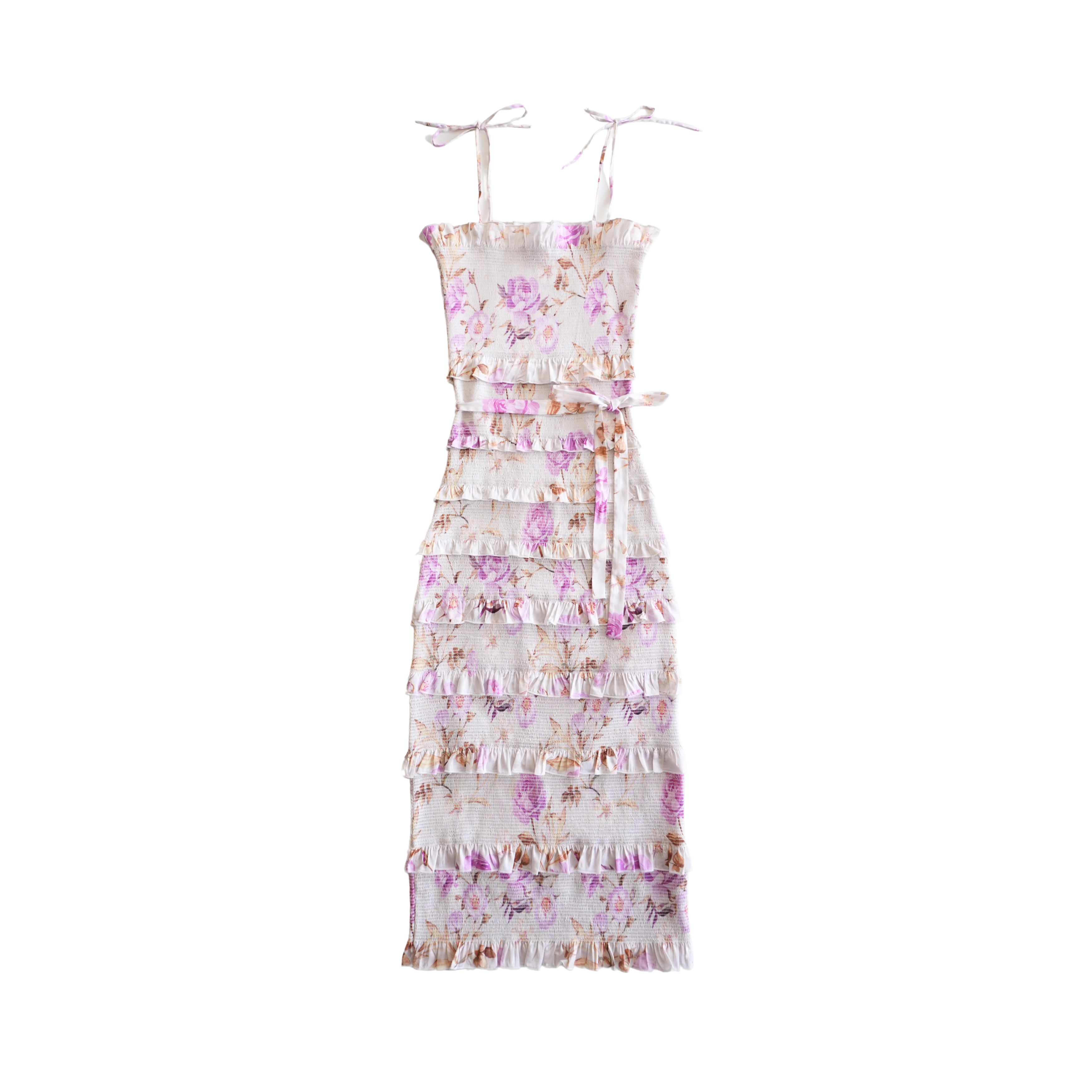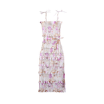 V. Chapman 'Lily' cream and purple floral midi dress in shirred satin panels with ruffle trim. Features a matching belt and self tie spaghetti straps.