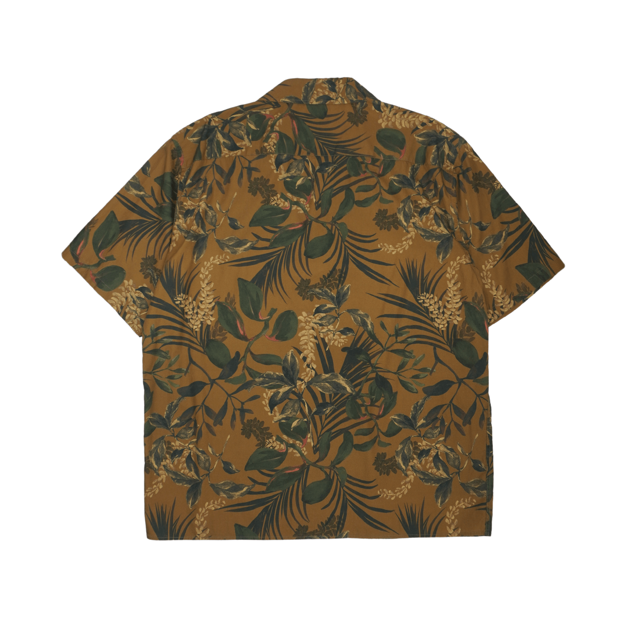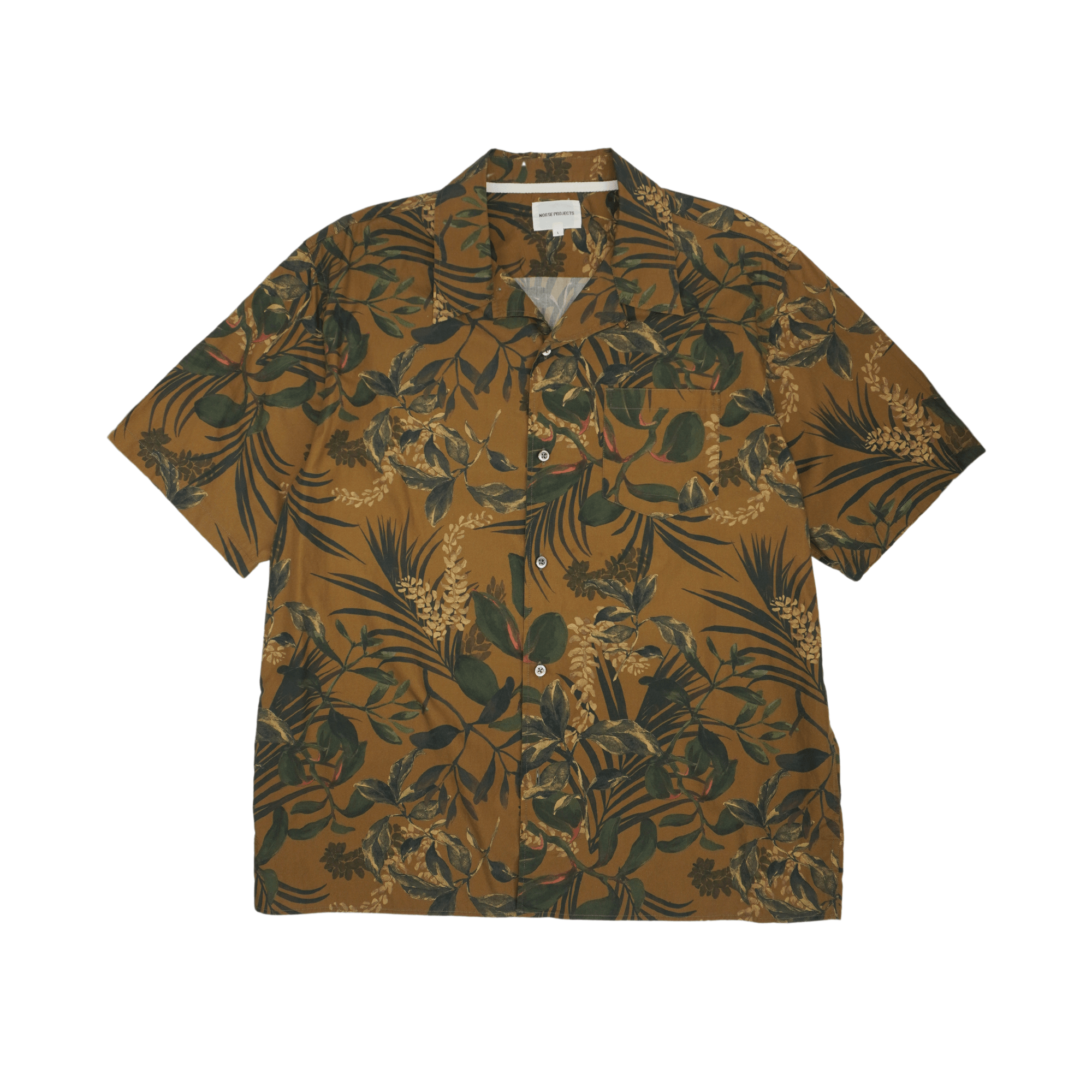 Norse Projects button-down shirt in brown cotton with an all-over black and green botanical leaf pattern, a chest pocket, and iridescent buttons.