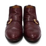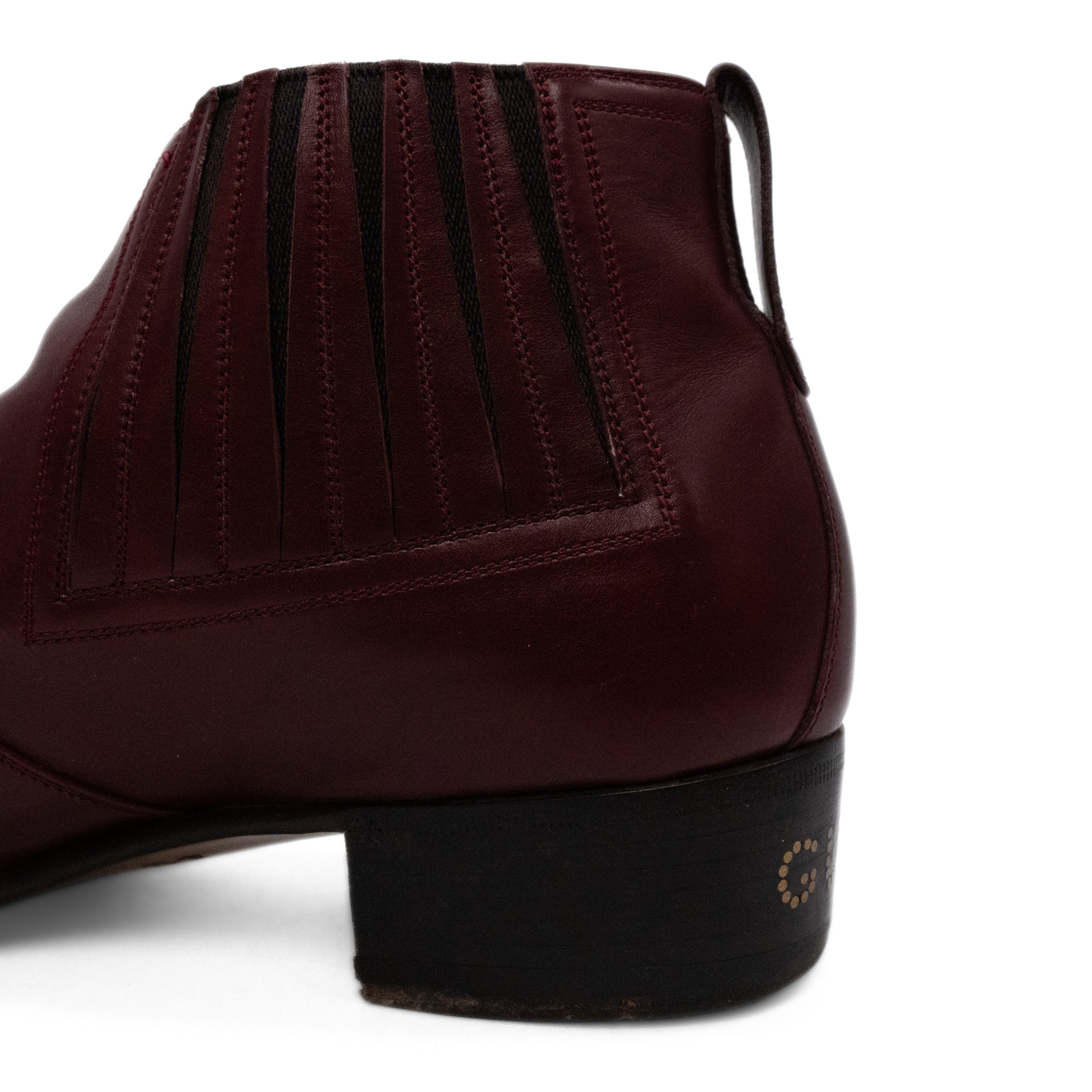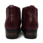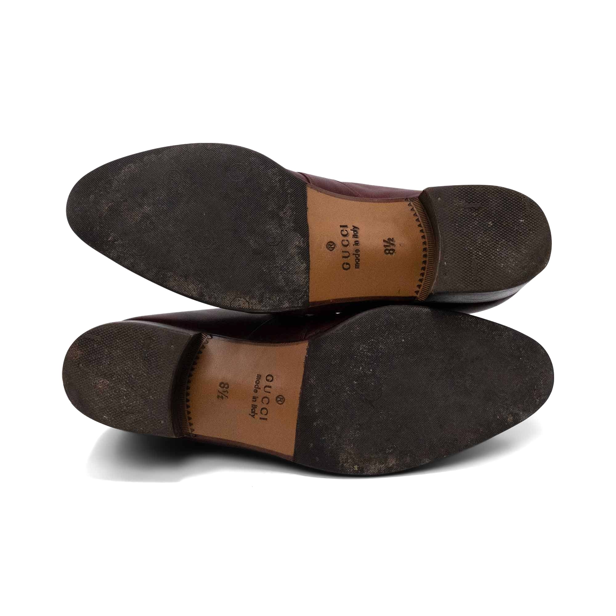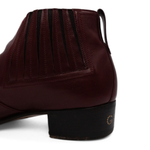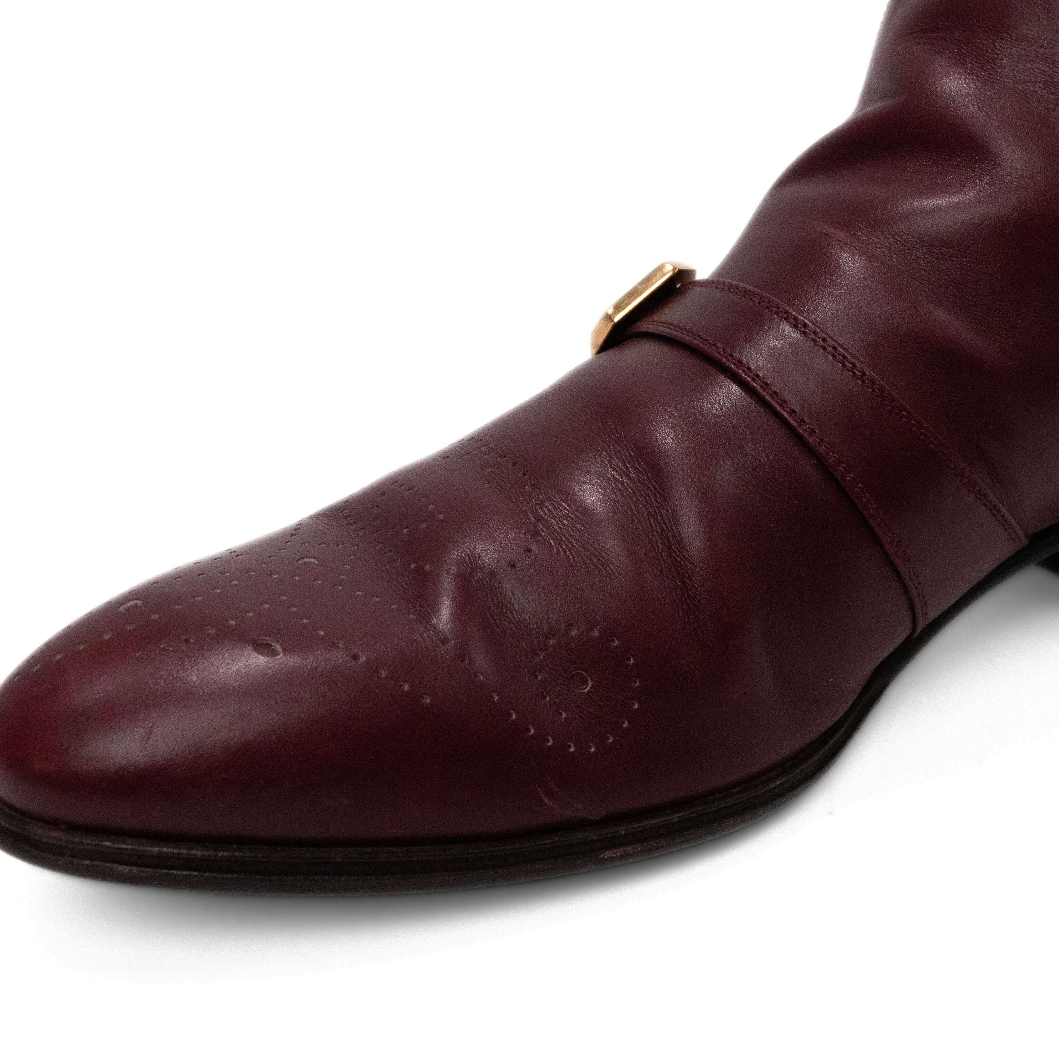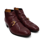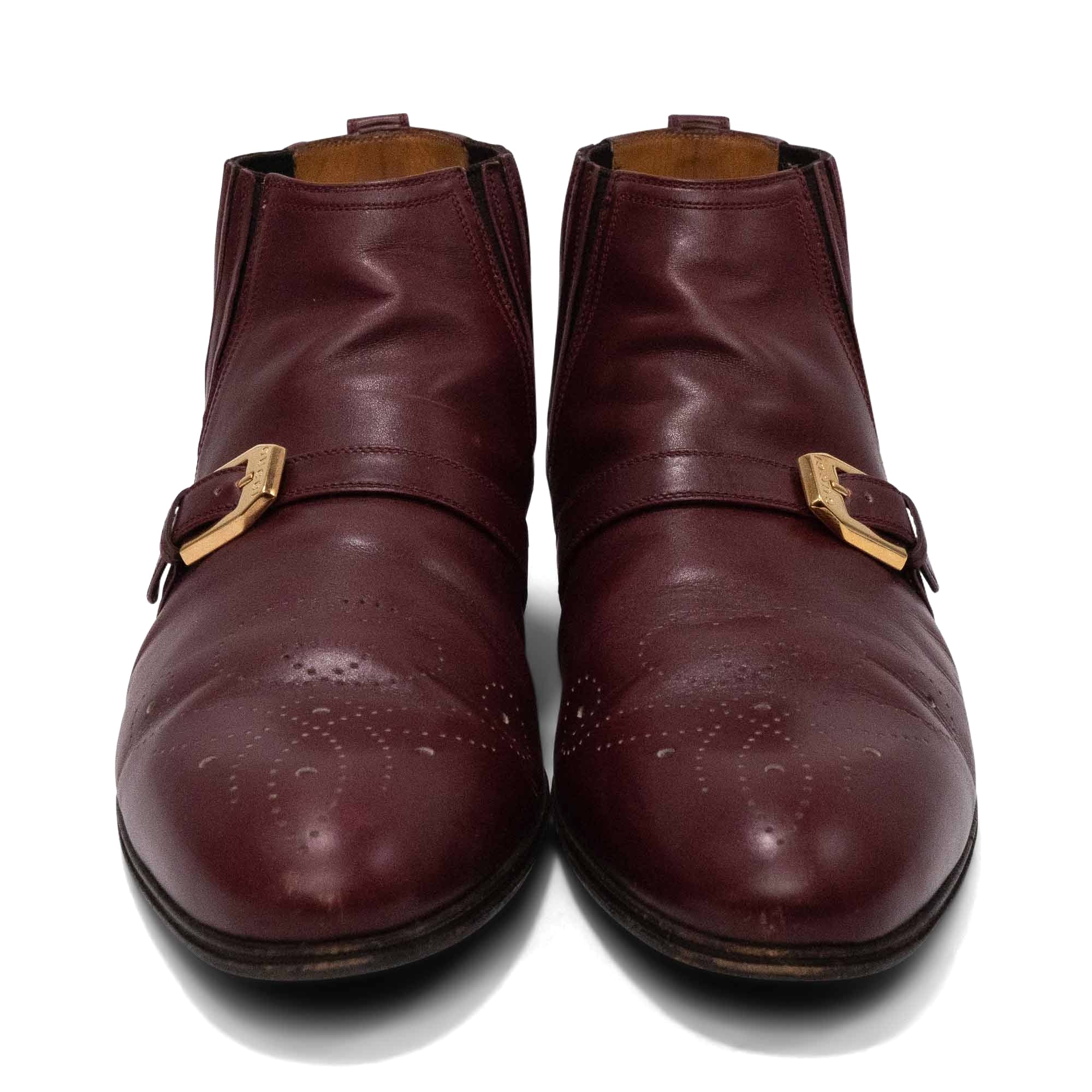 Gucci buckle ankle boots in oxblood leather. Features a strap across the vamp with a gold logo buckle, perforated detailing on almond toe, logo across back of heel, and covered elasticized gussets at sides.
