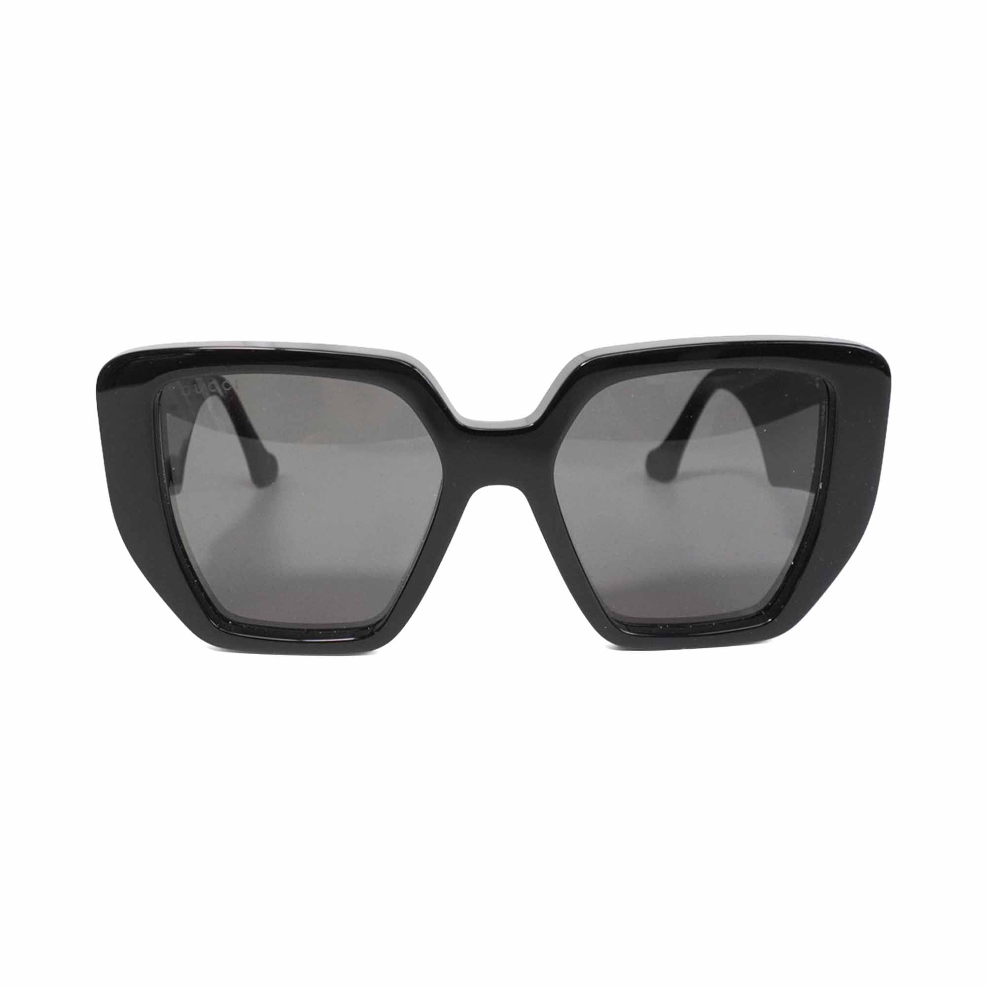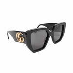 Gucci oversized sunglasses in black acetate with thick arms and a large gold 'GG' logo on the sides.