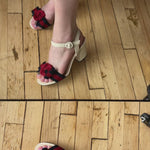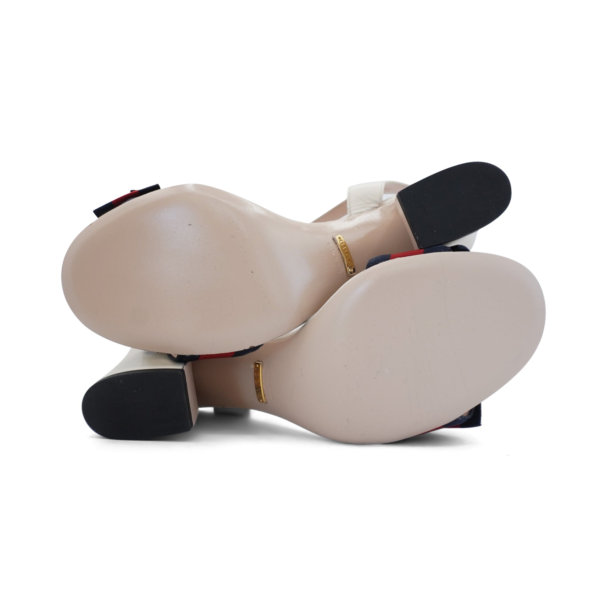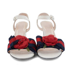 Gucci 'Rose Web' heeled sandals in cream leather with navy and red striped webbing toe strap featuring red flower applique.