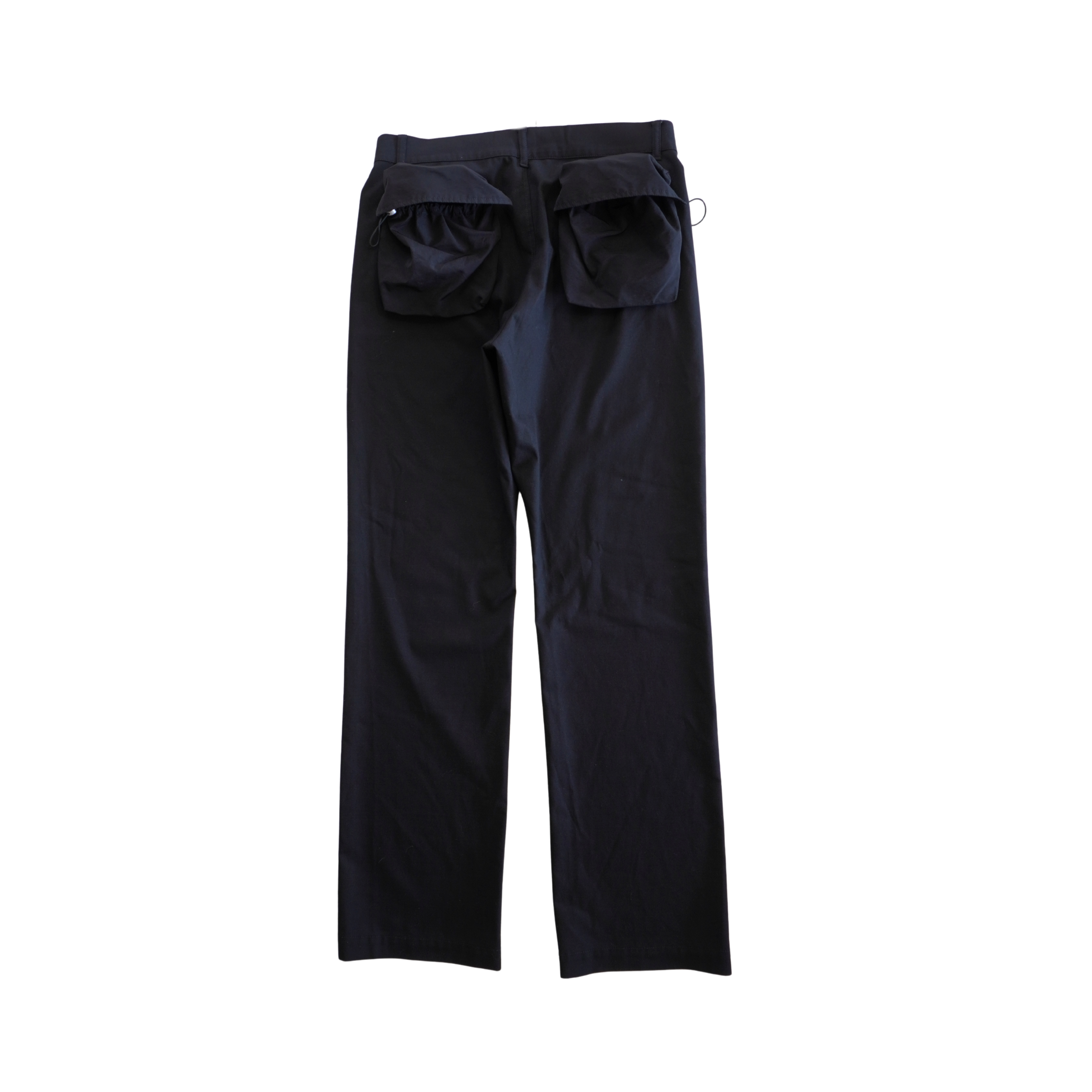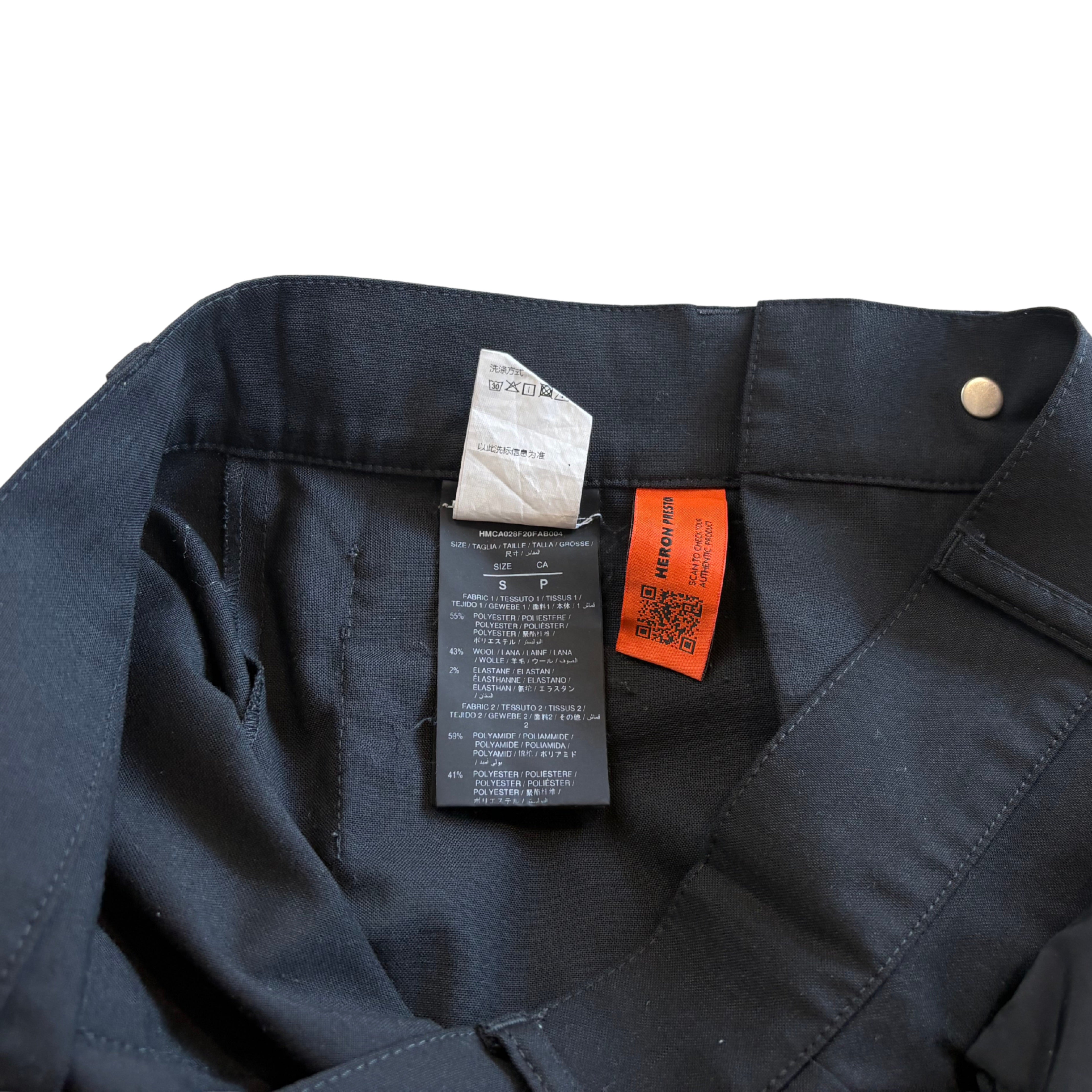 Heron Preston straight leg trousers in black wool with front and back drawstring cargo pockets, orange logo patch on the waistband and zip fly.
