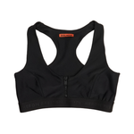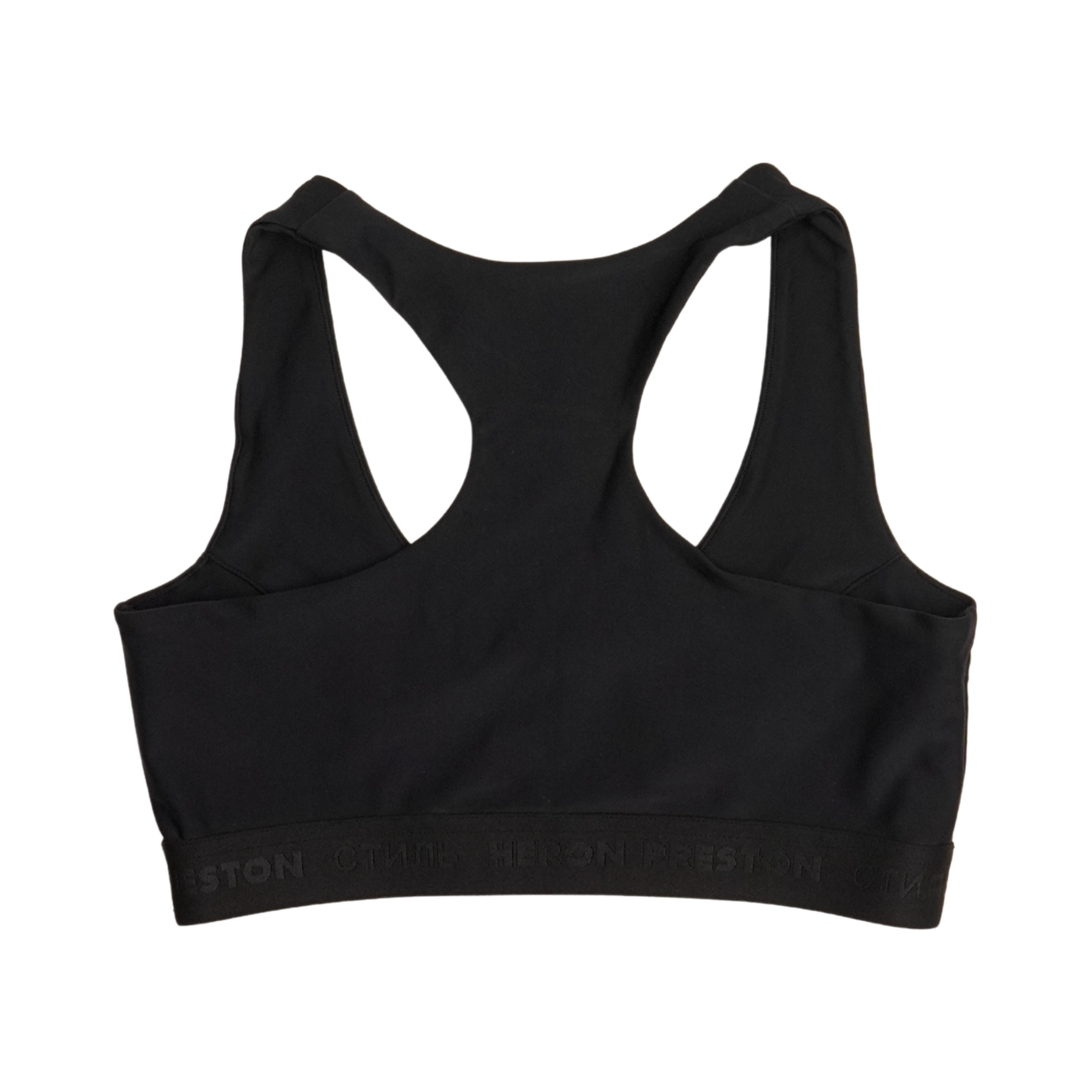 Heron Preston racerback, zip front sports bra in black stretch material with an elastic, monogram logo band around bottom.